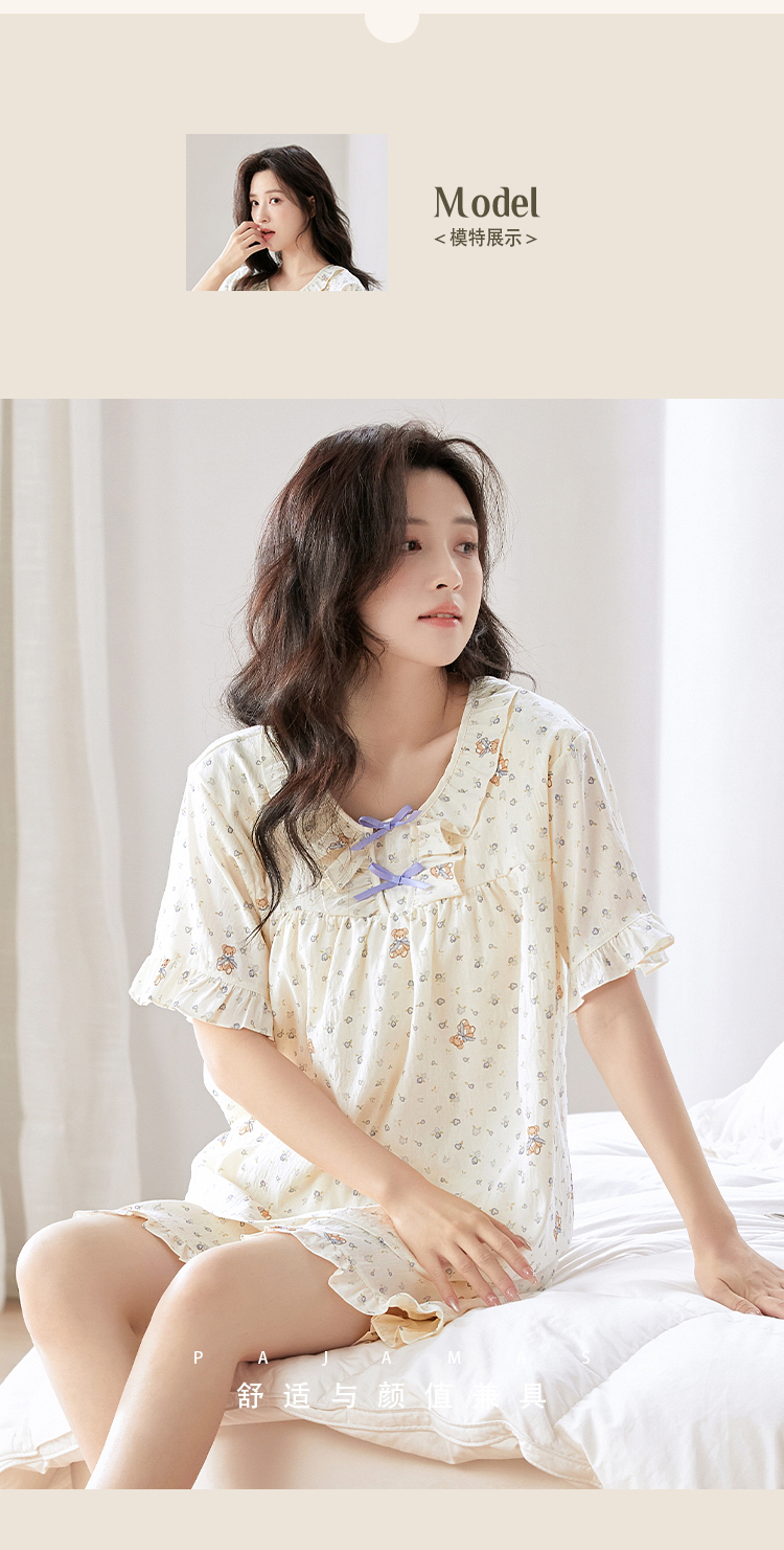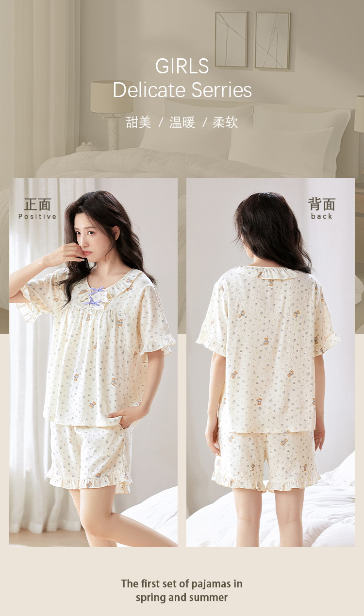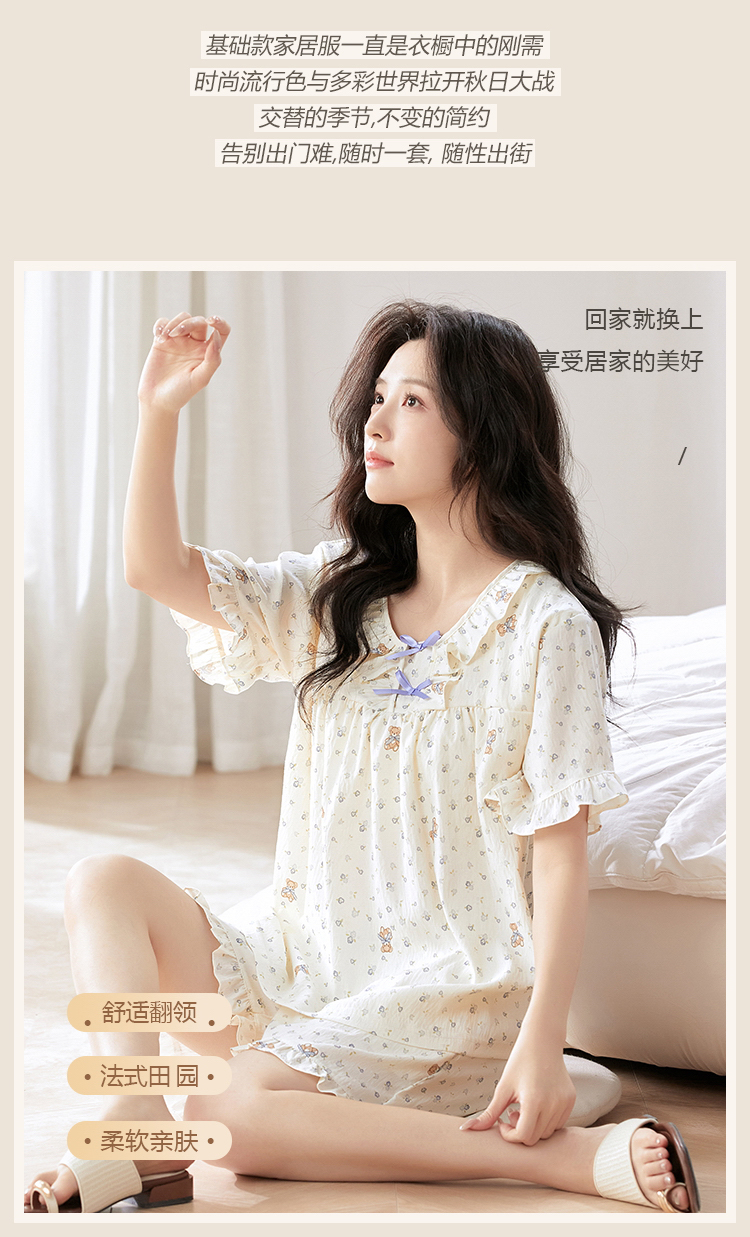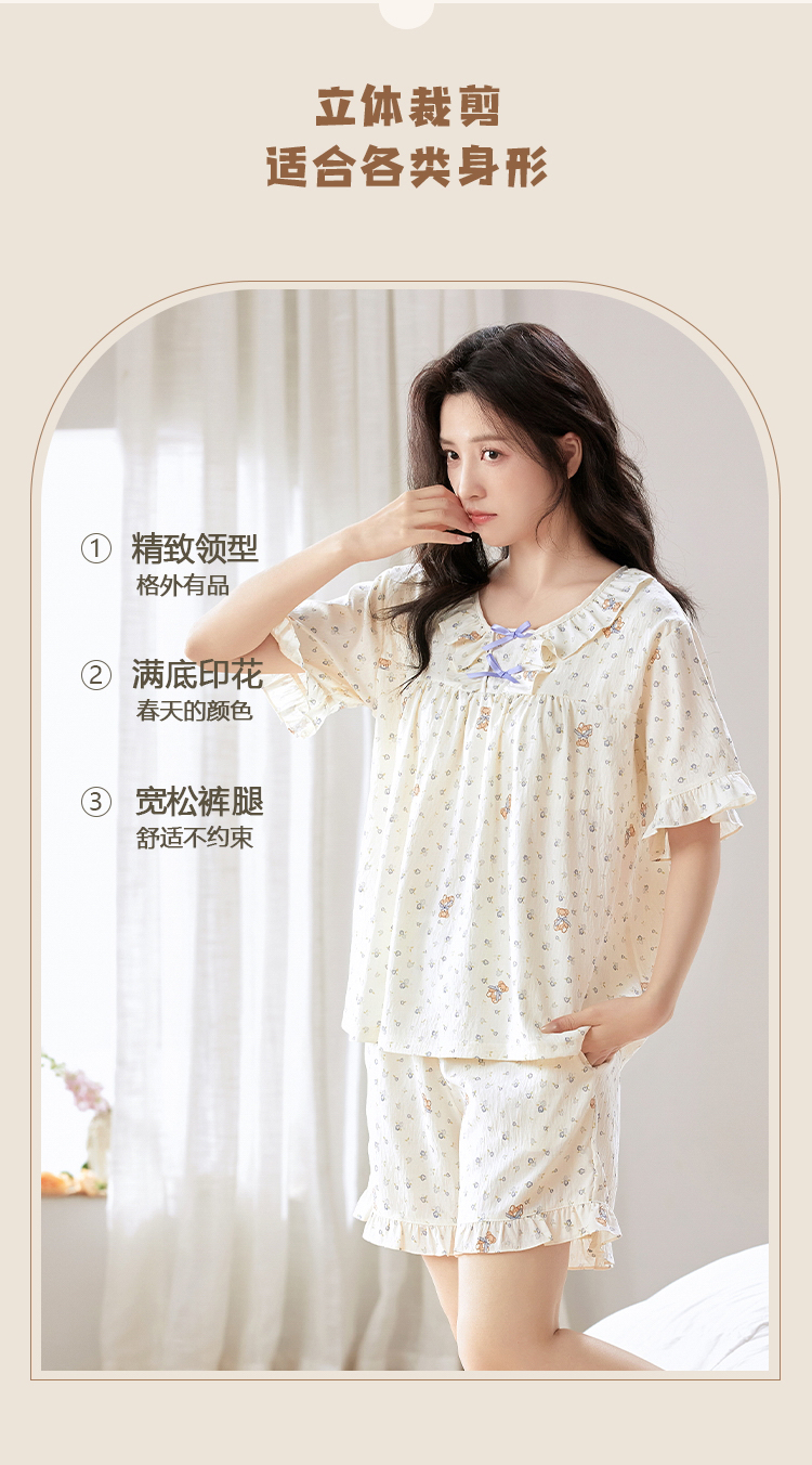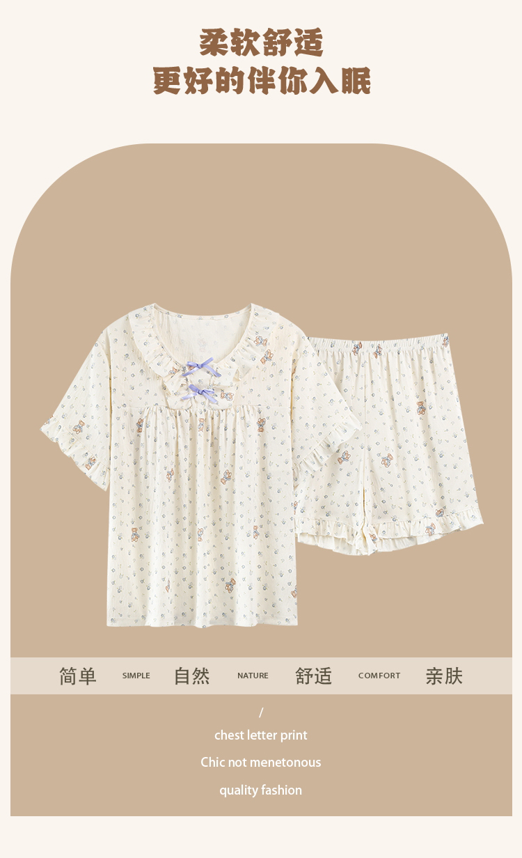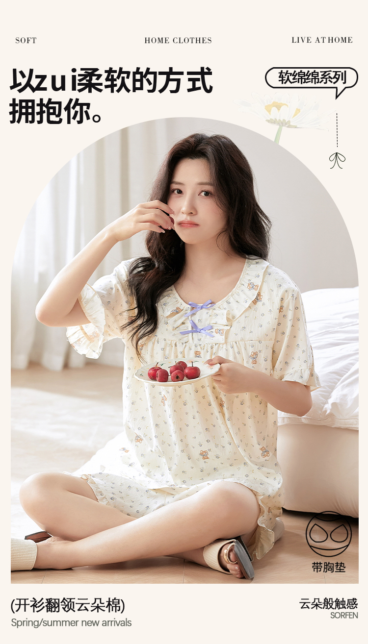 自然醒梵花云朵棉(带胸垫)睡衣女款夏季短袖短裤薄款花边甜美风女士家居服QH
