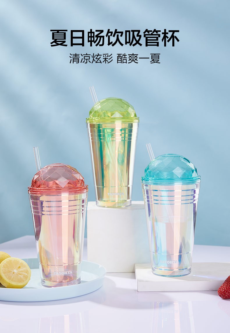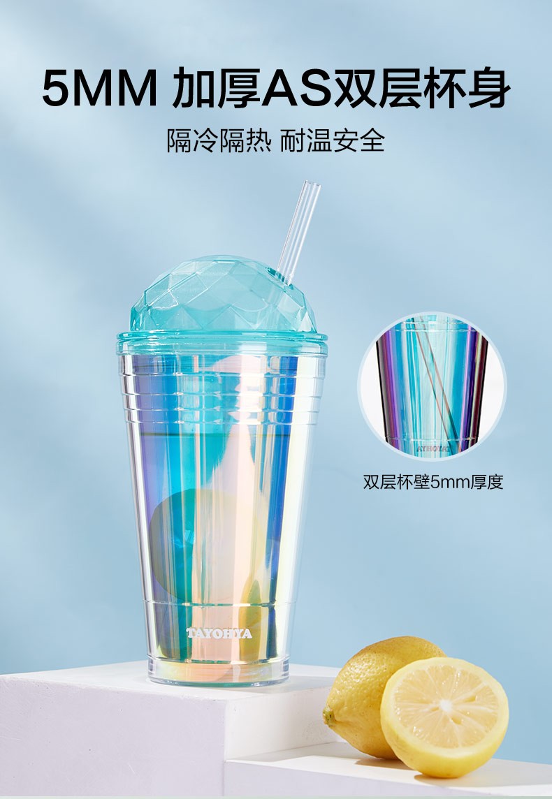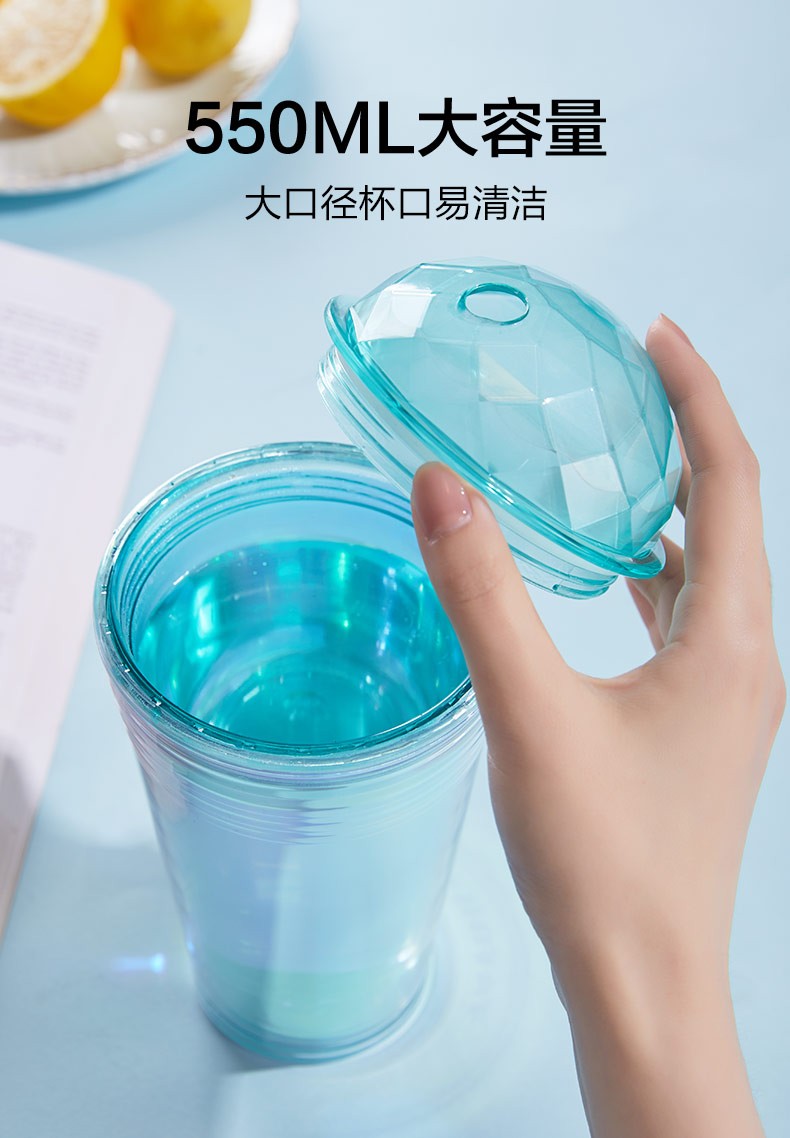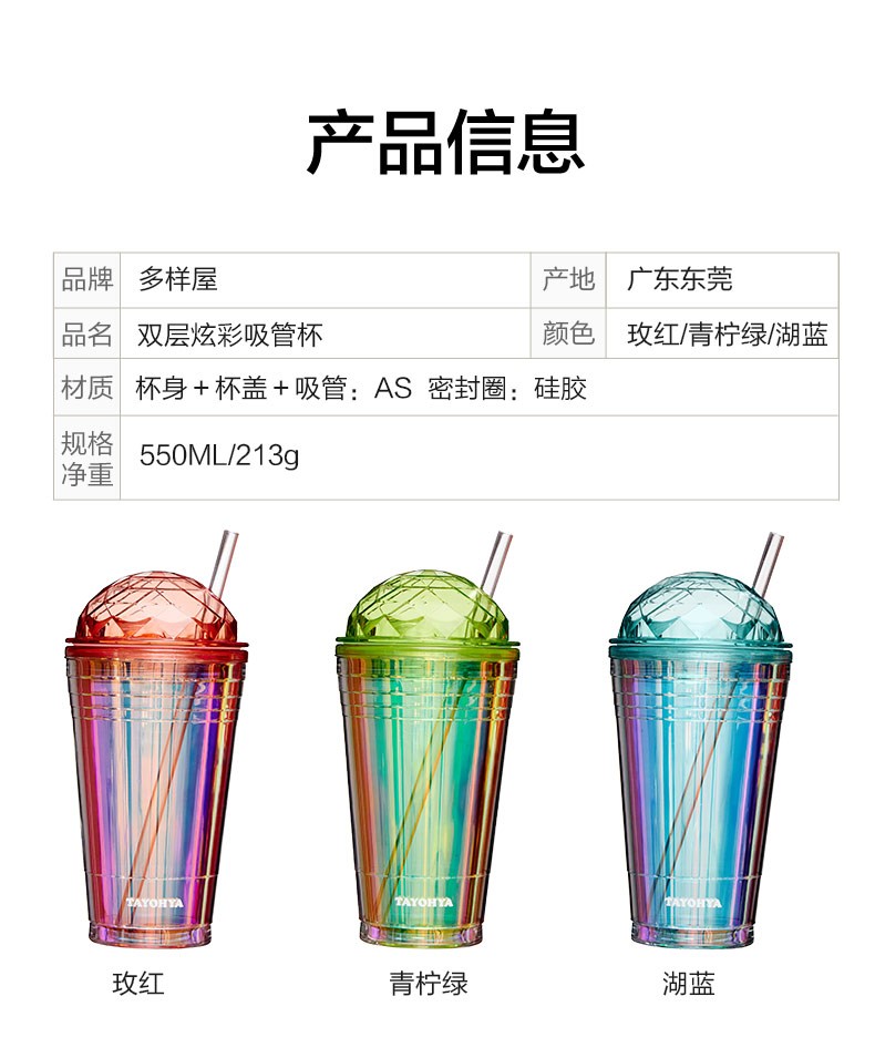【多样屋专柜】多样屋大容量双层塑料咖啡杯奶茶水杯 炫彩吸管杯-550ml-湖蓝