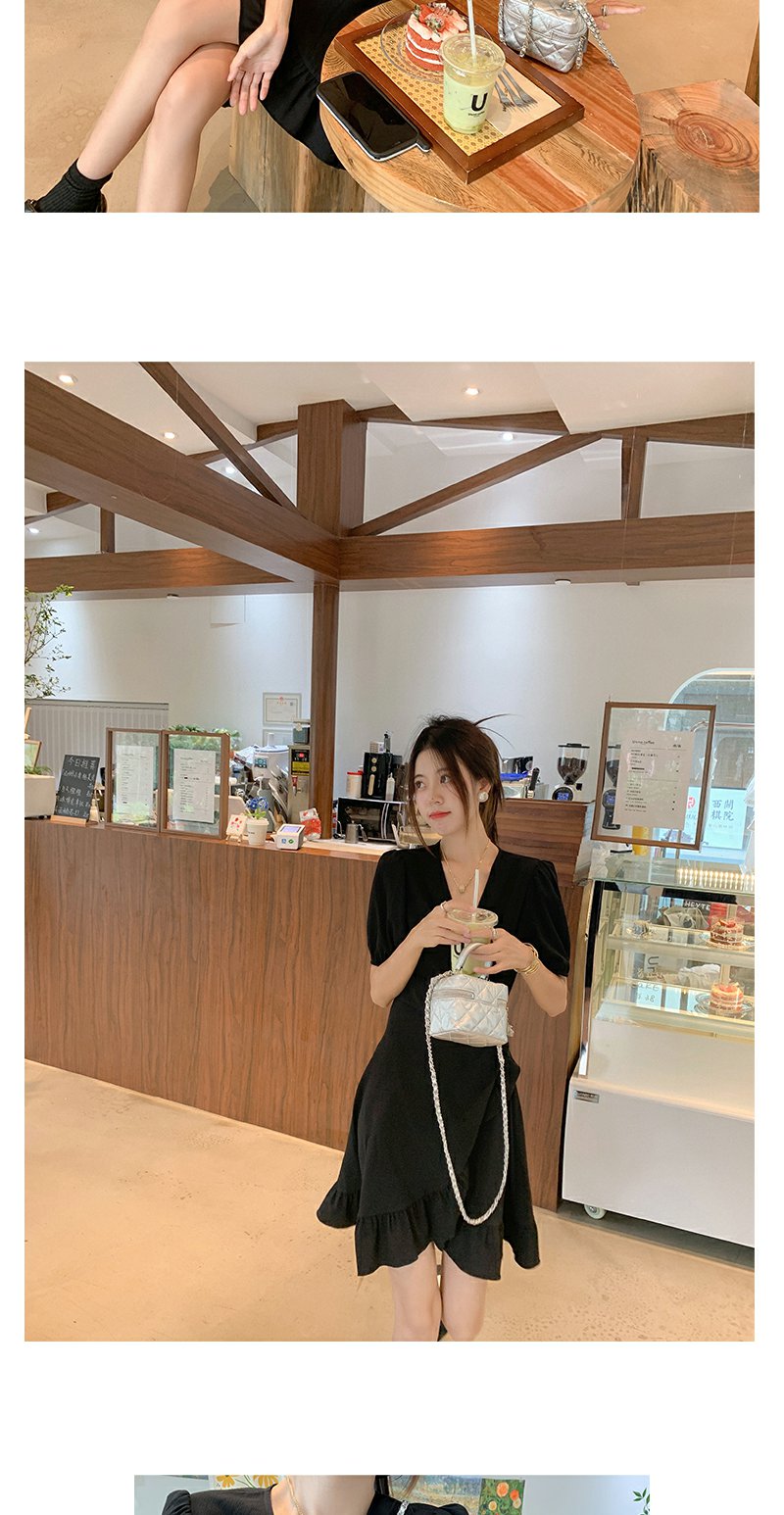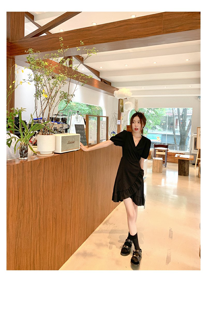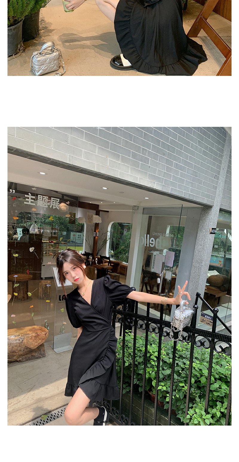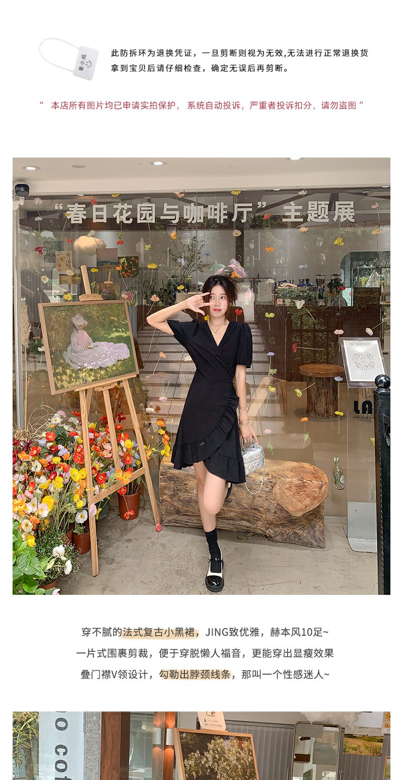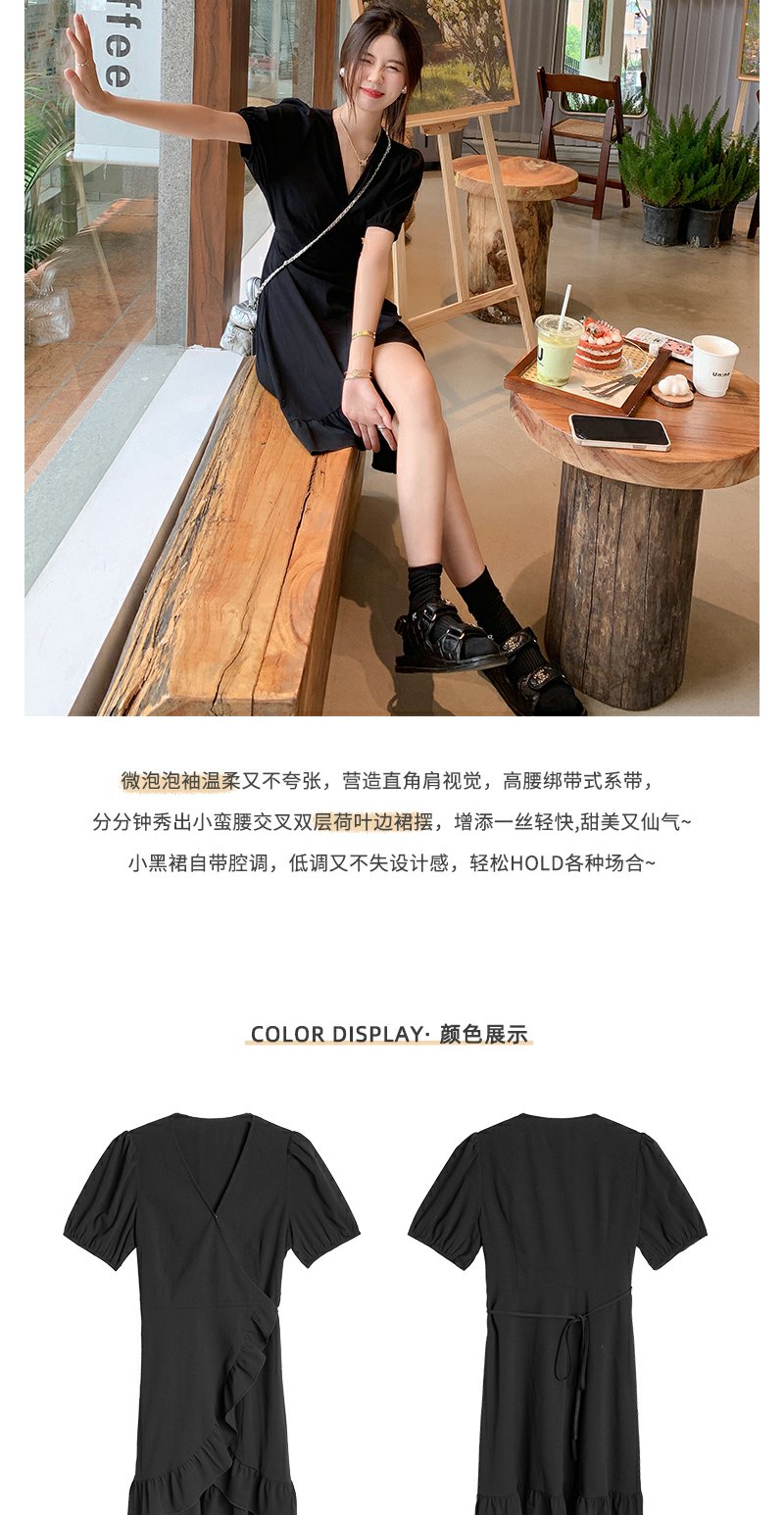 <曾小咸推荐> 连衣裙V领荷叶边中长款气质小黑裙潮