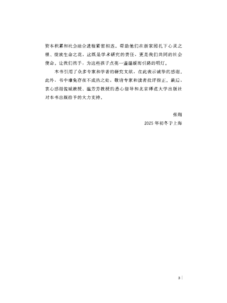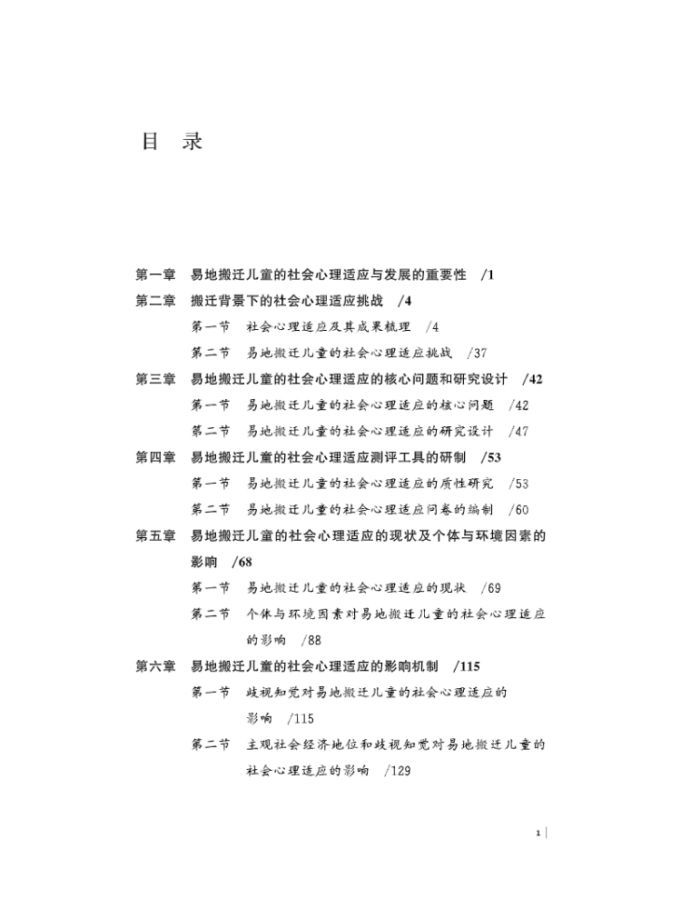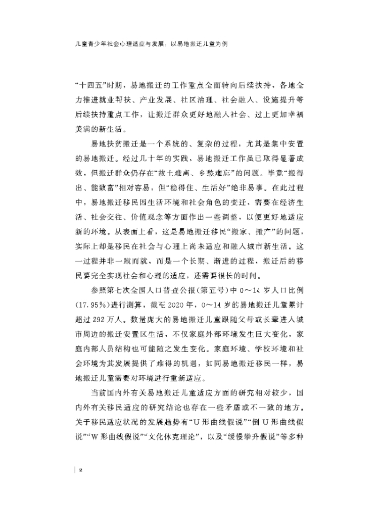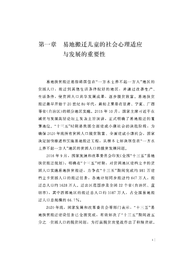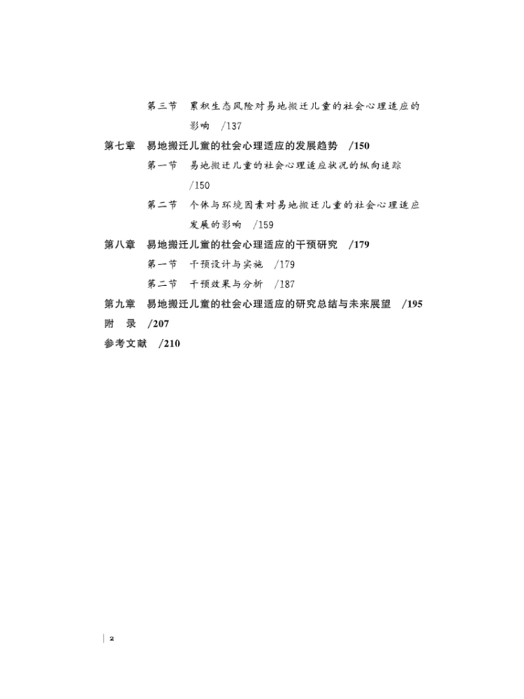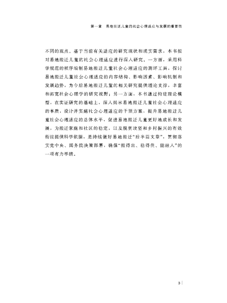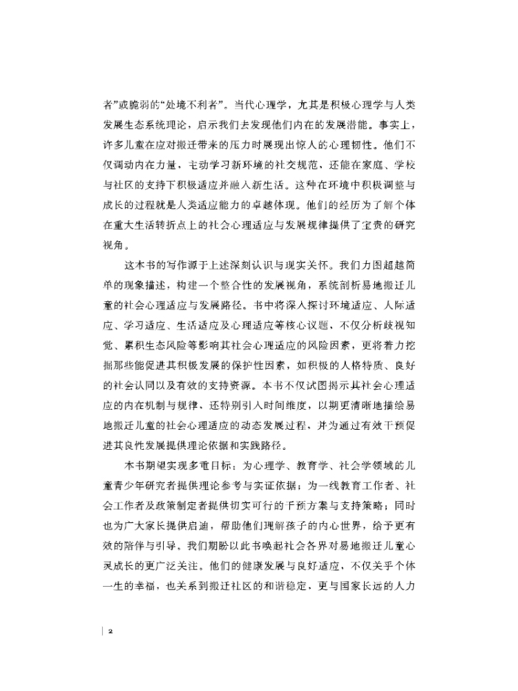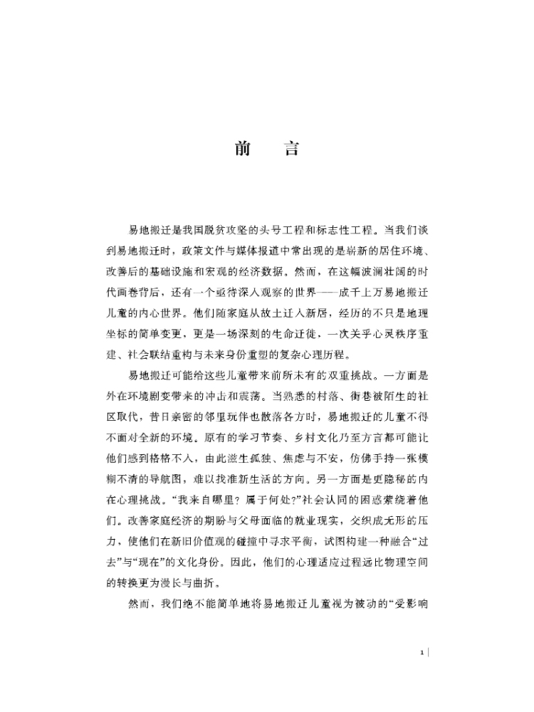 本书聚焦国家重大战略背景下易地搬迁儿童这一特殊群体,以其社会心理适应与发展为核心议题。易地搬迁不仅是地理空间的转换,更是青少年社会生活与心理世界的深刻重构。本书依托扎实的实证研究与前沿理论视角,系统深入考察了易地搬迁儿童社会心理适应的内容结构、影响因素、作用机制、发展趋势以及促进效果,不仅构建了易地搬迁儿童社会心理适应的"因素一过程”动态整合模型,更着力实践了促进其积极适应和良好发展的系统性支持方案,对于丰富心理学的研究成果,以及优化社会政策、推动个体全面发展具有一定的学术价值与现实意义。本书旨在为关注青少年发展、社会工作及教育政策的研究者与实践者提供有益的参考。