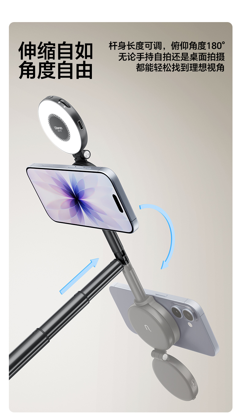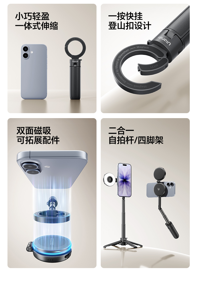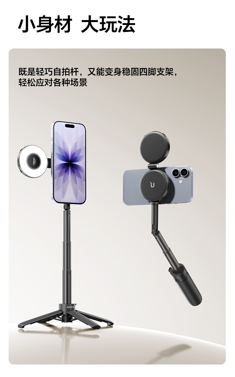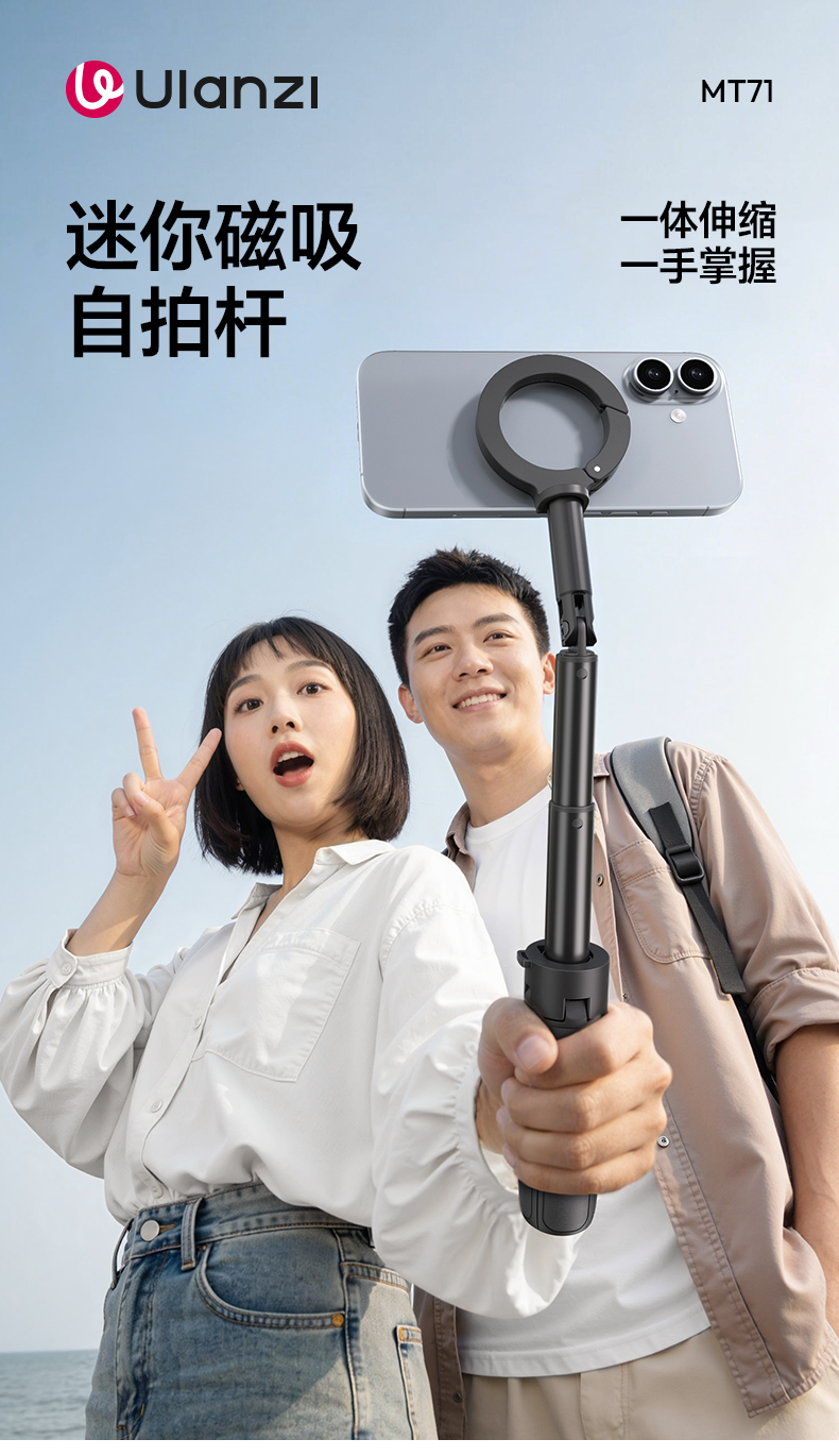 Ulanzi优篮子 MT71迷你磁吸手机自拍杆支架适用苹果17桌面支撑架安卓户外手持vlog拍摄神器旅游便携三脚架