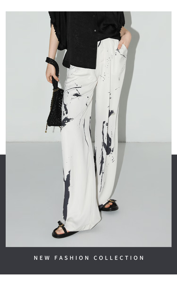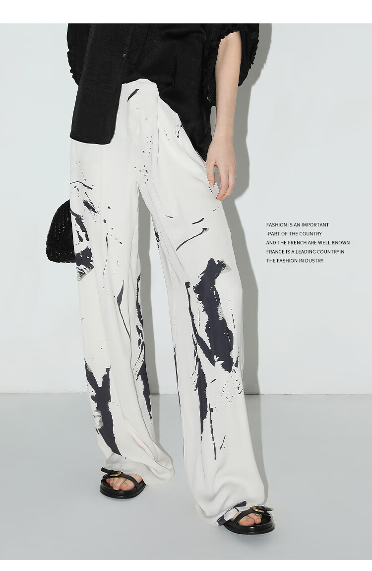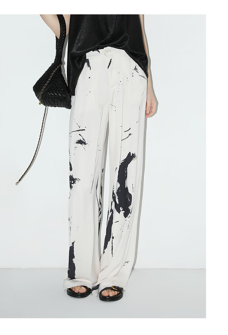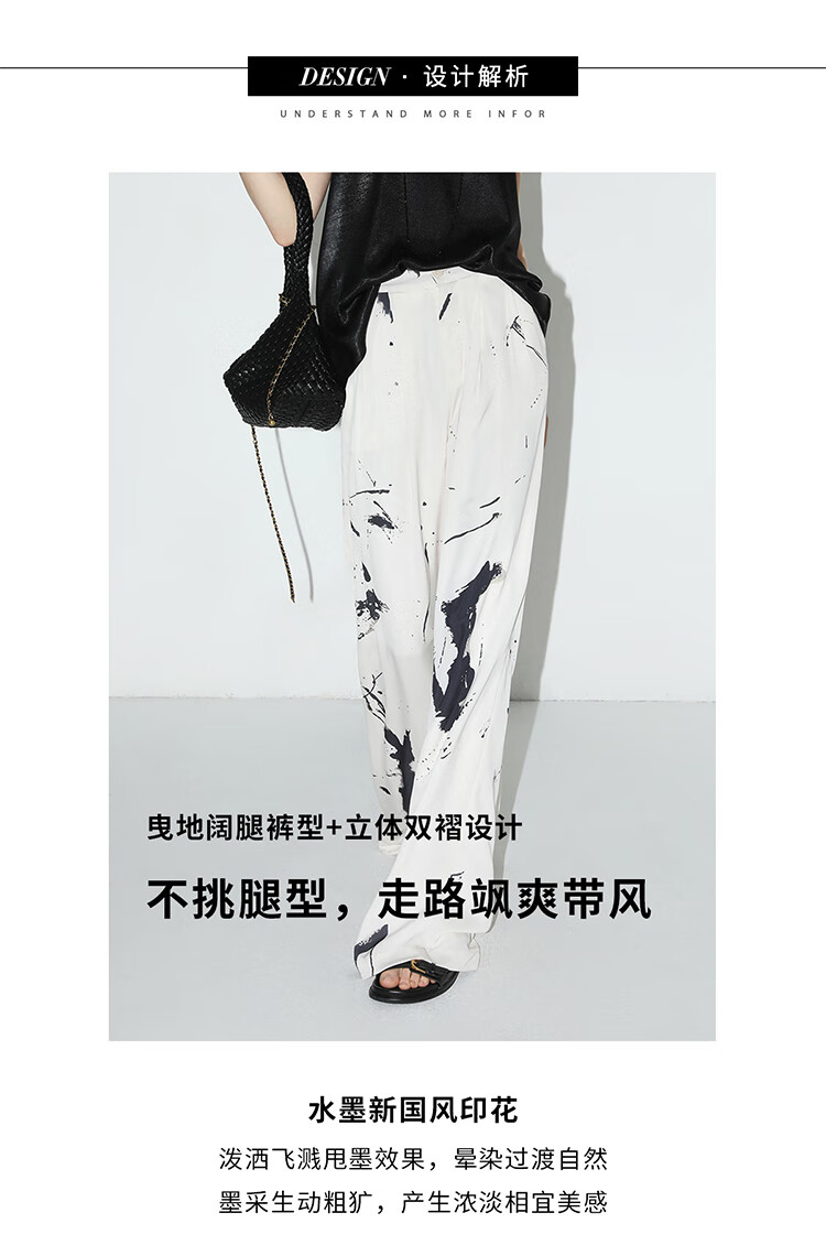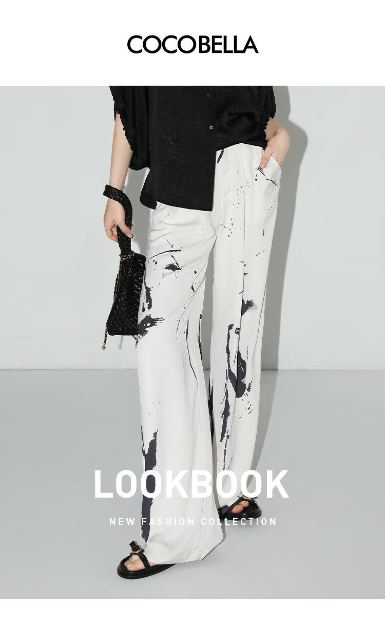 COCOBELLA国风水墨晕染休闲阔腿裤宽松垂坠打褶直筒裤PA3035