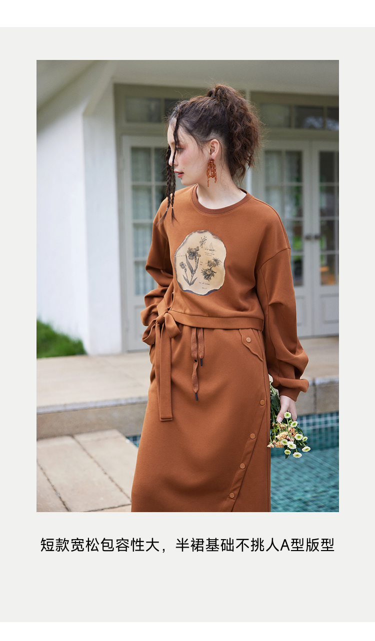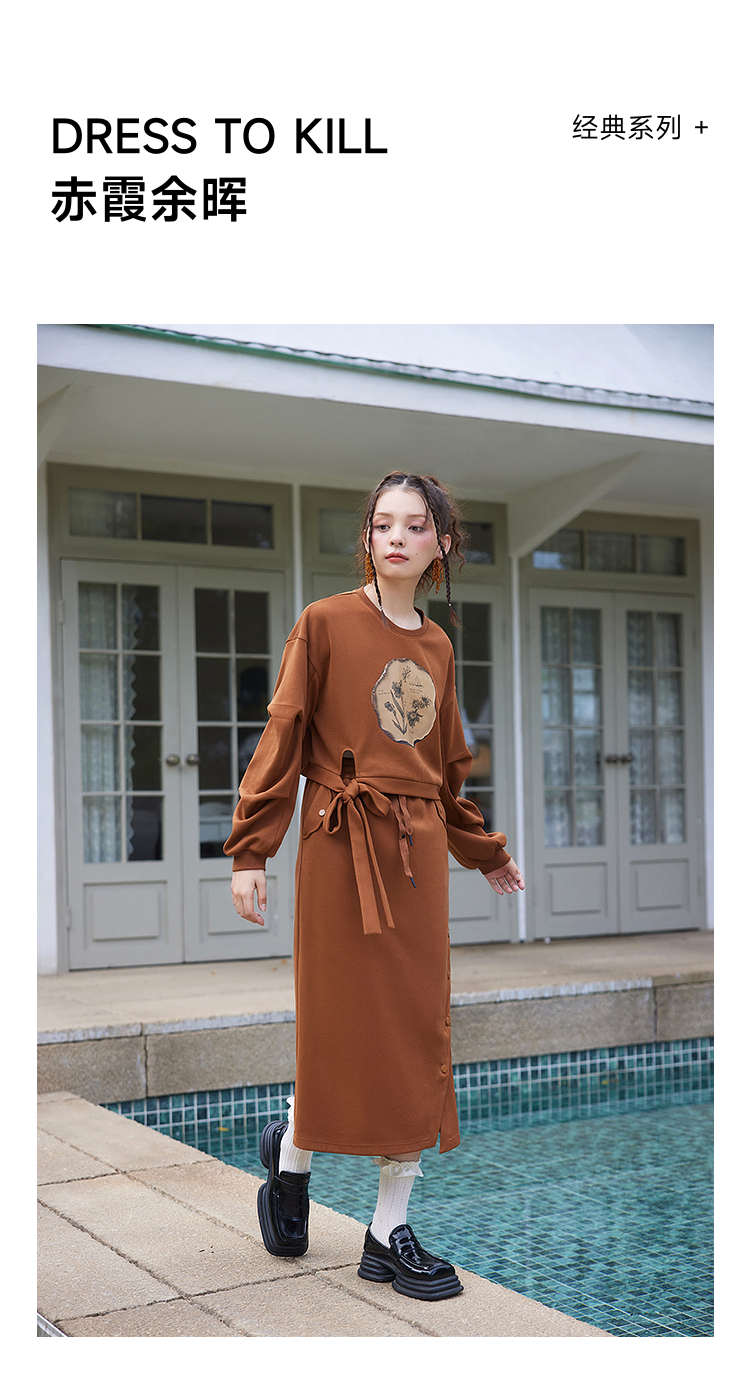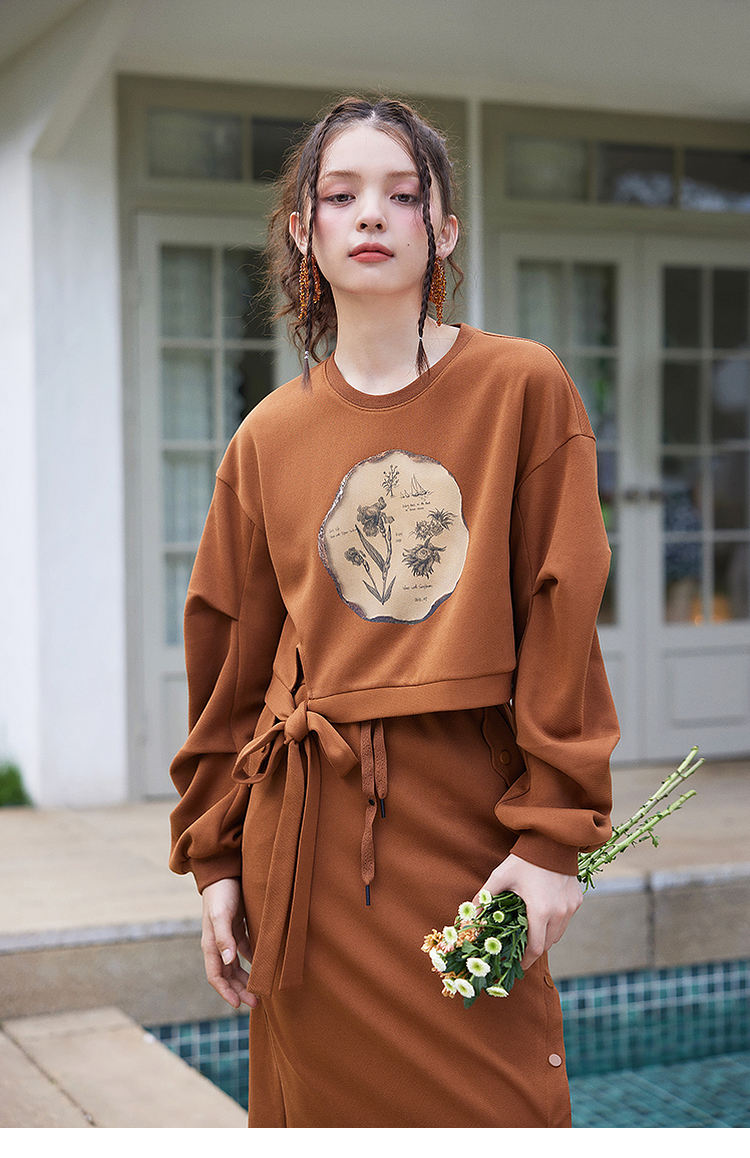 两三事赤霞余晖 2023秋季新款复古文艺印花图案绑带设计卫衣套装