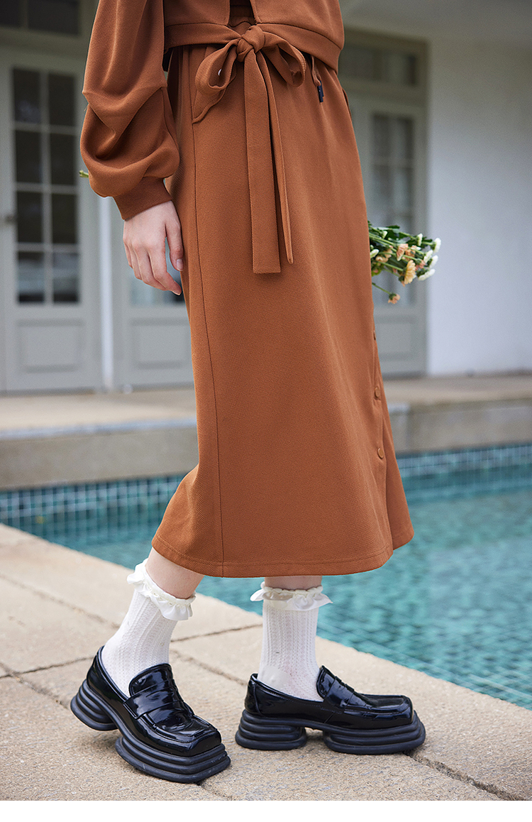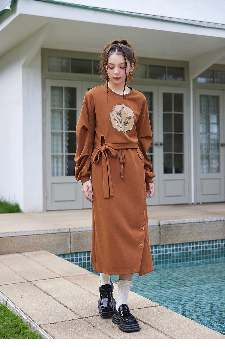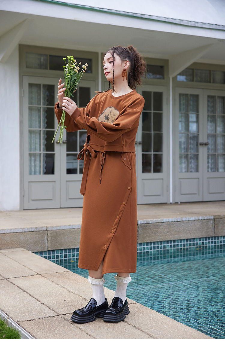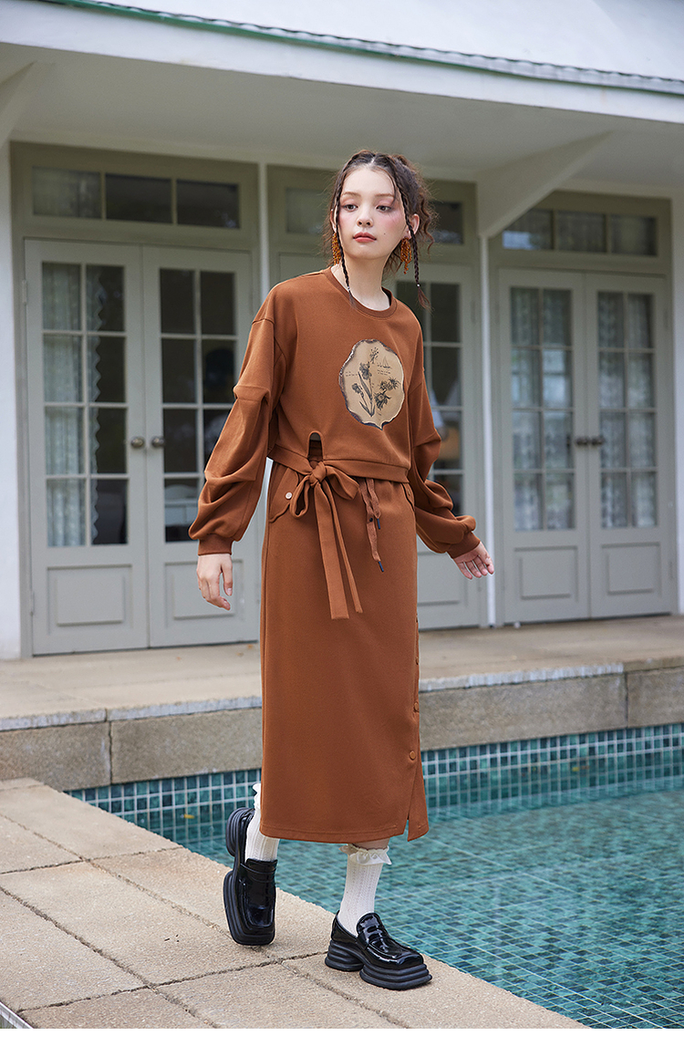 两三事赤霞余晖 2023秋季新款复古文艺印花图案绑带设计卫衣套装