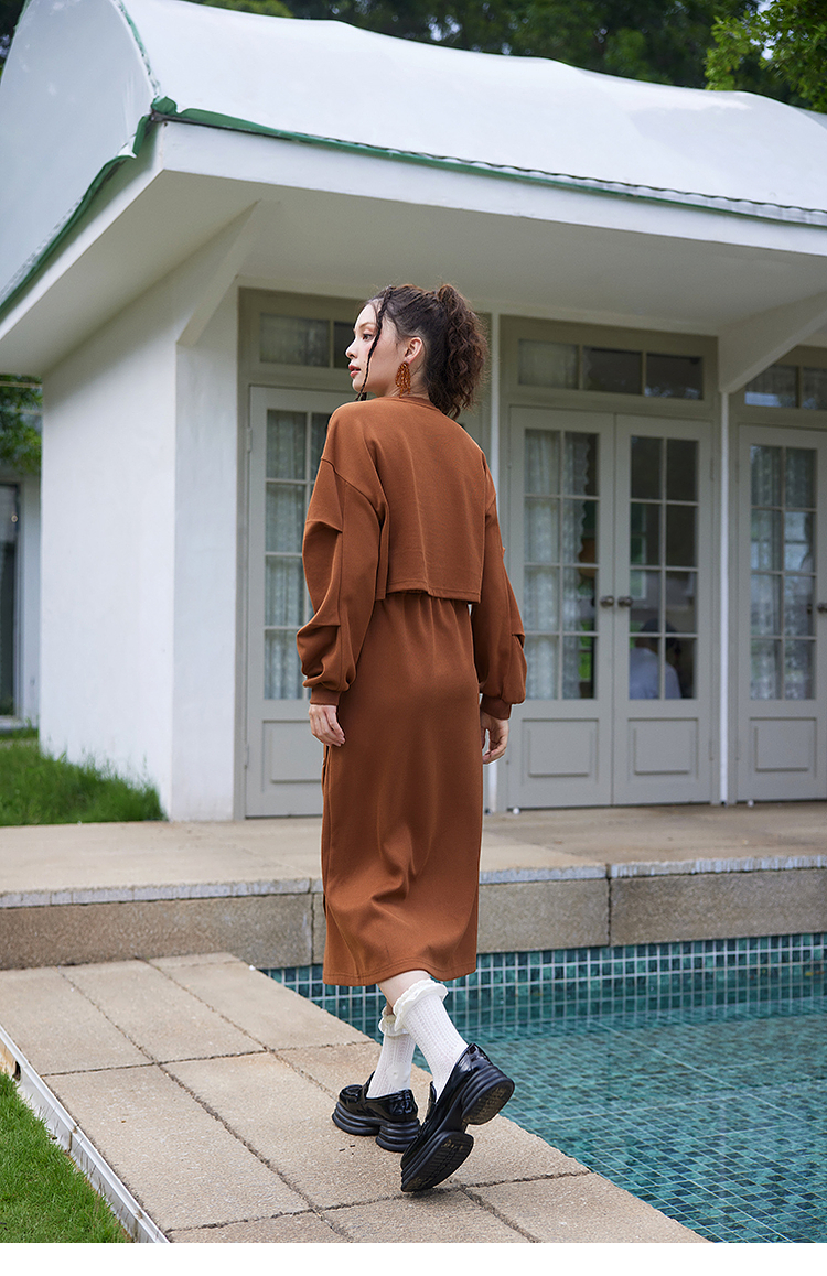 两三事自在如风 春季新款复古公主袖褶皱v领两件套连衣裙长裙