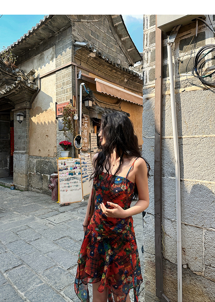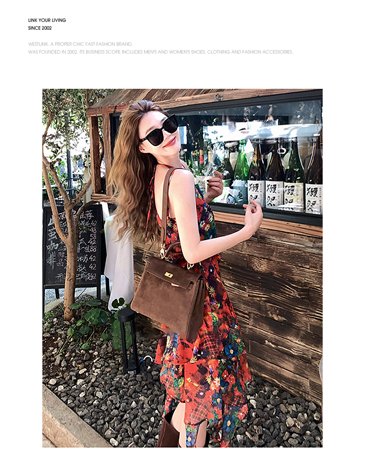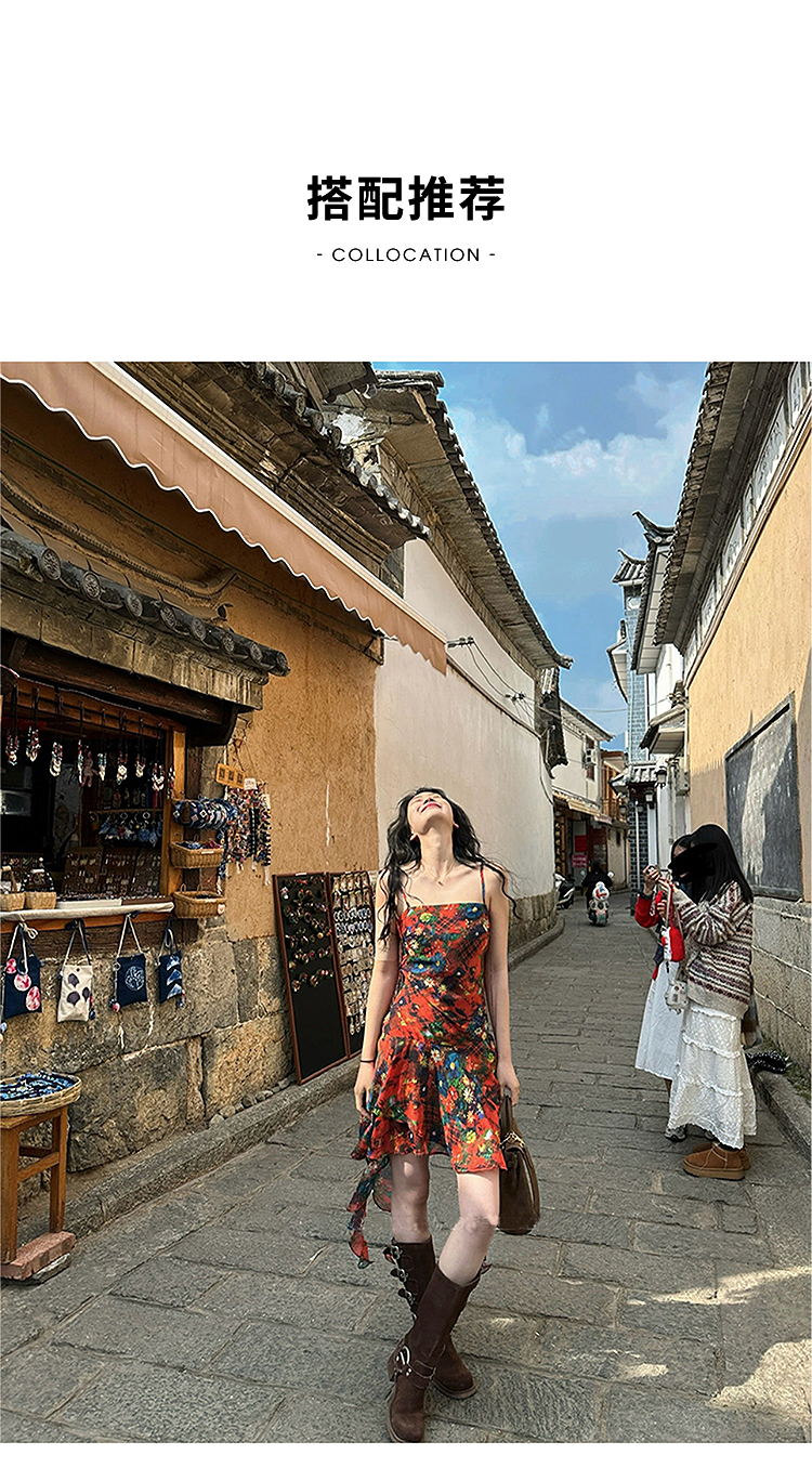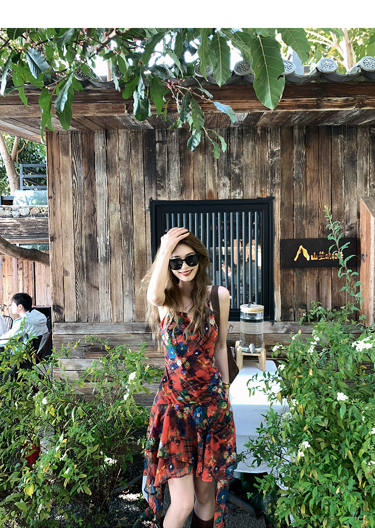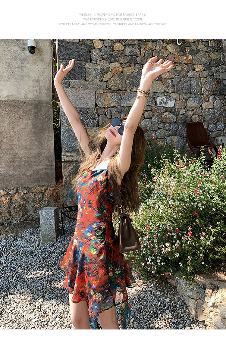西遇出游吊带裙女夏季新款海边度假风收腰印花连衣裙SS050575