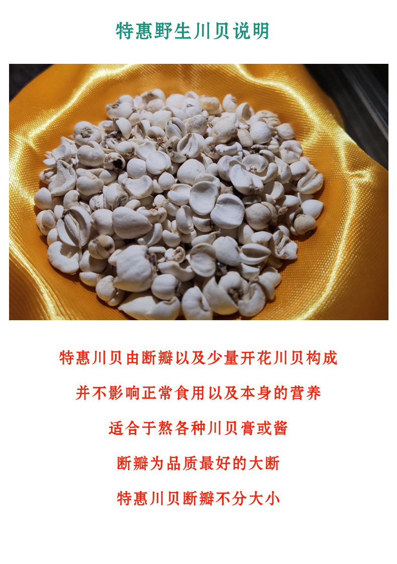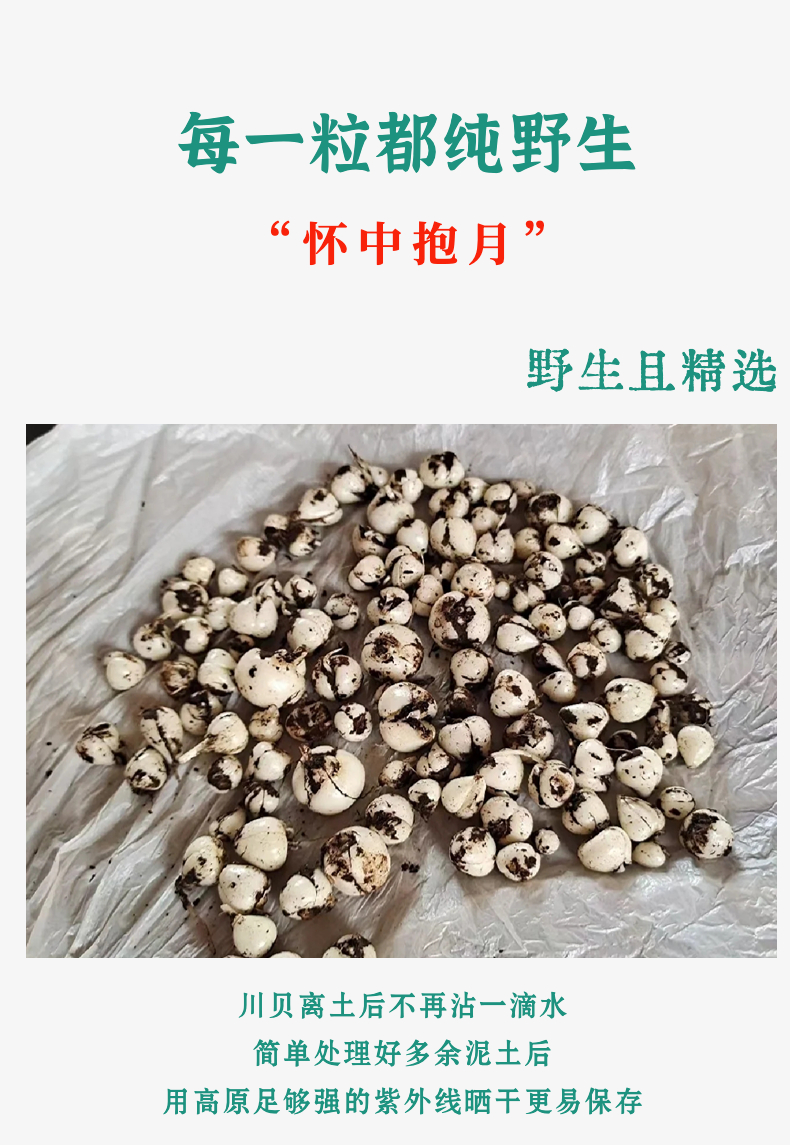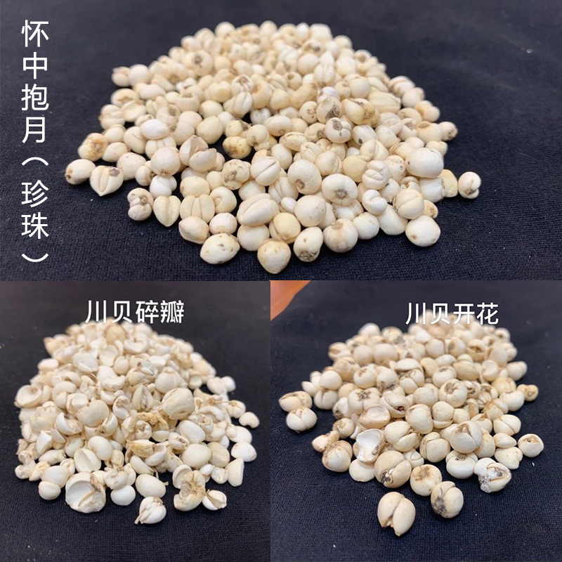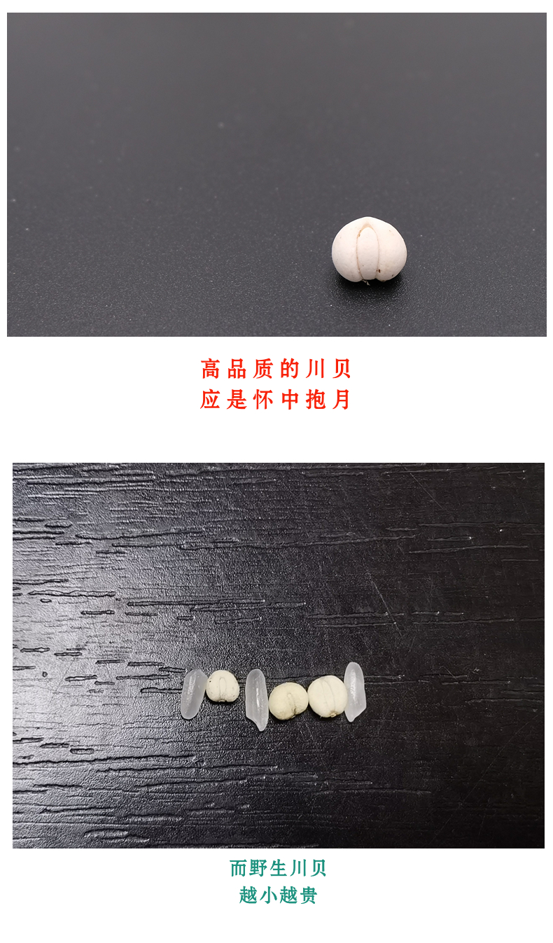 最直接的区别为川贝“怀中抱月”中间的月亮!野生川贝的月亮可以掰下来,而人工的不行。