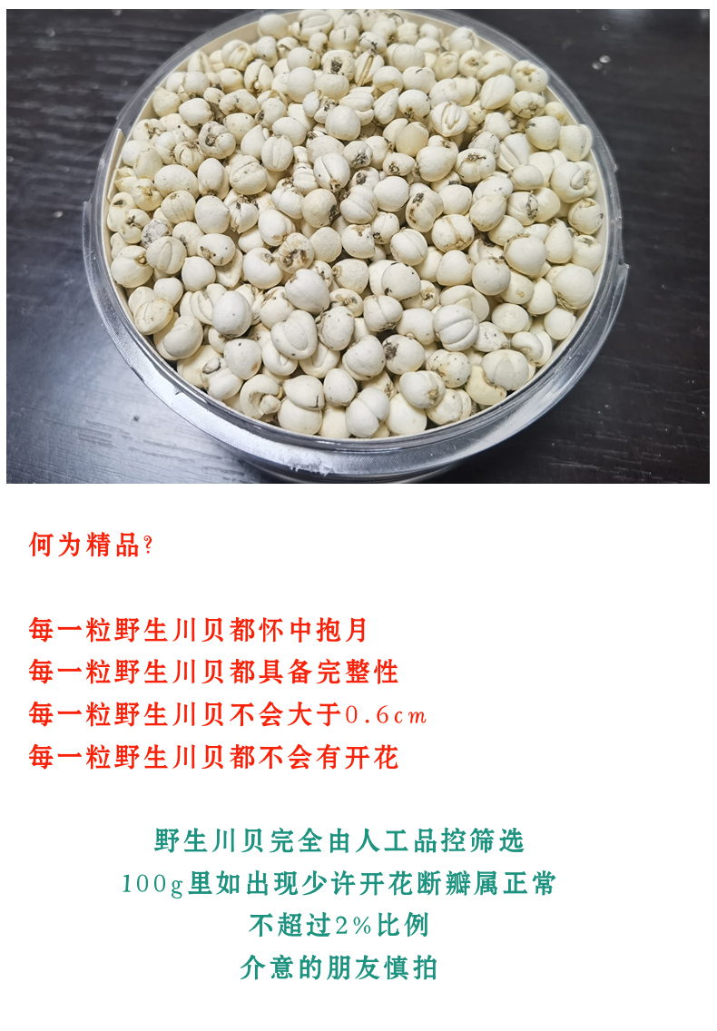 【温馨提示】我们的野生川贝全部人工手工挑选,百分之65-70的松贝,百分之35-30的暗紫贝母,介意慎拍哦~