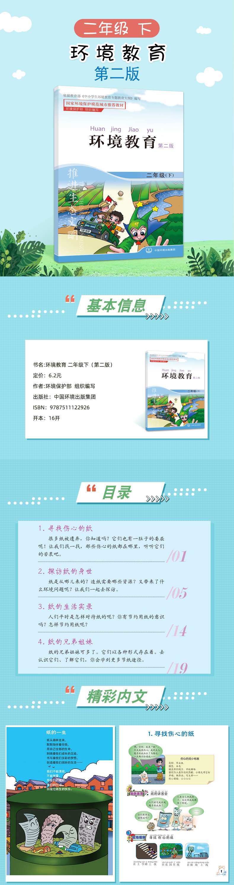 环境教育 第二版 二年级下 环境科普读物(环保模范城市教材) 环境保护 中国环境出版社 9787511122926