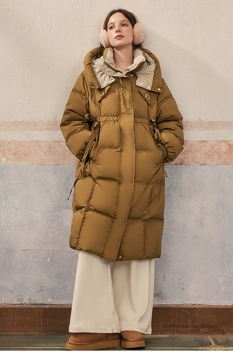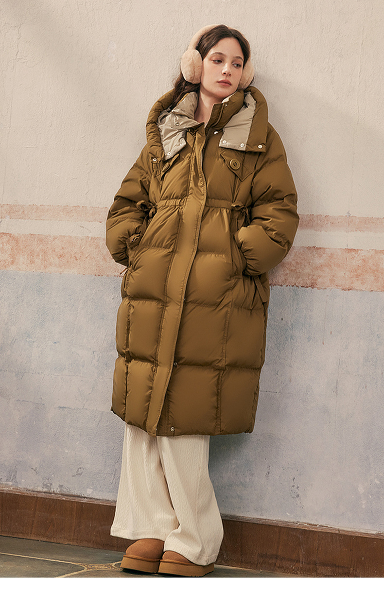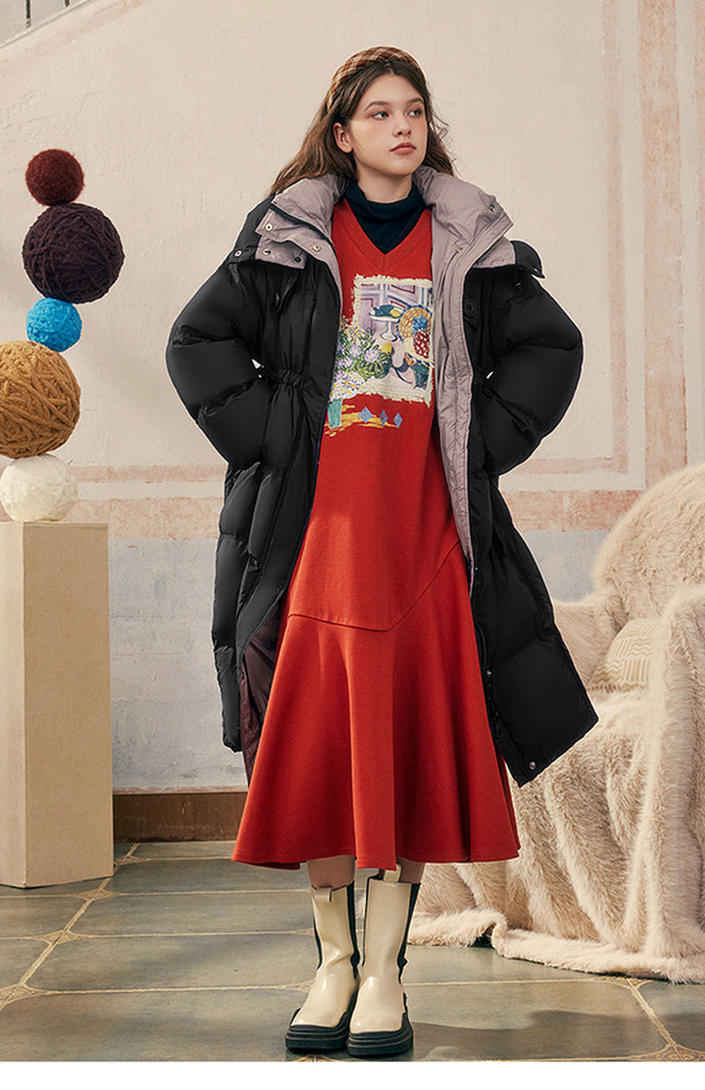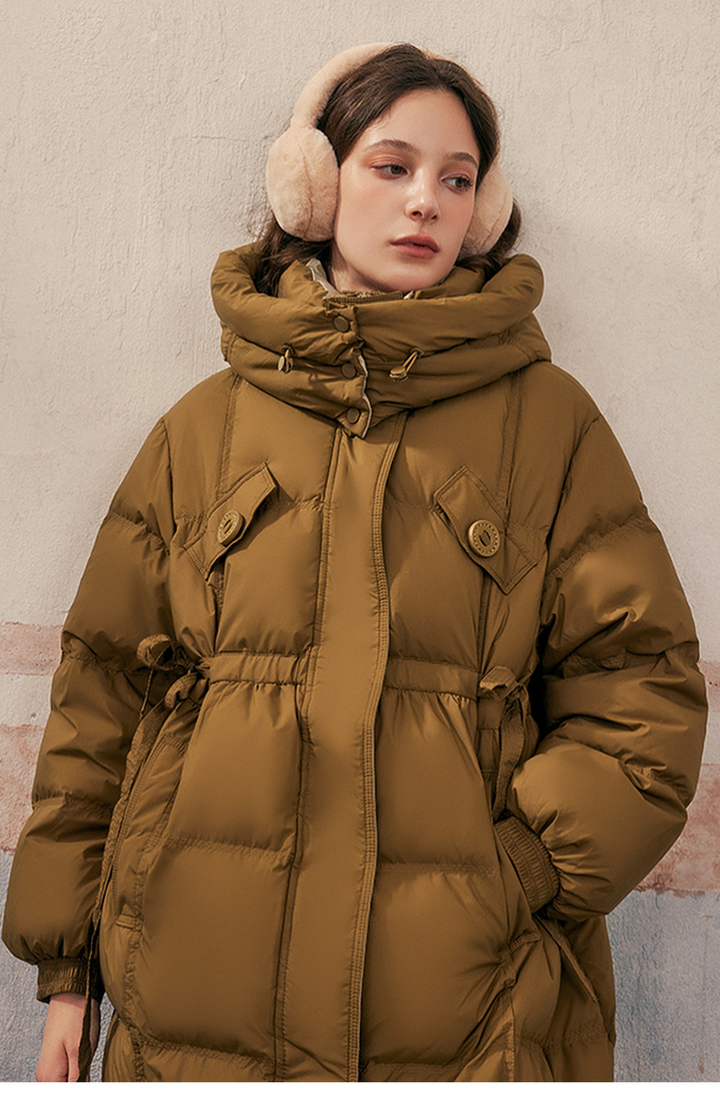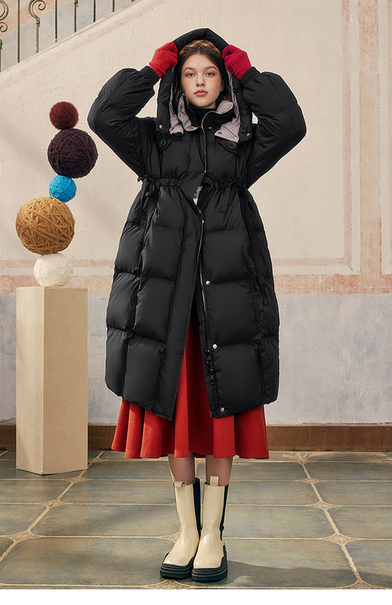 【暖冬内购】两三事冬日来意2024冬季新款时尚拼色抽绳绑带连帽羽绒服外套女