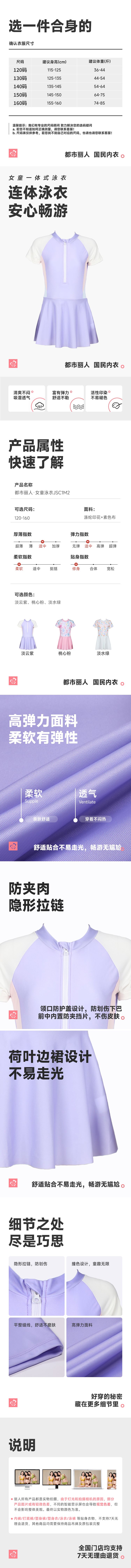 都市丽人女童泳衣涤纶印花+素色布女童一体式泳衣JSC1M2