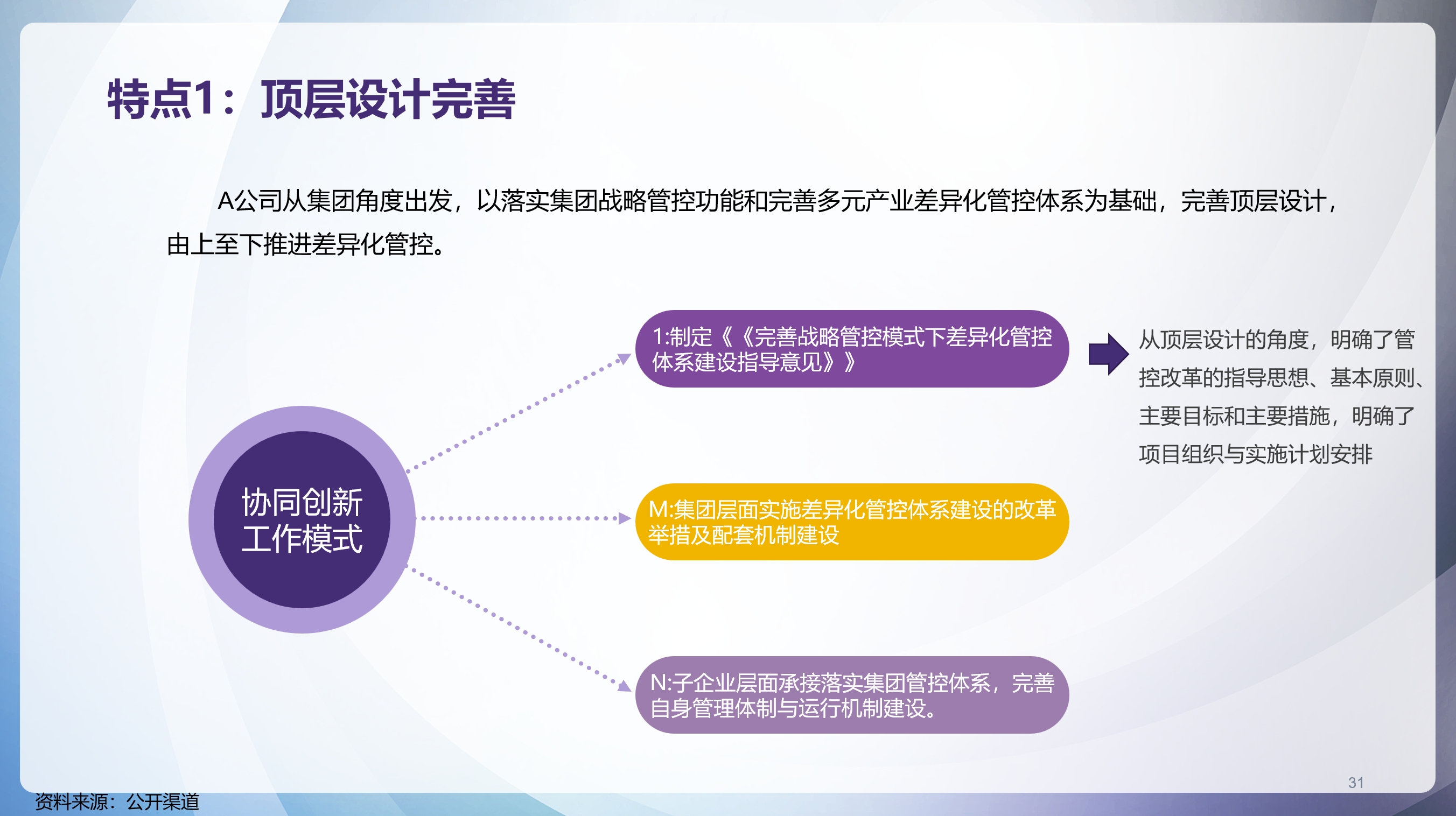 从改革举措看,A钢铁集团有限公司从集团角度出发,以落实集团战略管控功能和完善多元产业差异化管控体系为基础,完善顶层设计,由上至下推进差异化管控,对子企业开展分类监管、分类管控。
