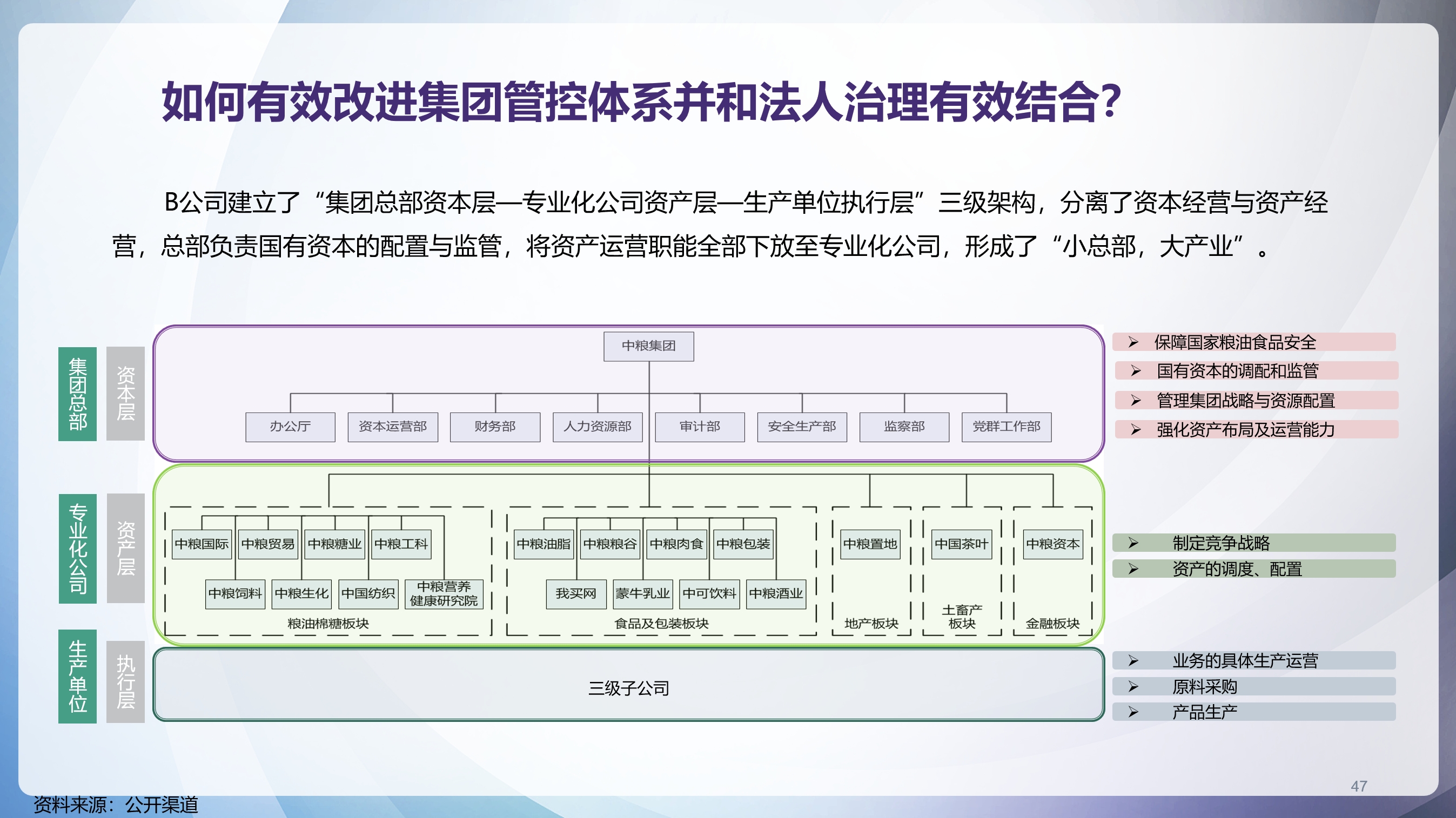 B粮食集团有限公司通过制定授权清单,将下属专业化公司进行分类,实施分类授权,从多个方面进行差异化管控。