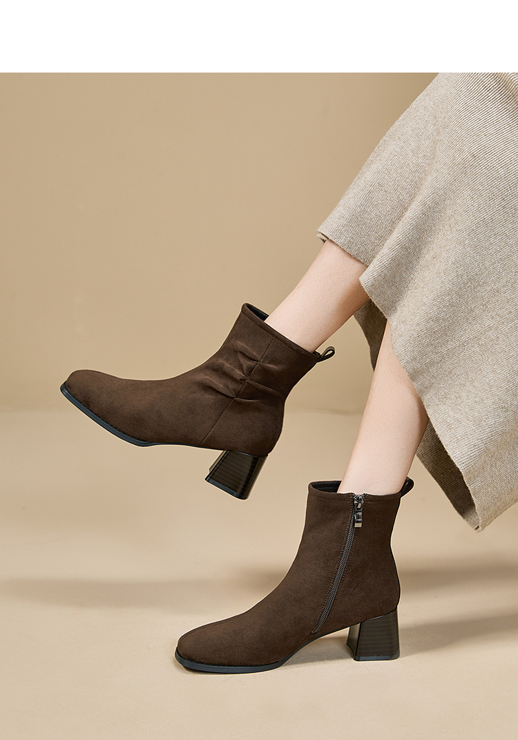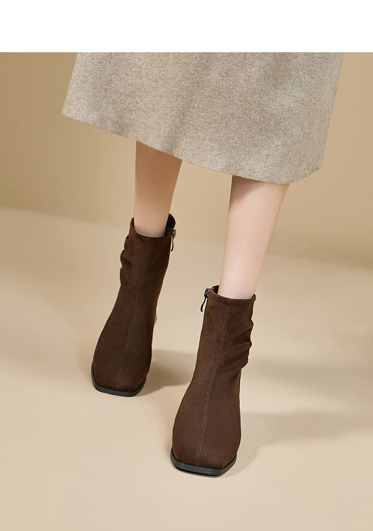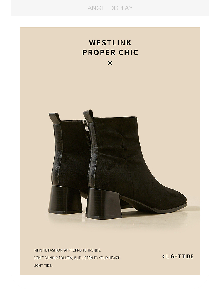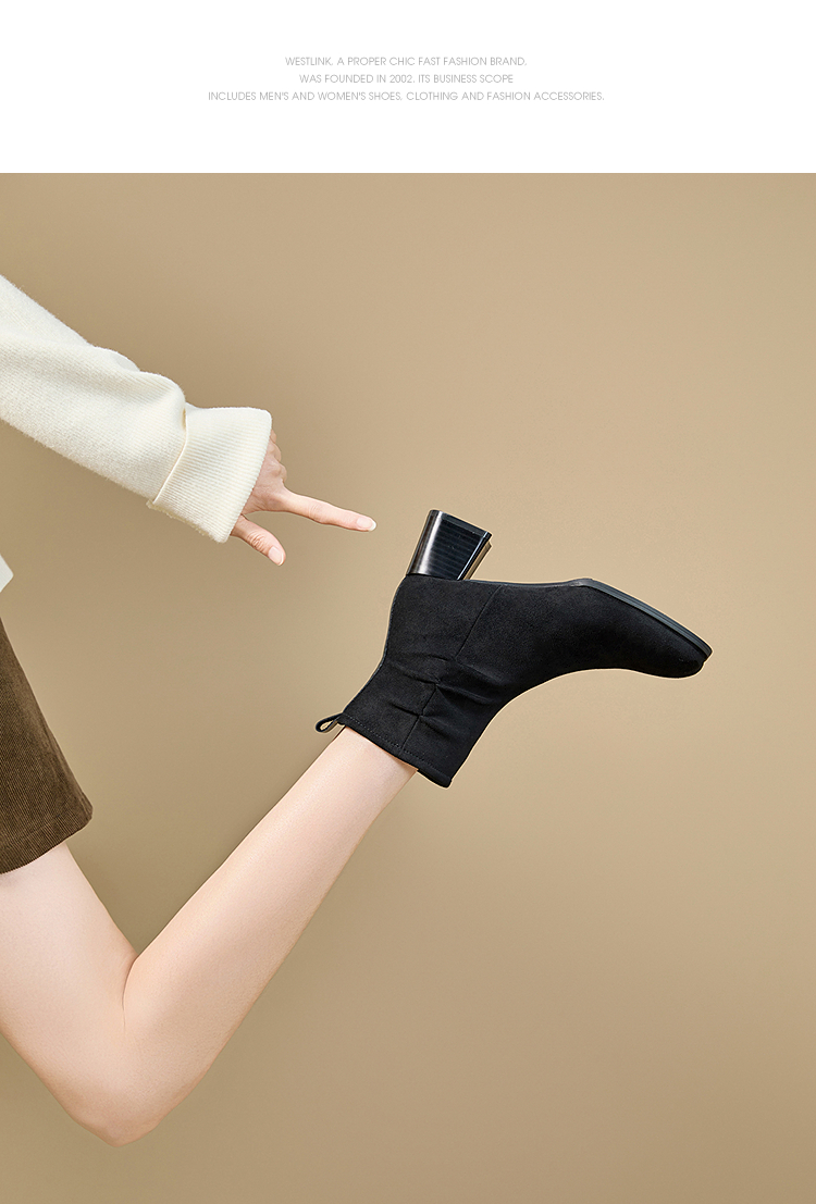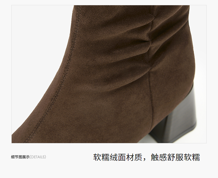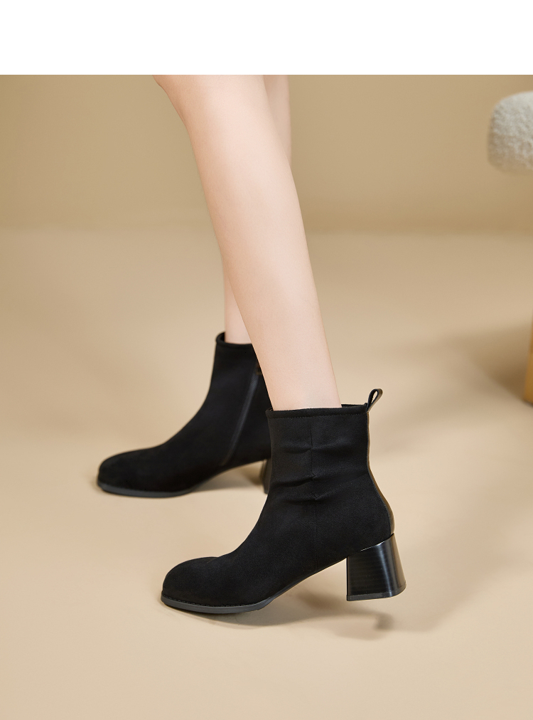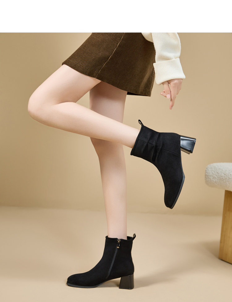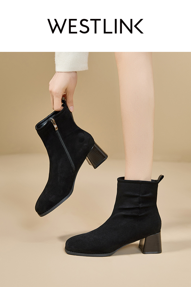 西遇法式短靴女高跟鞋冬季新款高级感绒面方头黑色粗跟瘦瘦靴V2257258