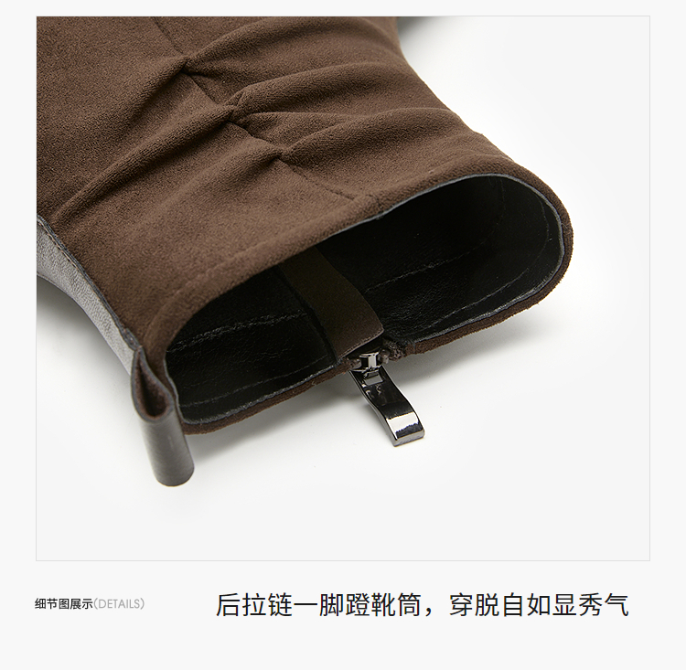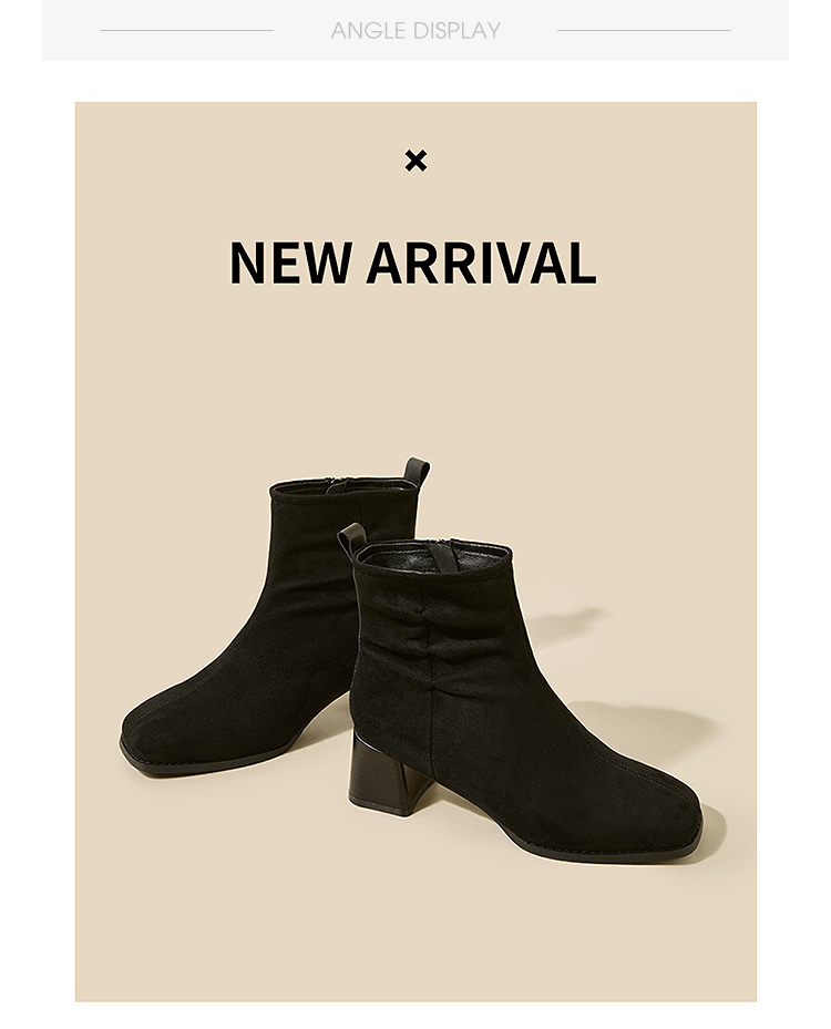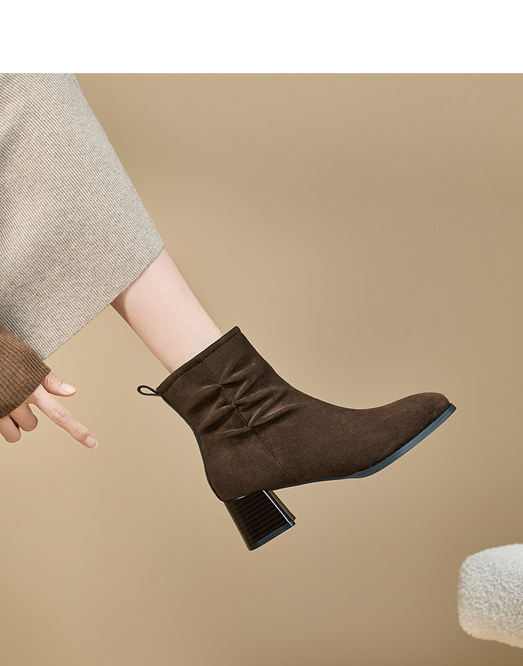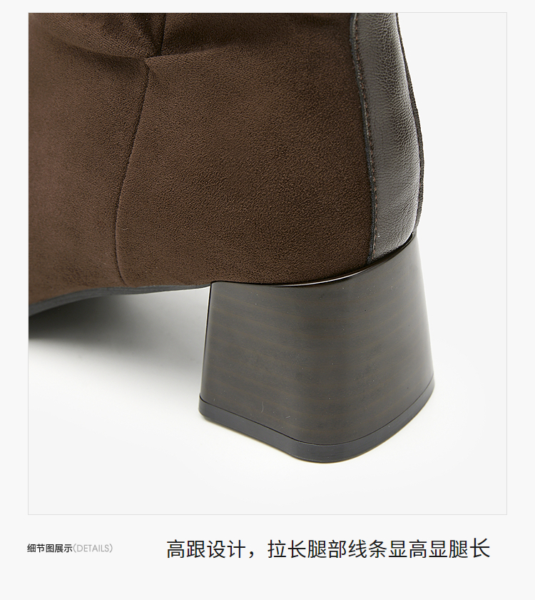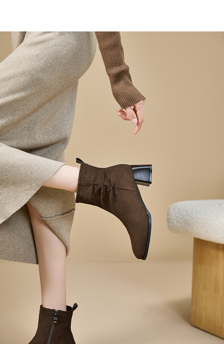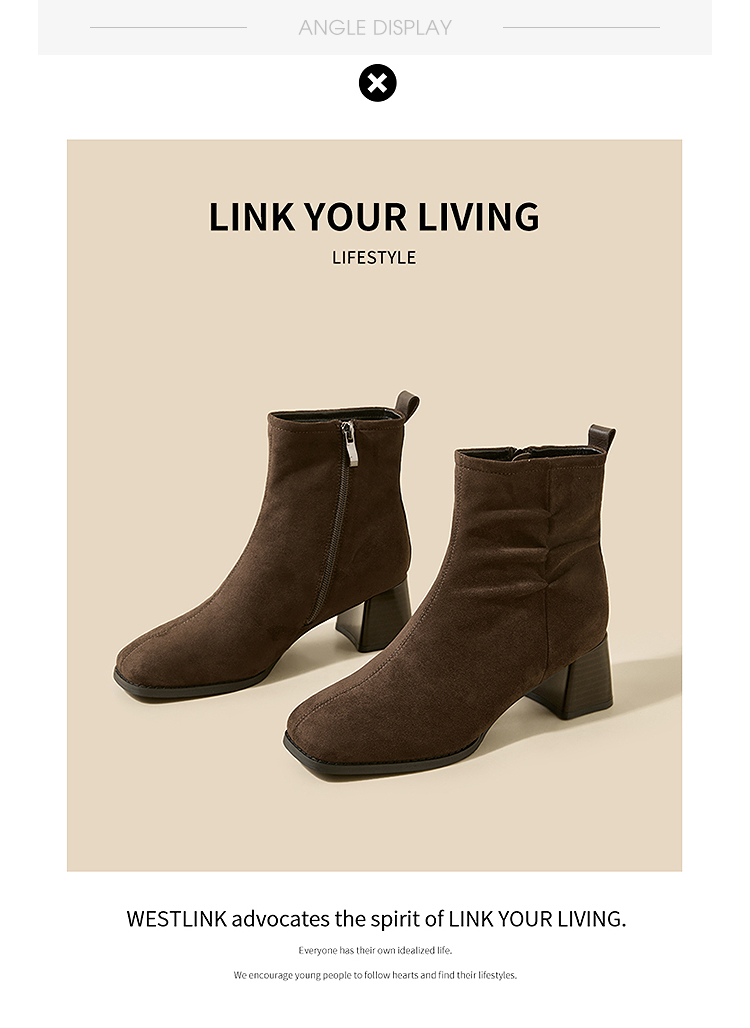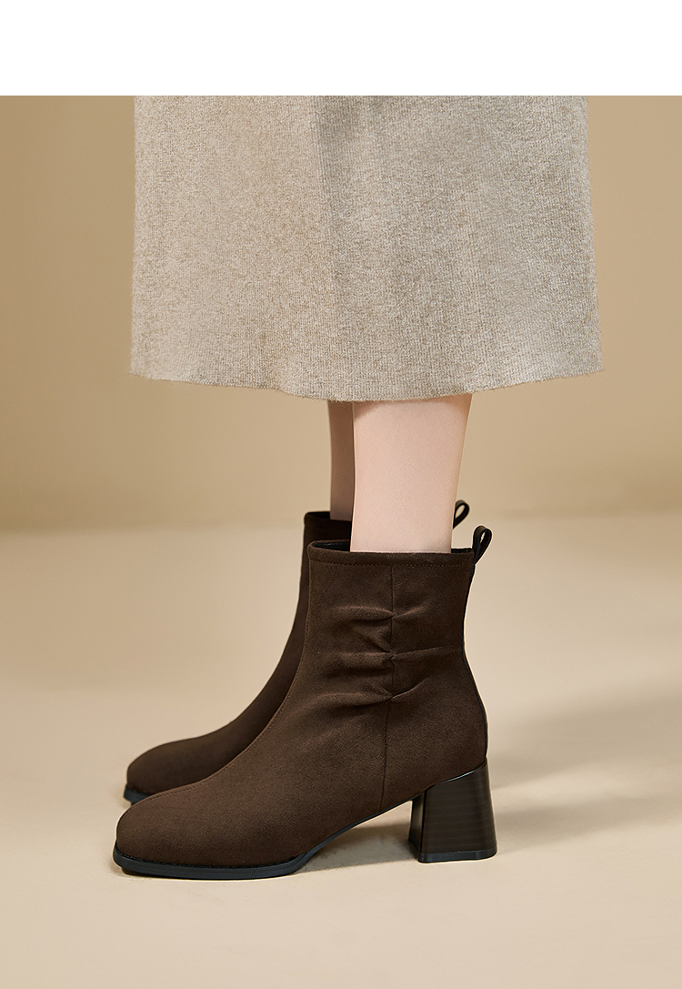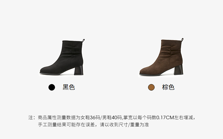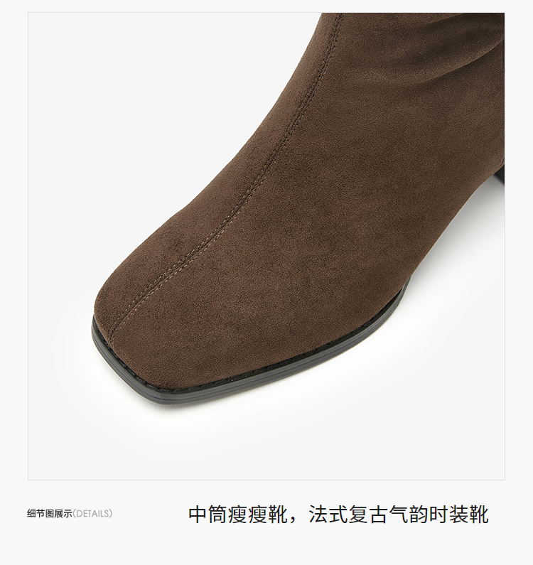 西遇法式短靴女高跟鞋冬季新款高级感绒面方头黑色粗跟瘦瘦靴V2257258