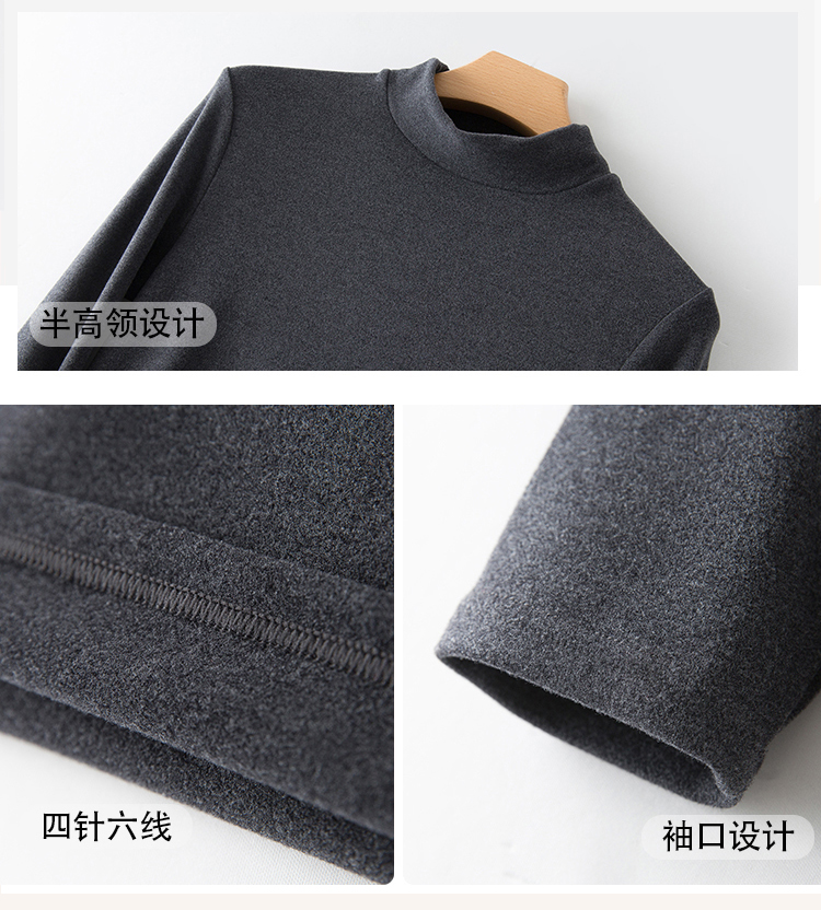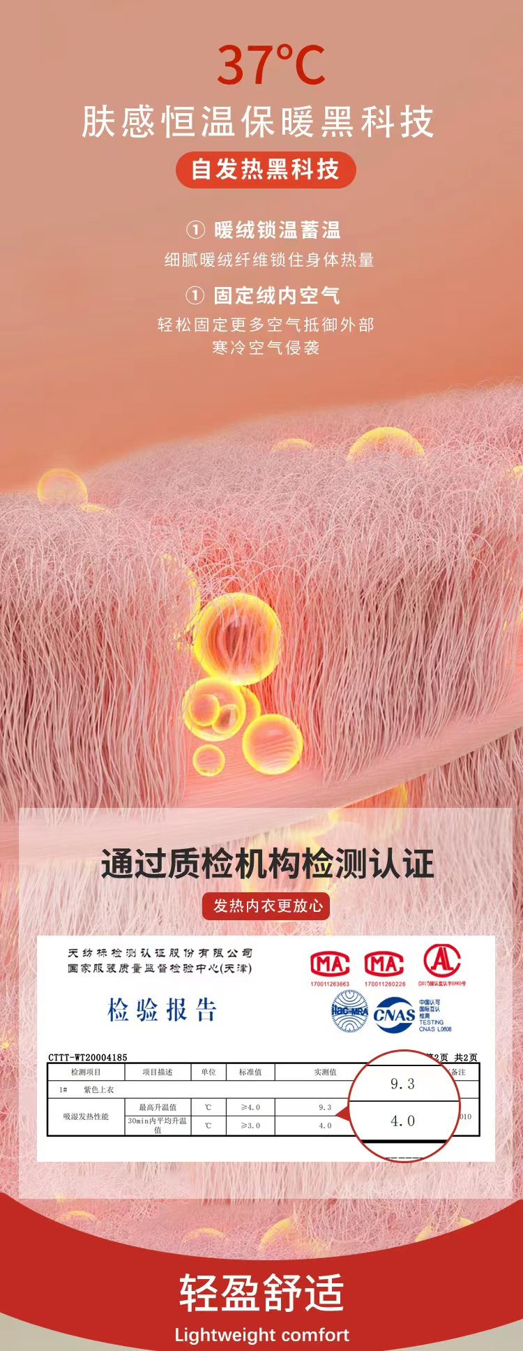 你大可不必担心它能不能hold住寒冬!这主要得益于其材质—— 肤感恒温保暖黑科技面料。相比一般的保暖内衣的臃肿,其中肤感恒温保暖黑科技的绒毛,短、细、密!!可以将我们身体活动时产生的水分疏导至体外,而把热量留在体内。细密的绒毛形成空气层,整件打底衫就像一个热量储存仓,防止身体热量散失,持续“供热循环”,把热乎气锁死!还有独特的干纺超细异型截面技术加持,使织物膨松度比其他同类纤维更高!蓬松度越高,织物能固定更大体积的空气层,保暖性能真滴没话说~