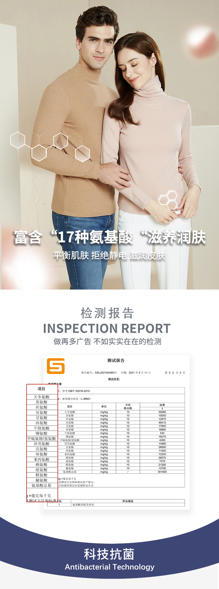 打底衫还能💦💦保养皮肤?🤔是的没错!!!这款真的不是普通的打底衫,而是经过专业鉴定检测,是一款真的含有✅氨基酸成份的打底衣!双面磨毛再生纤维素纤维,富含17种氨基酸!!让衣服整体面料具有✔滋养✔保湿✔润肤的功效!你穿上它就犹如在身上敷了一张巨型面膜~时刻帮你滋养皮肤!😎绝对是名副其实的“美容衣!”👀秋冬皮肤干、起皮的姐妹,买回去试试你一定会回来谢我😎