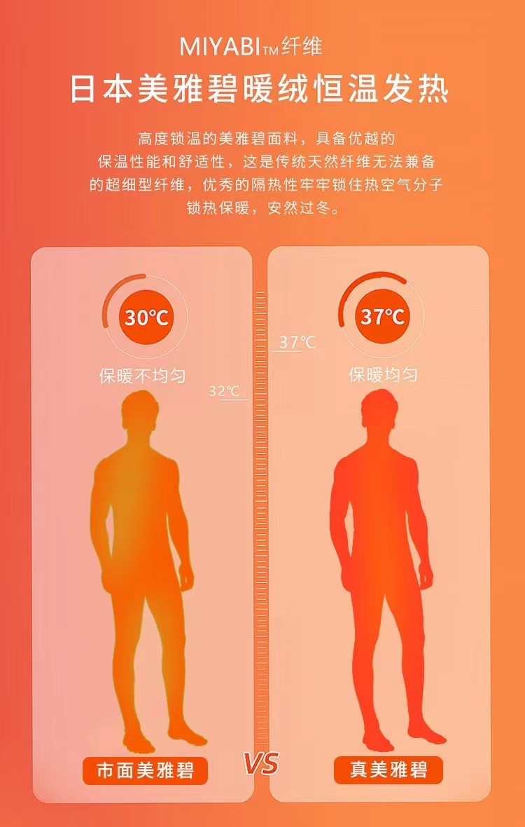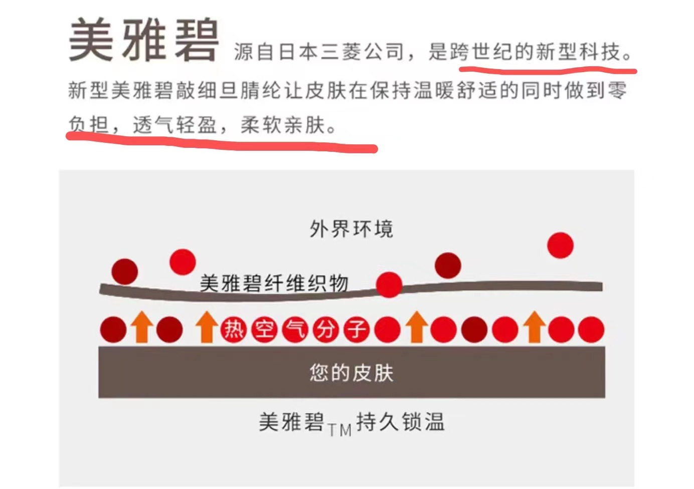 今年的第三代还有了✅膨体美雅碧双面磨毛面料的加入!采用的是日本三菱公司研发的黑科技恒温发热面料,这种进口膨体美雅碧具有跟羊毛类似的温柔触感,同样是异形截面,厚实保暖还锁温~衣物中如果加入了膨体美雅碧双面磨毛面料,不仅保暖性会更上一层楼。还能具备敲好的双抗性能,不易起球、产生静电!同时还是国内大品牌都在用的(爱慕,曼妮芬,蕉内,内外)实用性和性价比都非常高‼不用一层套一层,别人又胖又臃肿的时候,依旧做到暖和和轻盈~