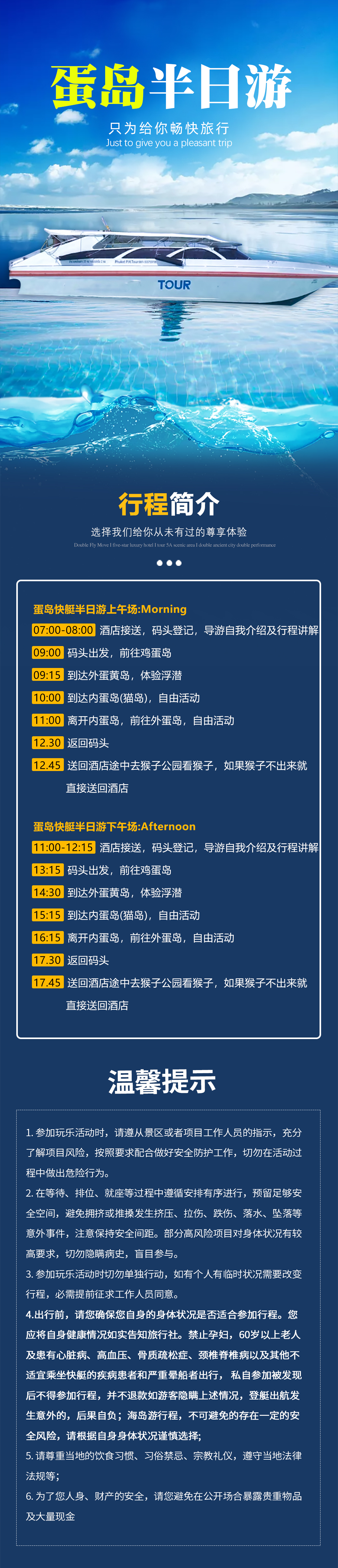 1、出行前,请您确保您自身的身体状况是否适合参加行程。您应将自身健康情况如实告知旅行社。禁止孕妇,60岁以上老人及患有心脏病、高血压、骨质疏松症、颈椎脊椎病以及其他不适宜乘坐快艇的疾病患者和严重晕车船者出行, 私自参加被发现后不得参加行程,并不退款,如游客隐瞒上述情况,登艇出航发生意外的,后果自负;海岛游行程,不可避免的存在一定的安全风险,请根据自身身体状况谨慎选择;