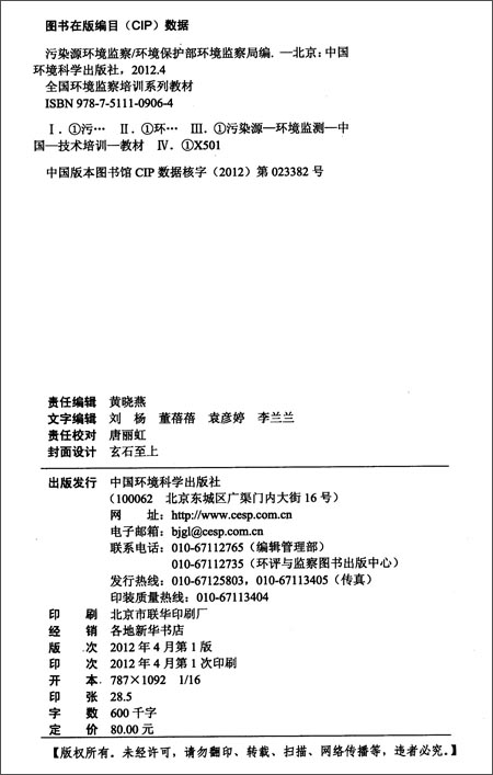 《全国环境监察培训系列教材:污染源环境监察》共14章,在环境保护部环境监察局的指导下,由中国环境管理干部学院毛应淮、曹晓凡等人共同编写。其中第一、二、四、五、七、八、十章由毛应淮编写,第二、六、九、十一、十二、十三章由曹晓凡编写,第十四章由王仲旭编写,宋海鸥、姚宝军、刘定慧、韩小铮、杜卫、宫银海、于莉、翟国辉、戴秋香、赵强、黄宇、云利刚、唐海刚等同志参与编写。全书由毛应淮统稿和总体设计。