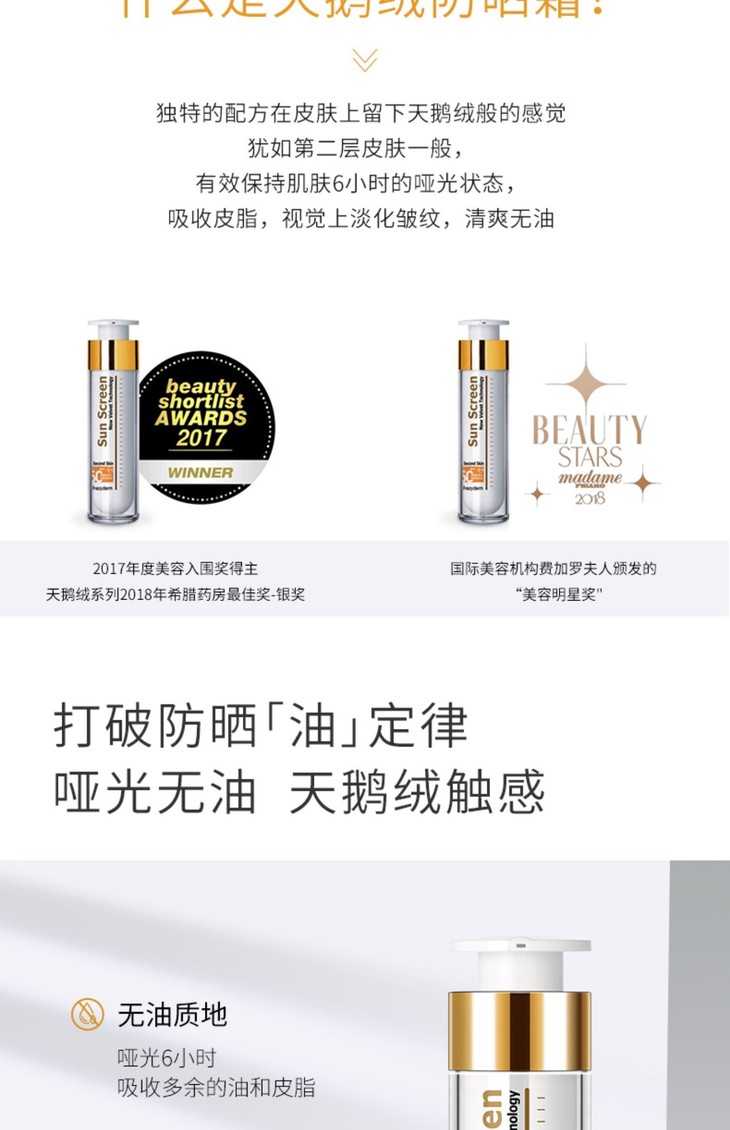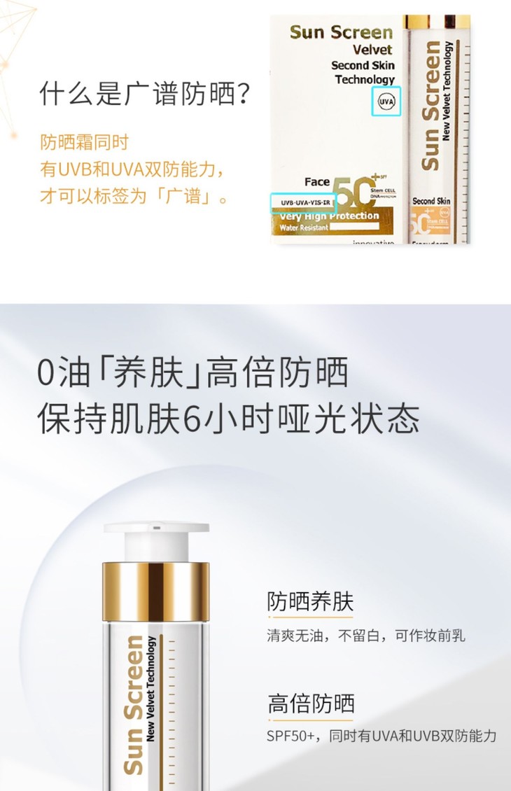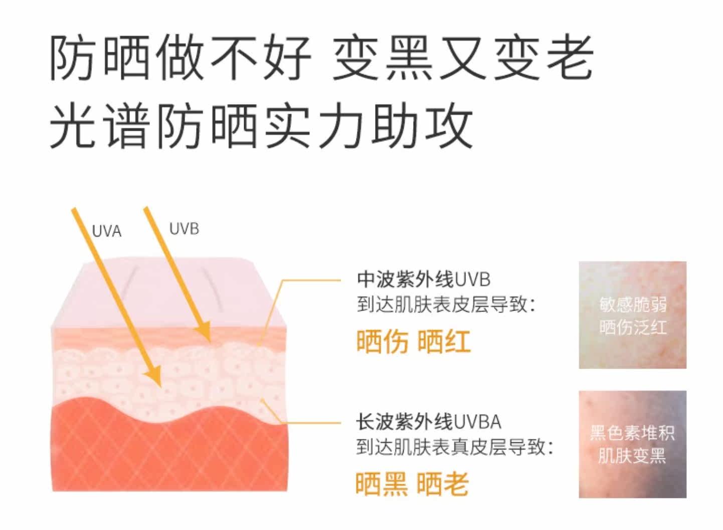 肤感清爽,短短六秒即可成膜,维持肌肤6小时哑光状态,这只是它的其中一个优点!它是市面上少有的光谱防晒霜,同时能防止UVA和UVB对皮肤的损伤,全方位保护你的皮肤,不仅能防止晒伤晒红,还能防止晒黑!对抗光老化,对皮肤严防死守,效果很强悍!