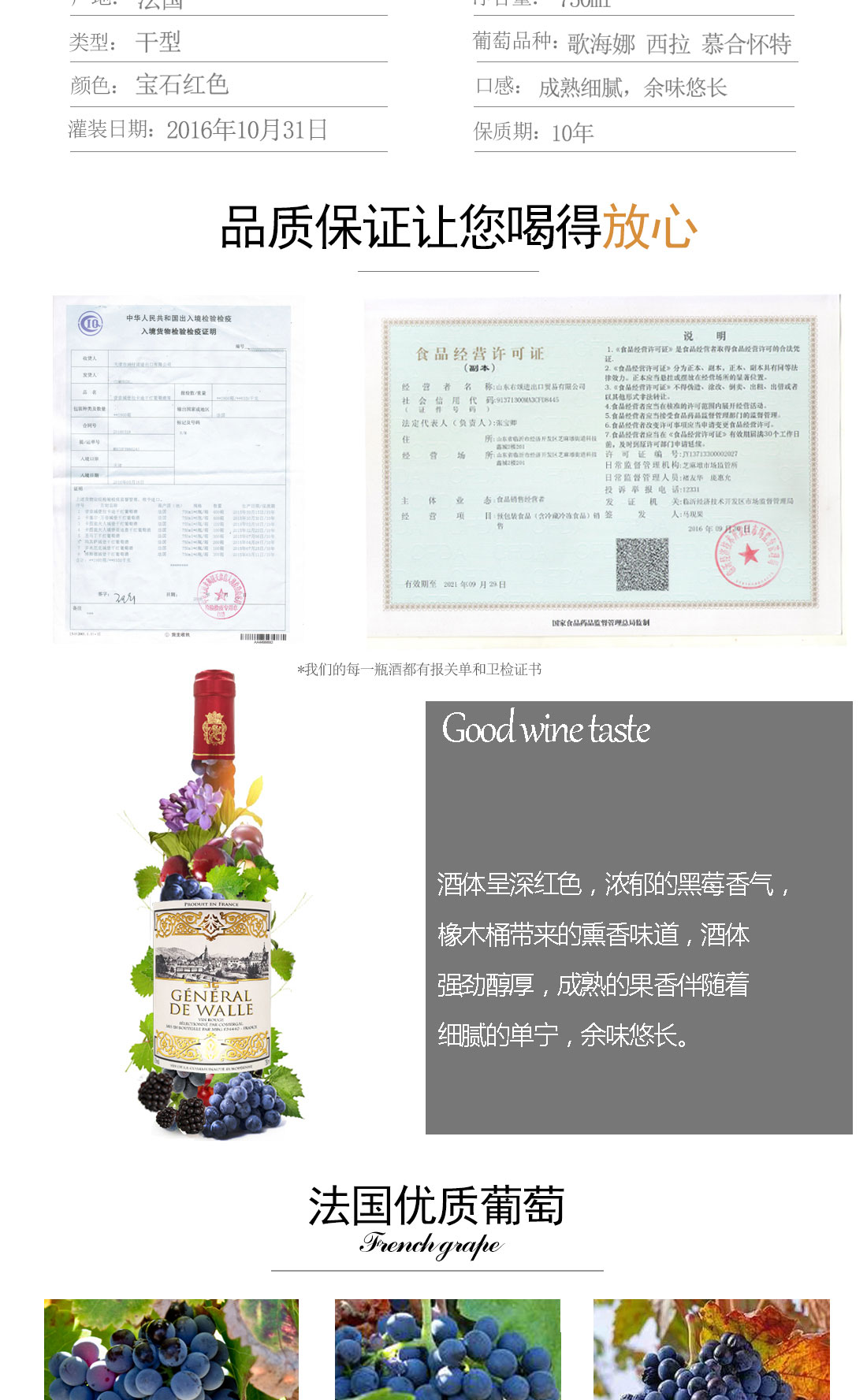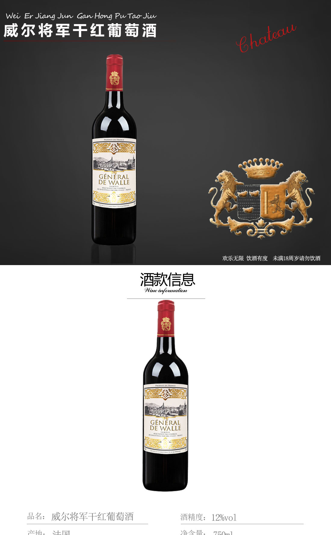 法国进口威尔将军精品干红葡萄酒 750ml