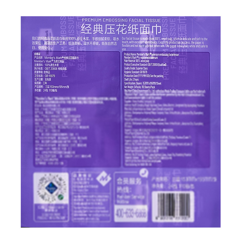Member's Mark经典压花纸面巾三层110抽*24包 山姆会员店商品非商品原因不支持退款