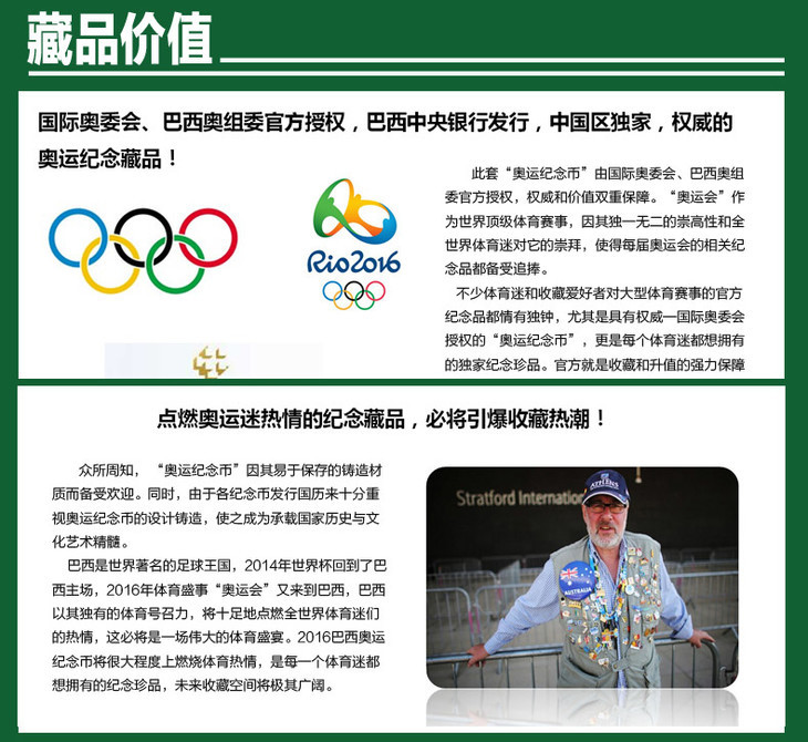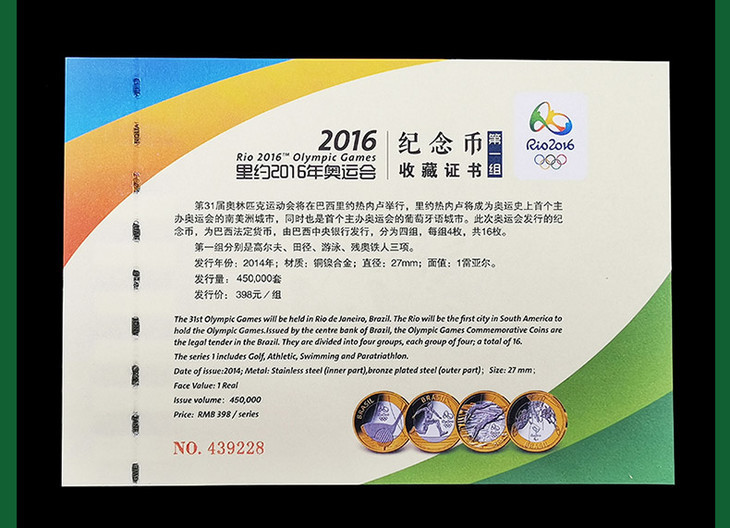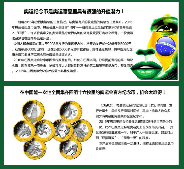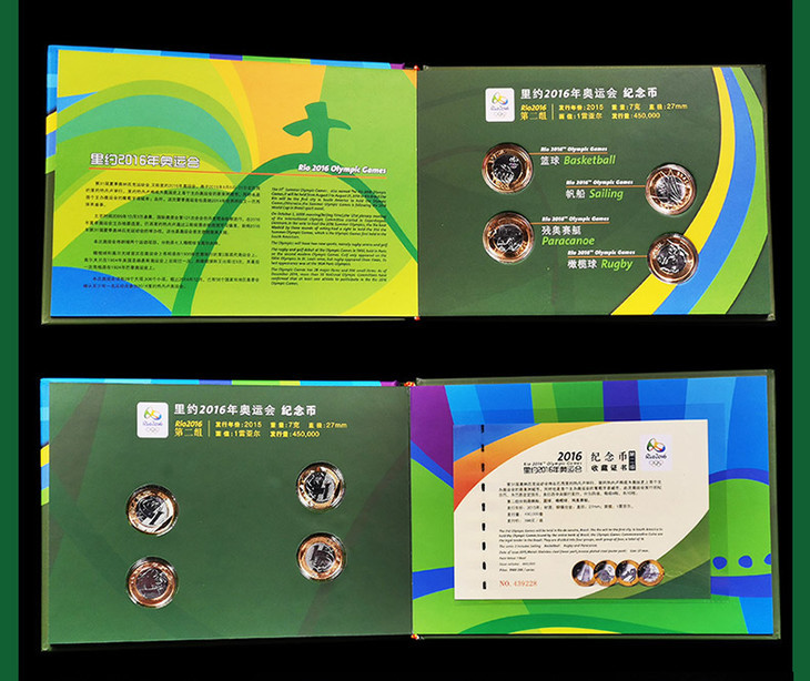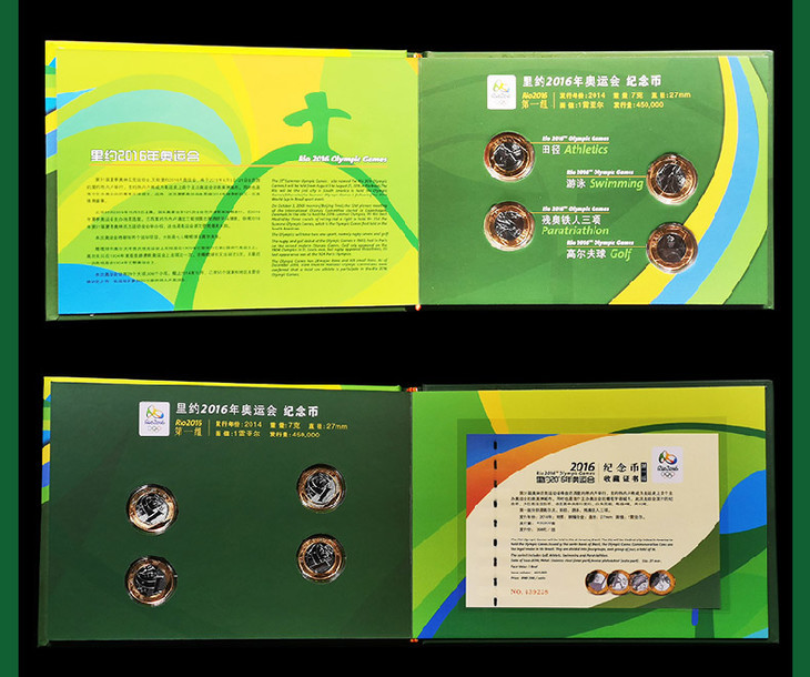 经国际奥委会授权,巴西央行发行一套奥运会纪念币,一套四组,共16枚。均为巴西法定货币,面值1雷亚尔,直径27mm,材质为铜镍合金。中华地区配额仅20万套。