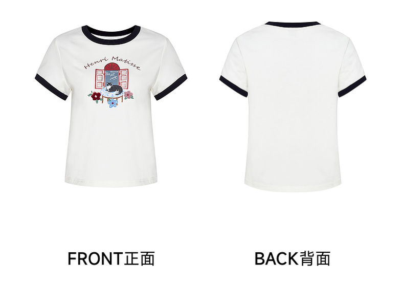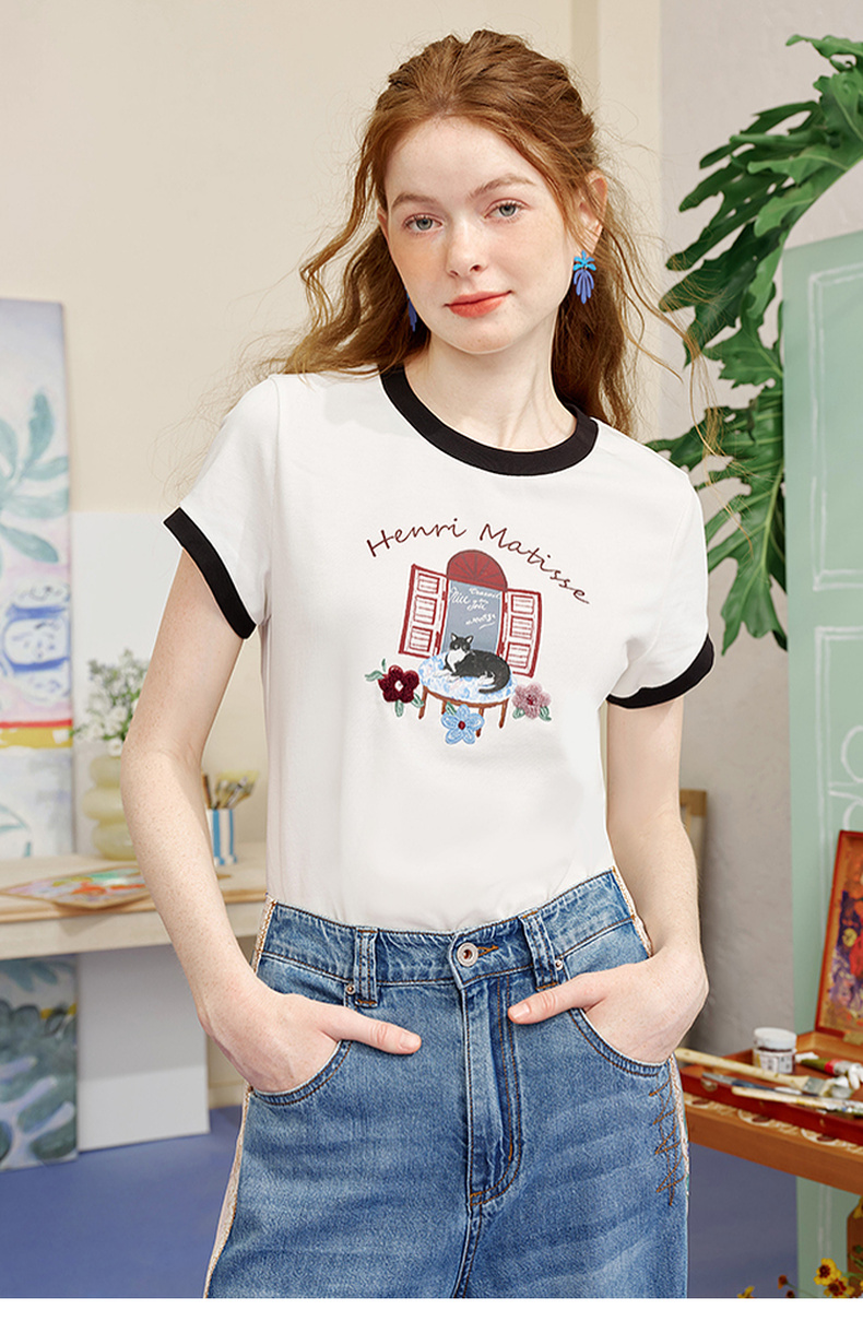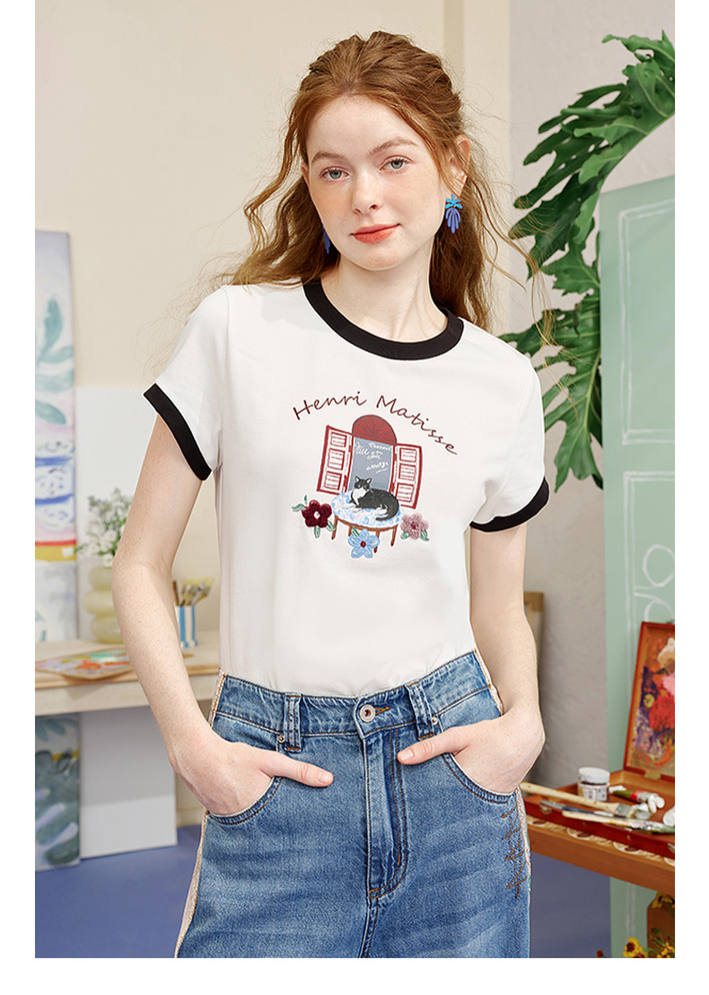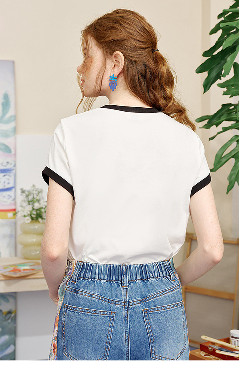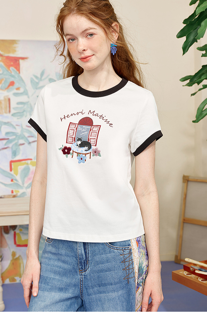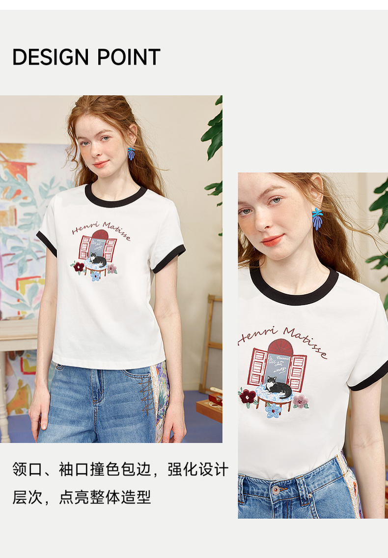 两三事 窗前絮语 2025夏季新款休闲拼色边印花短袖t恤女