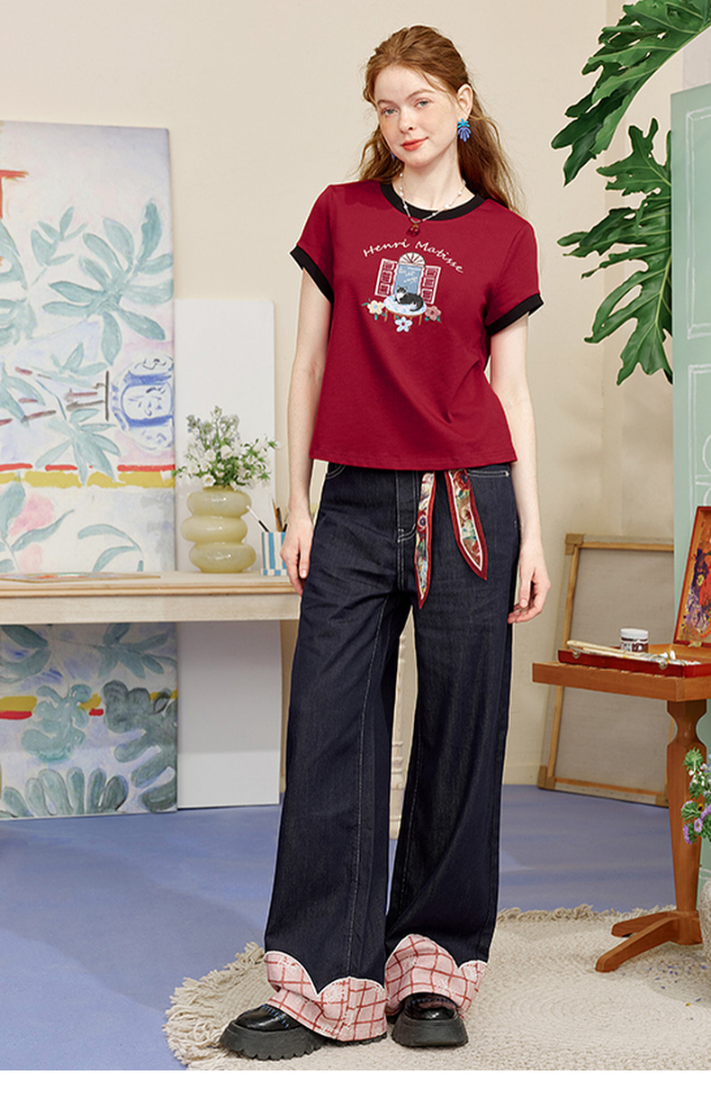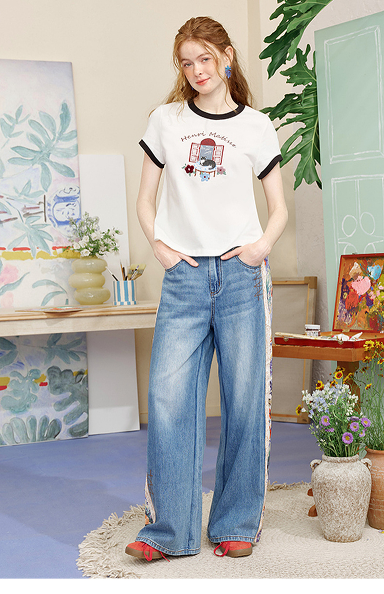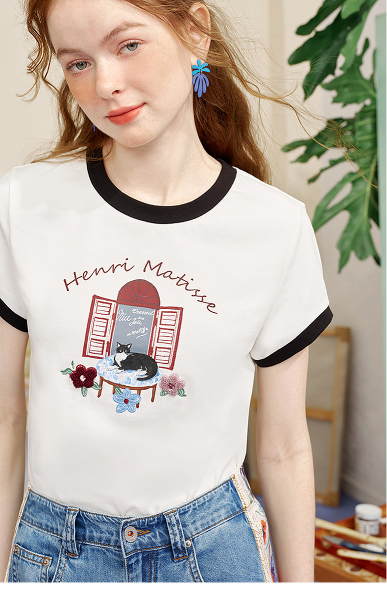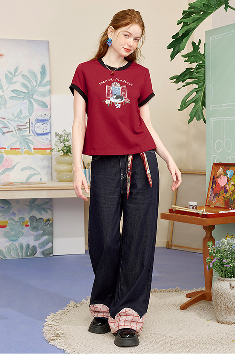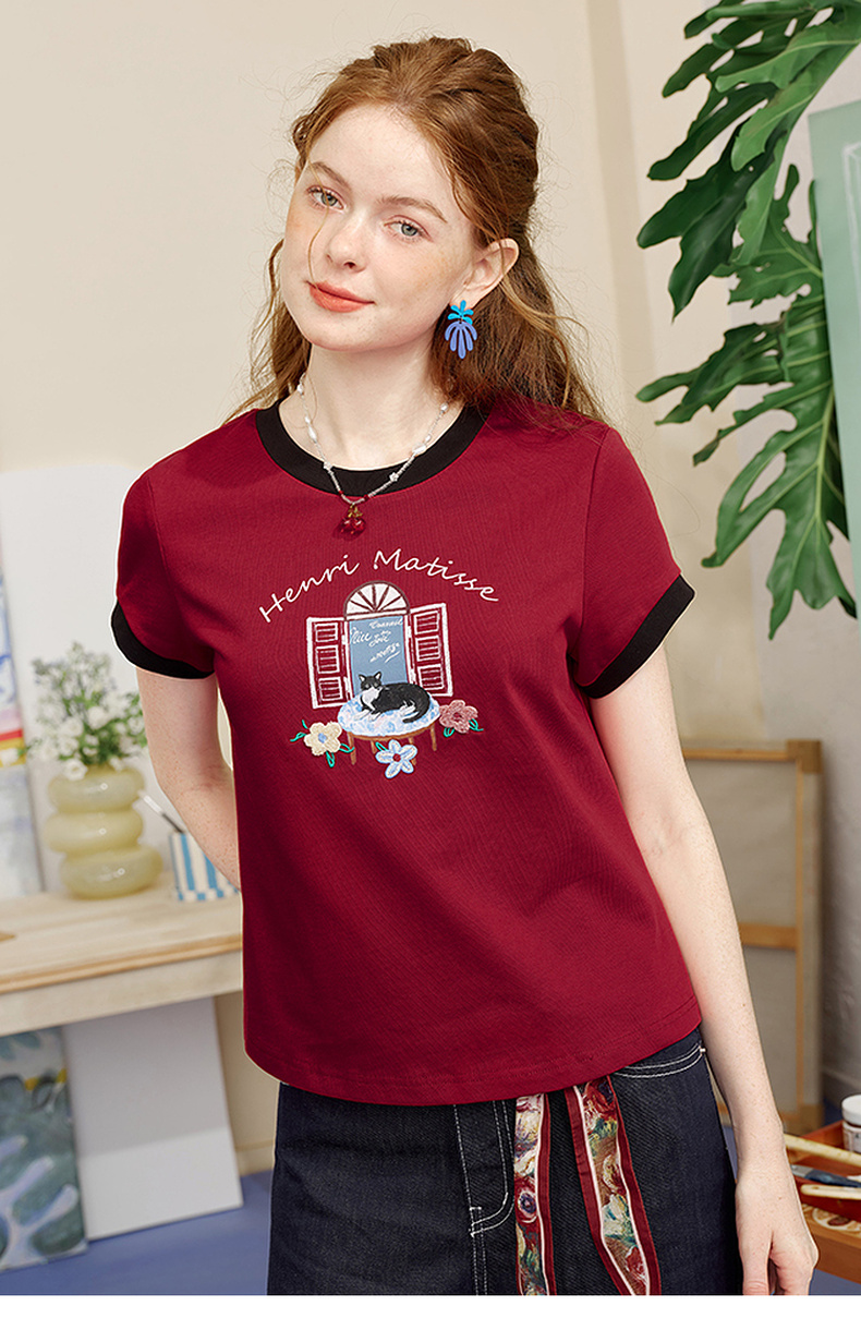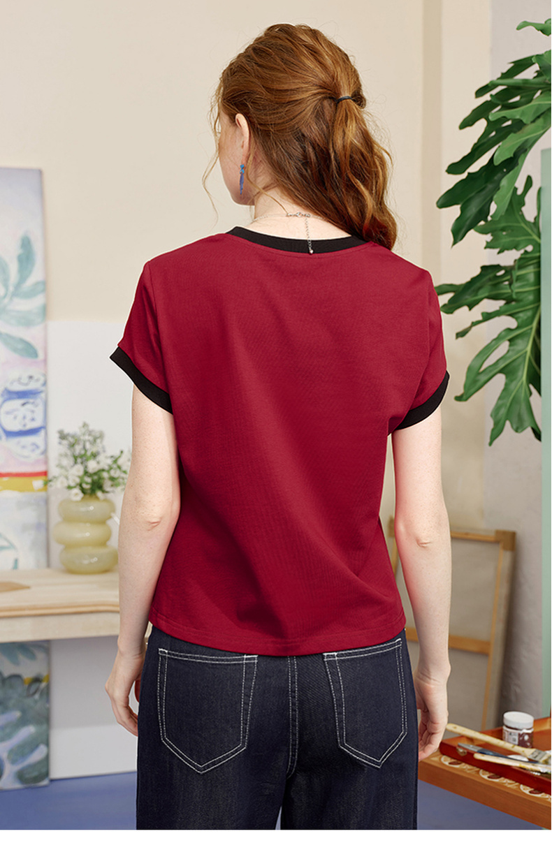 两三事 窗前絮语 2025夏季新款休闲拼色边印花短袖t恤女