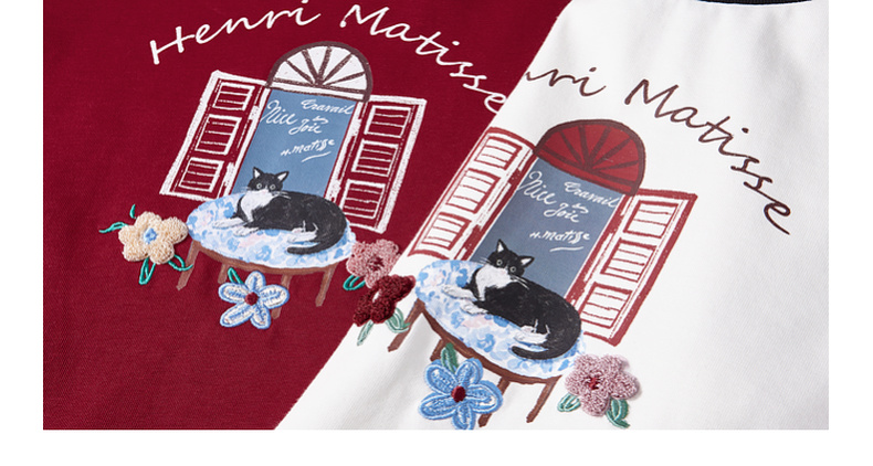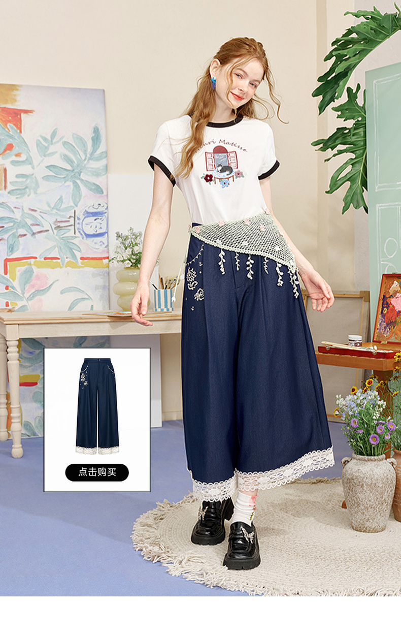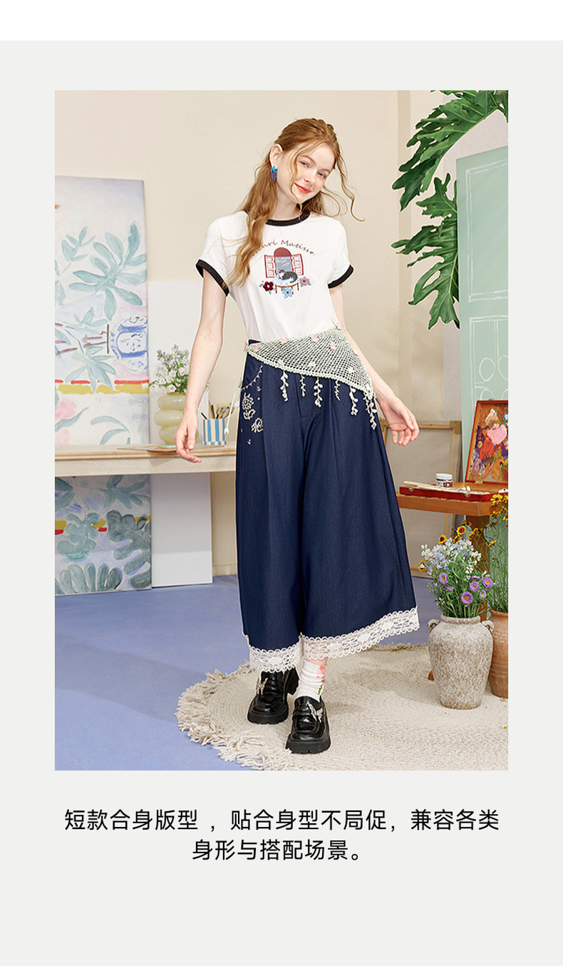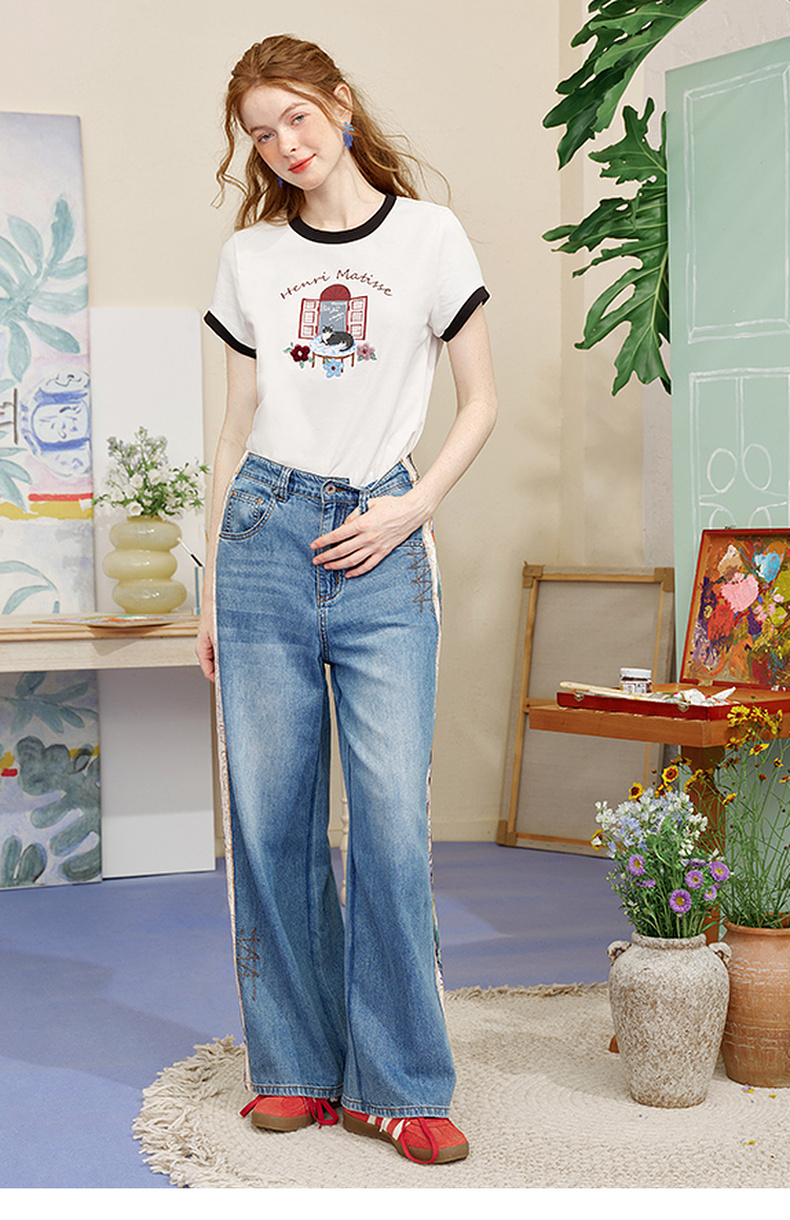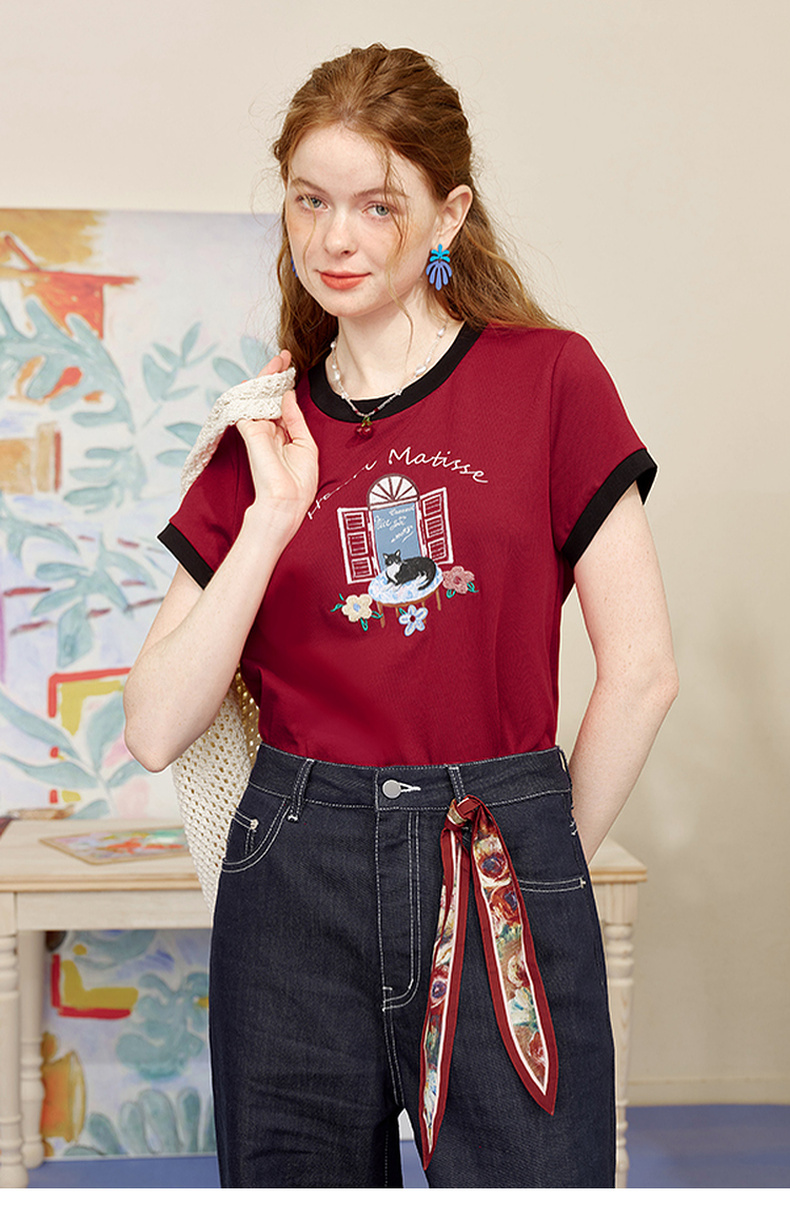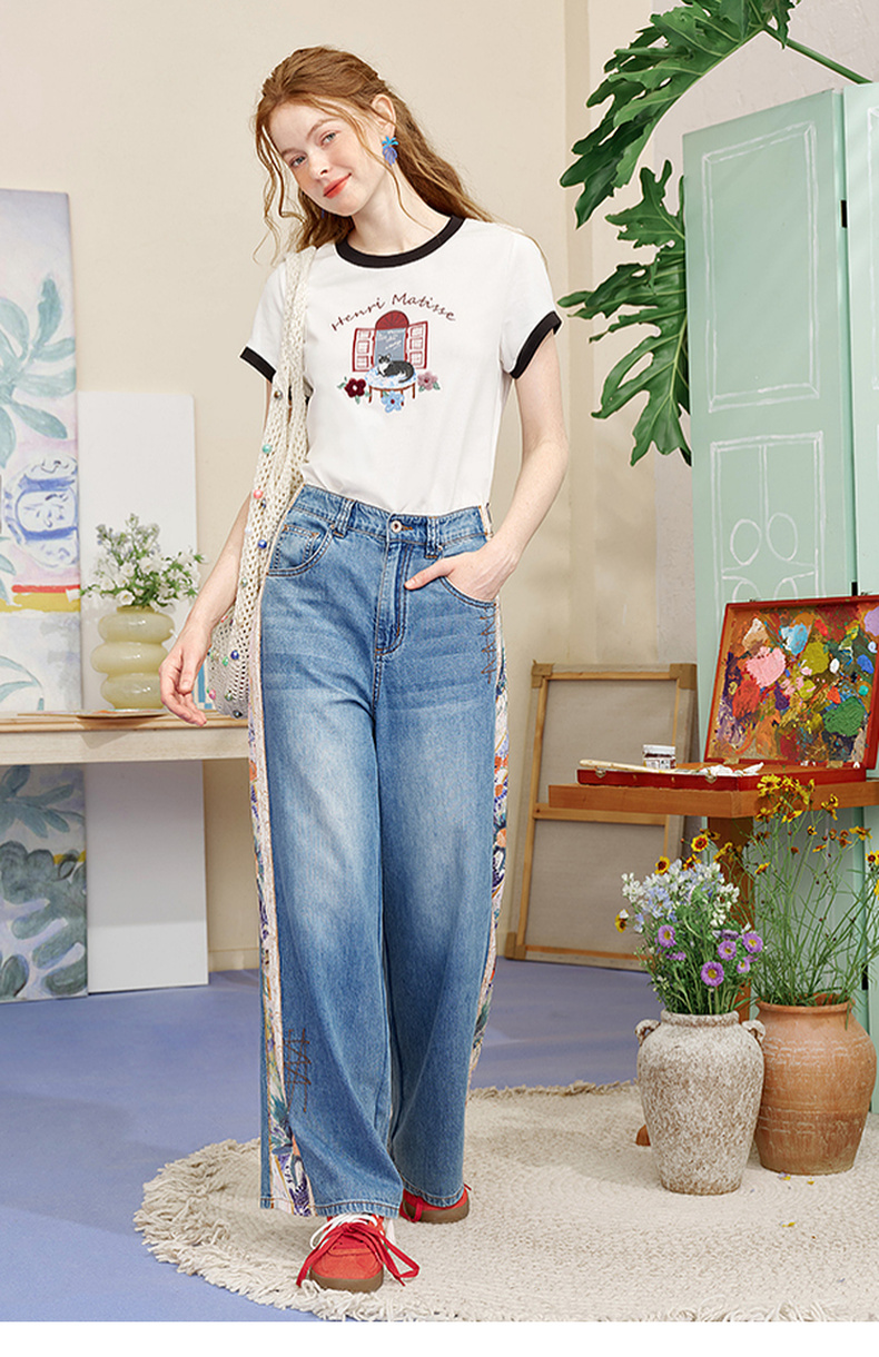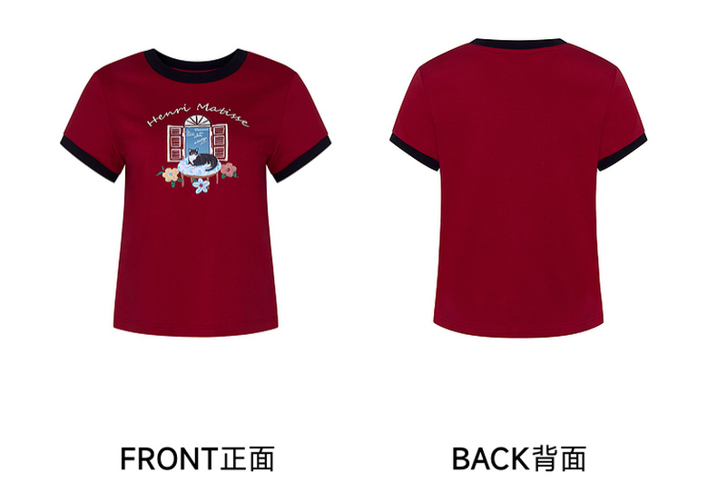 两三事 窗前絮语 2025夏季新款休闲拼色边印花短袖t恤女