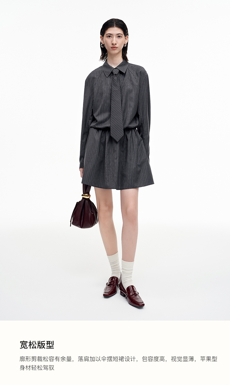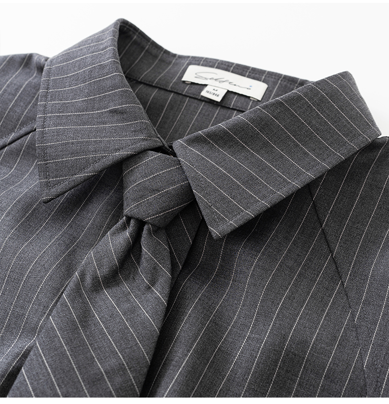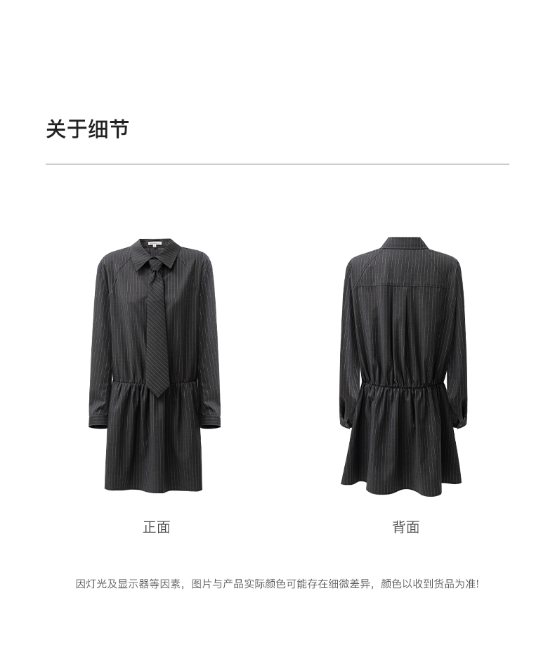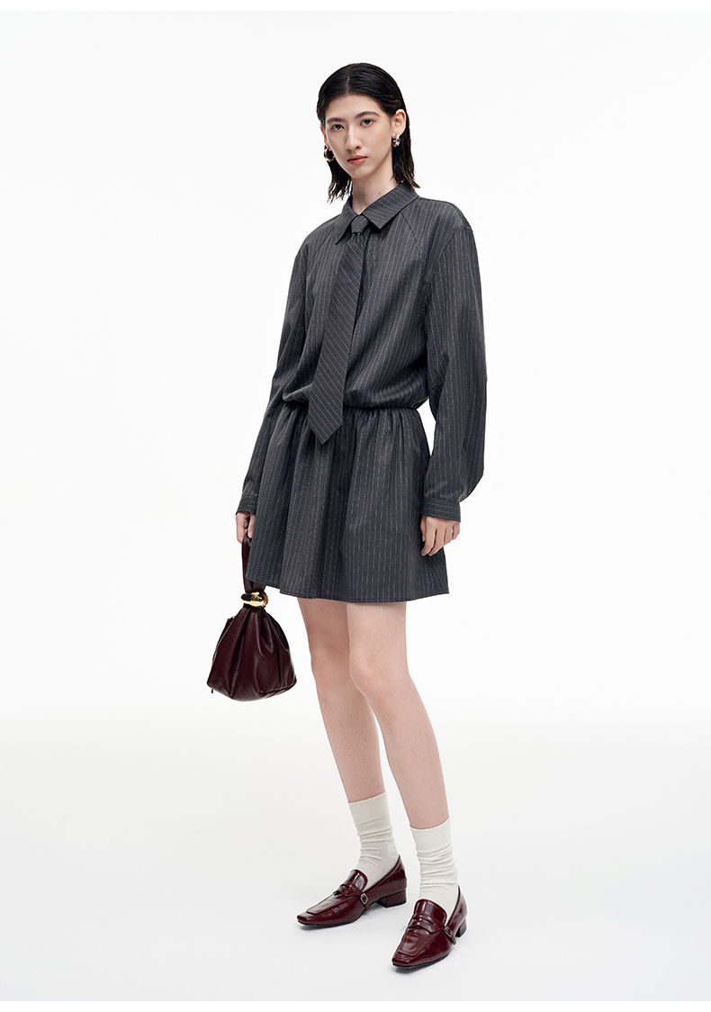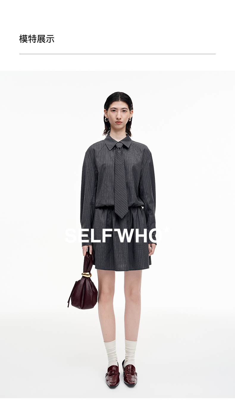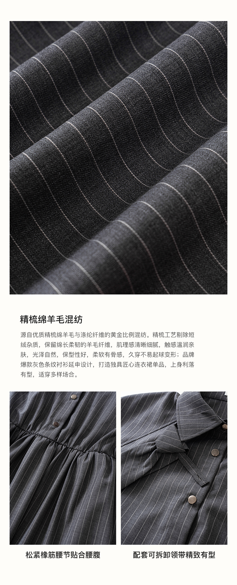 SELFWHO羊毛混纺灰色条纹连衣裙女2025季秋新款可拆卸领带衬衫裙