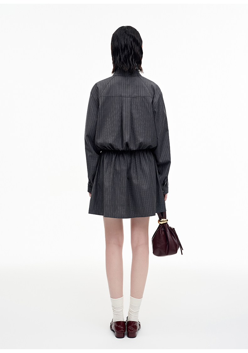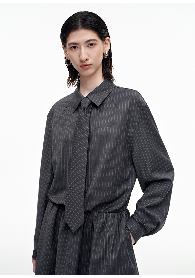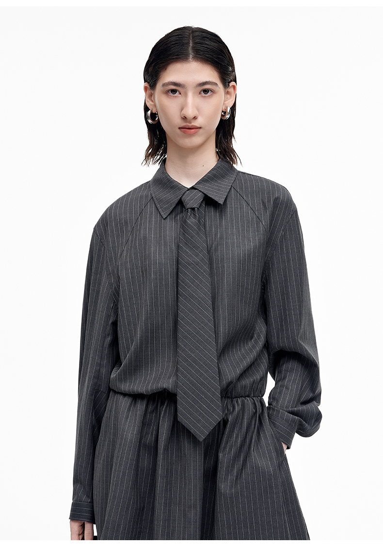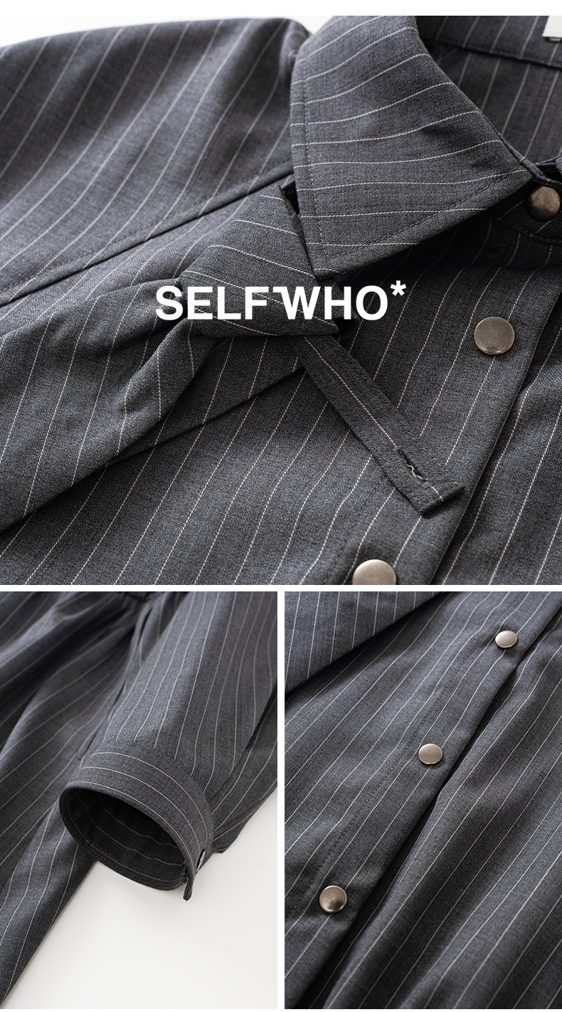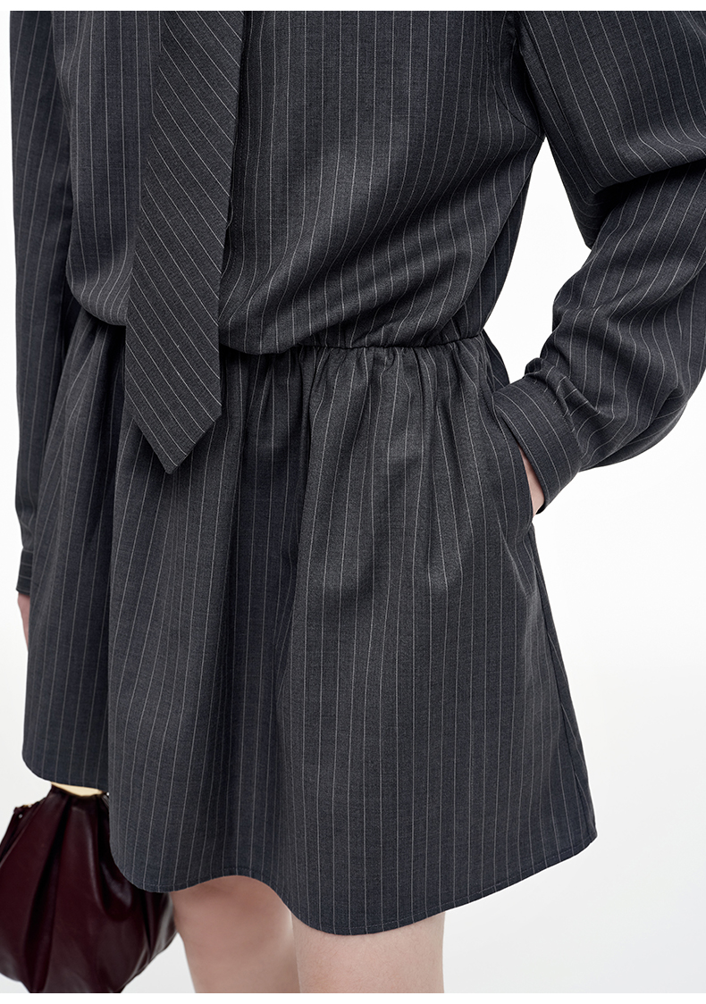SELFWHO羊毛混纺灰色条纹连衣裙女2025季秋新款可拆卸领带衬衫裙