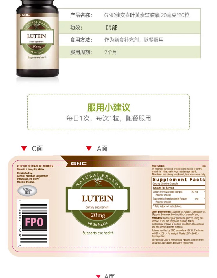 【保税仓】GNC健安喜叶黄素胶囊20mg60粒