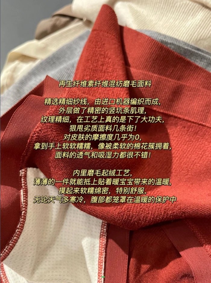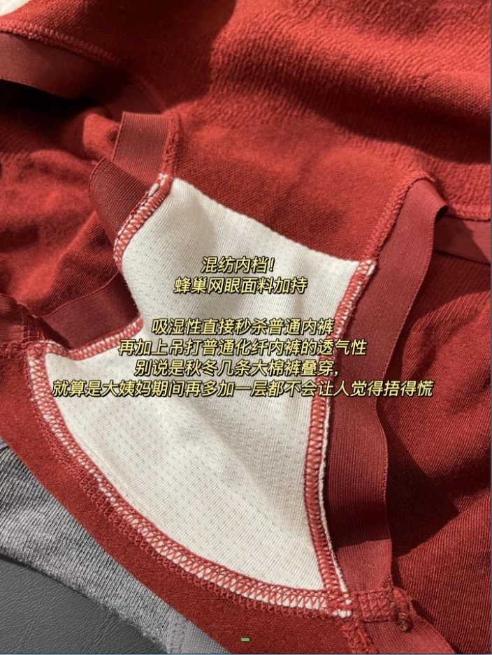 内里磨毛起绒工艺,薄薄的一件就能抵上贴着暖宝宝带来的温暖,摸起来软糯绵密,特别舒服,无论天气多寒冷,腹部都笼罩在温暖的保护中 黏胶混纺内档 蜂巢肌理加持,吸湿性直接秒杀普通内裤,再加上吊打普通化纤内裤的透气性,就算是大姨妈期间再多加一层都不会让人觉得捂得慌!