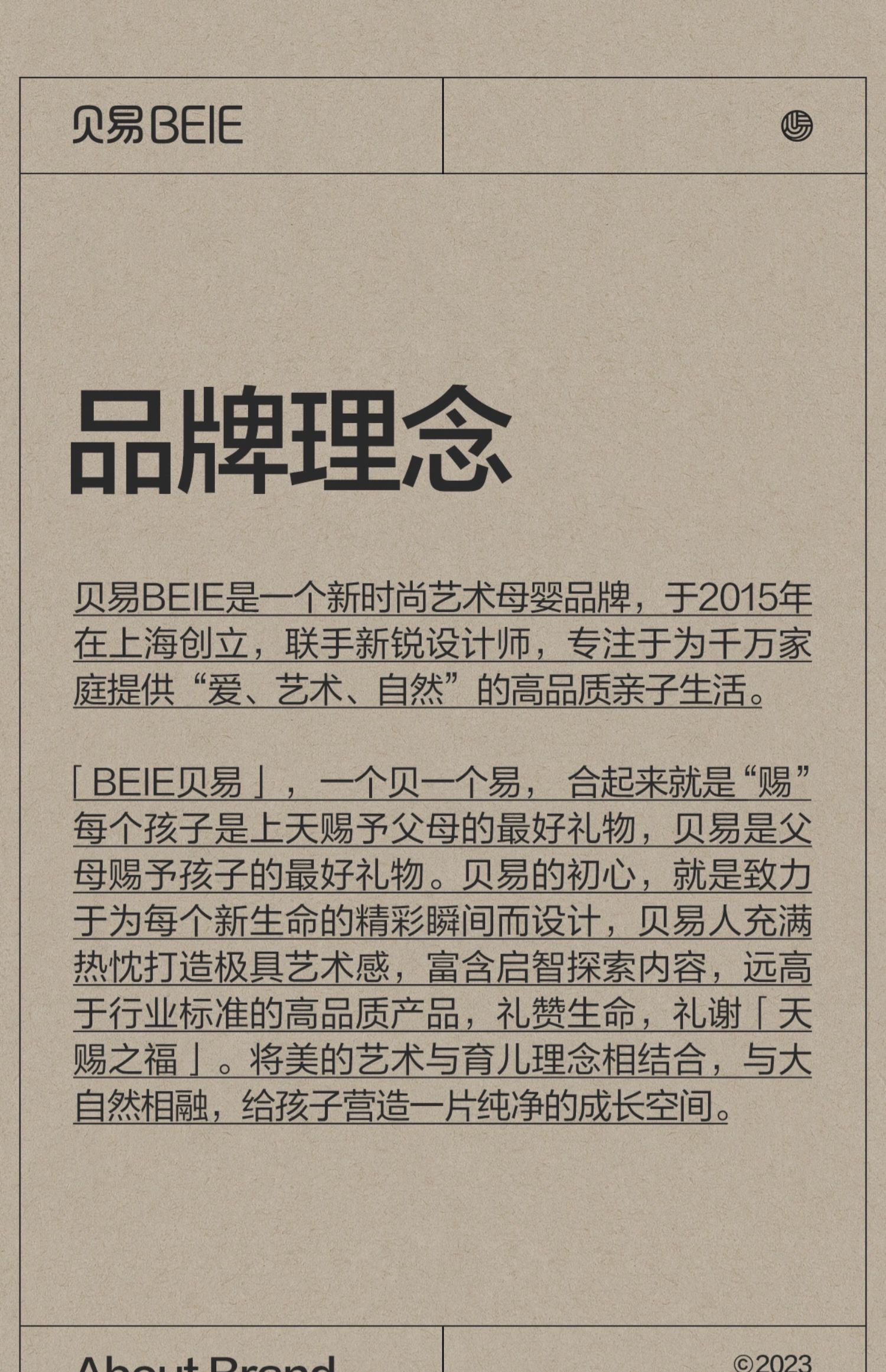 - 「BEIESTATE贝易」以极简设计为风格,主打兼顾设计、品 质和性价比的母婴产品,以创造极致细腻、不张扬、 不世俗的当代母婴用具,为用户日常亲子生活与幼儿 的启蒙早教提供新选择。