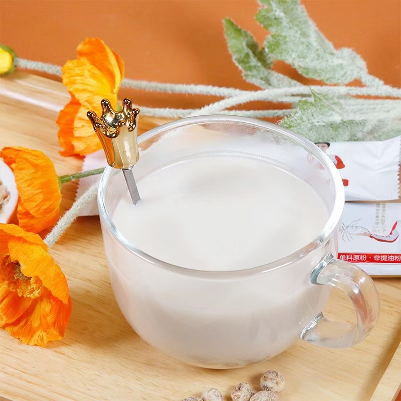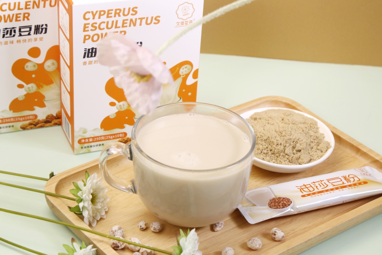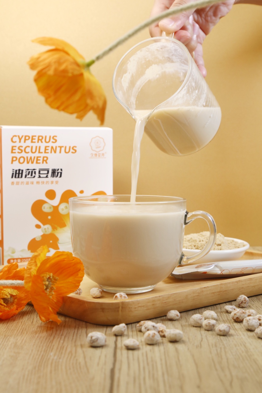 1. 60度温开水,取1包油莎豆粉,按1:7 加入水,搅拌均匀即可饮用;