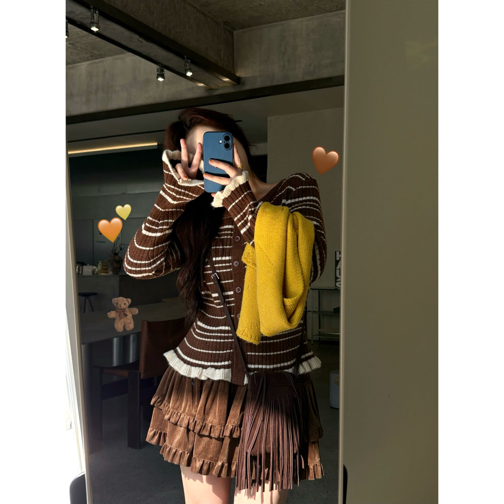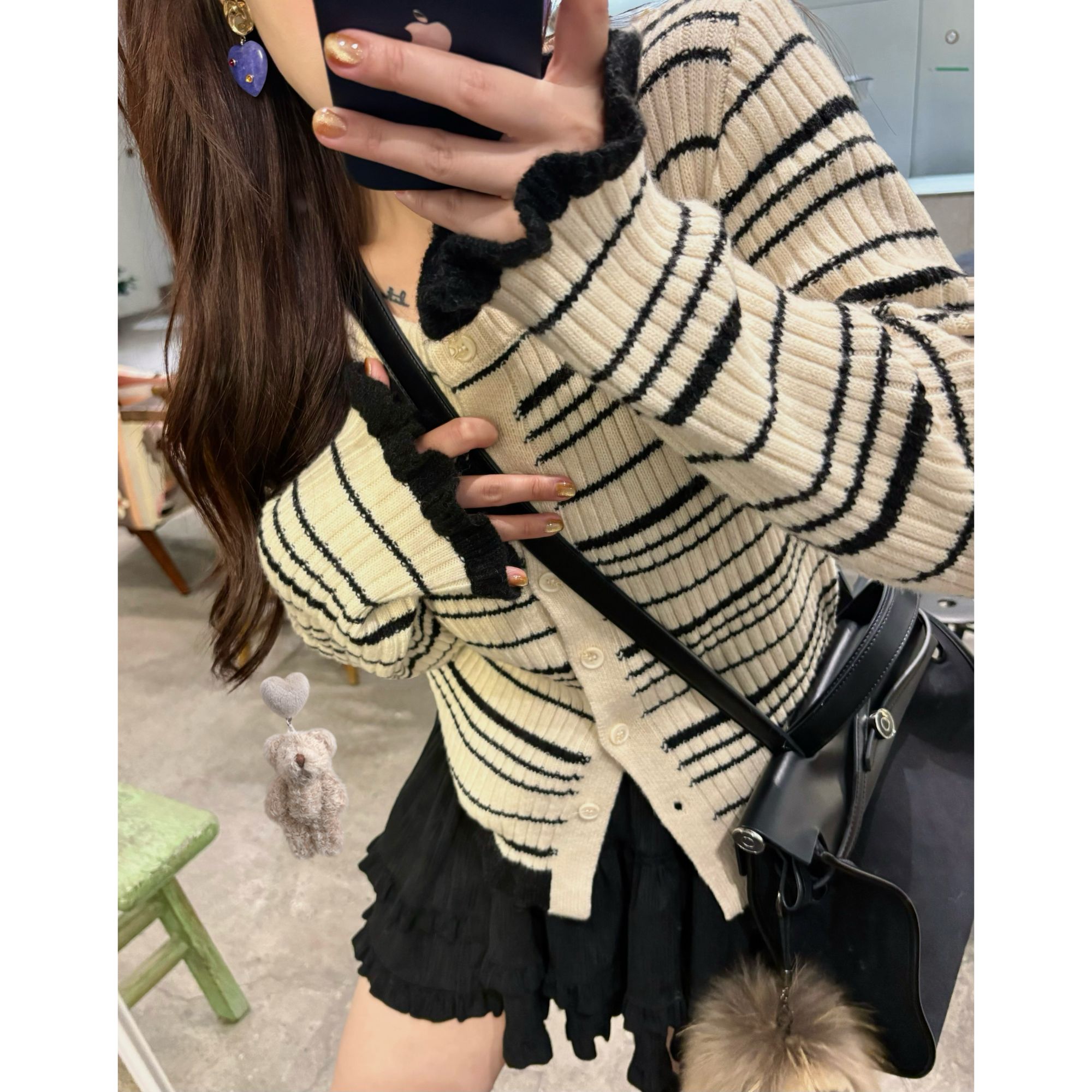 25AW上新 甜甜同款【焦糖可颂】复古条纹木耳边针织开衫