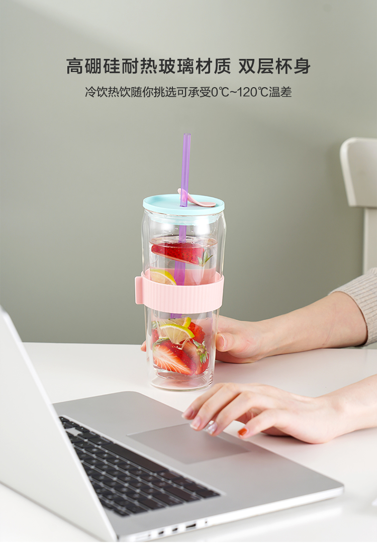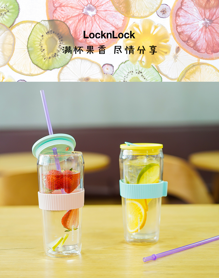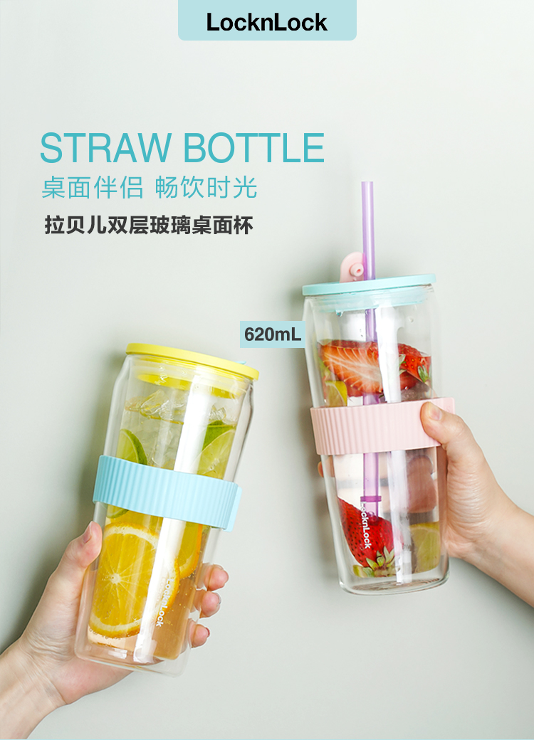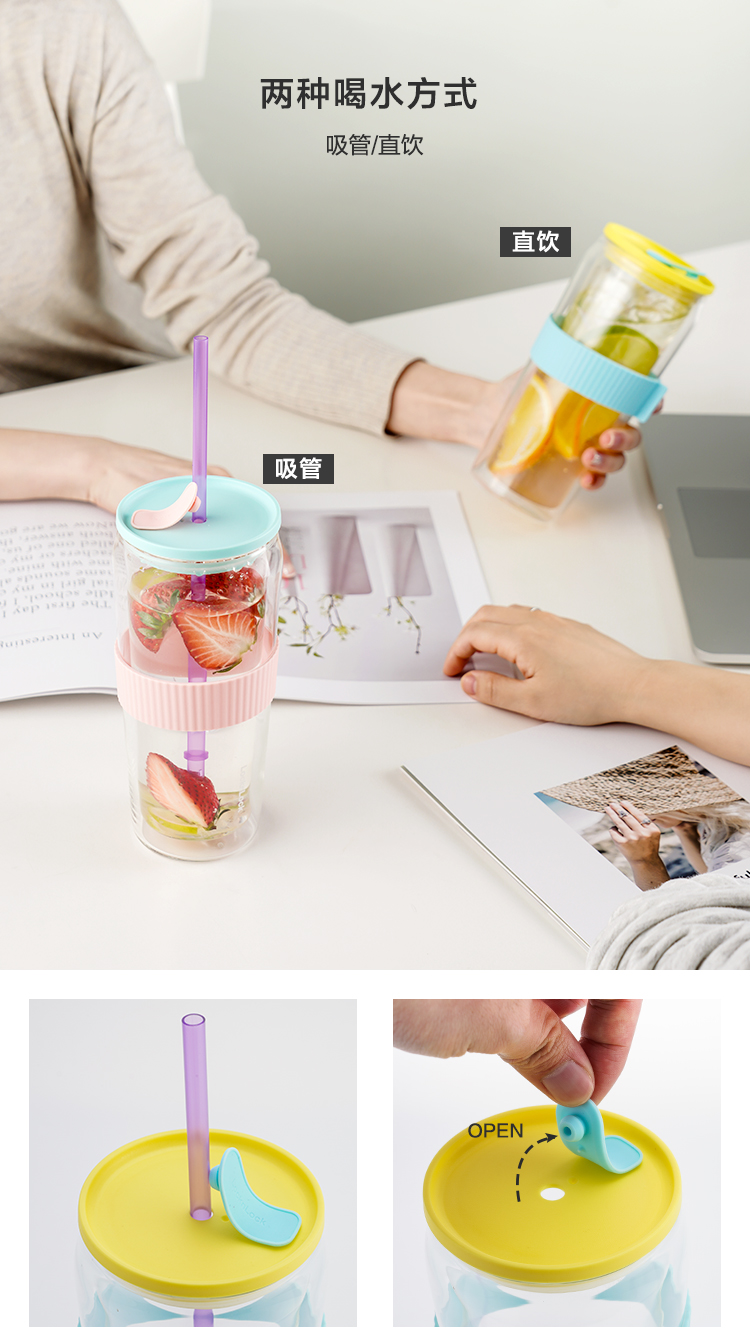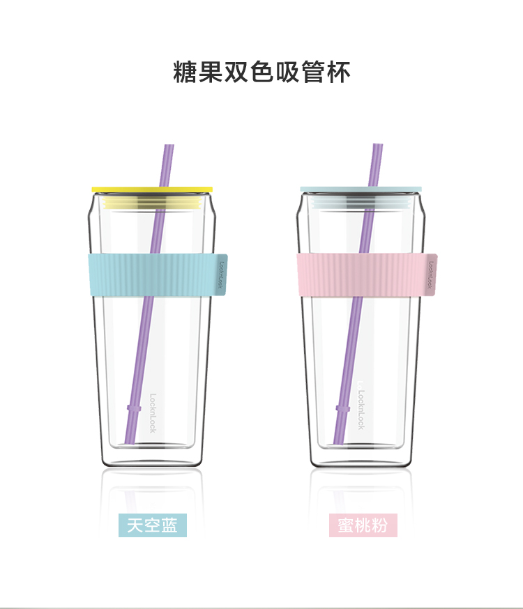 乐扣乐扣吸管杯ins风带吸管水杯女双层耐热玻璃杯大容量少女心 LLG919