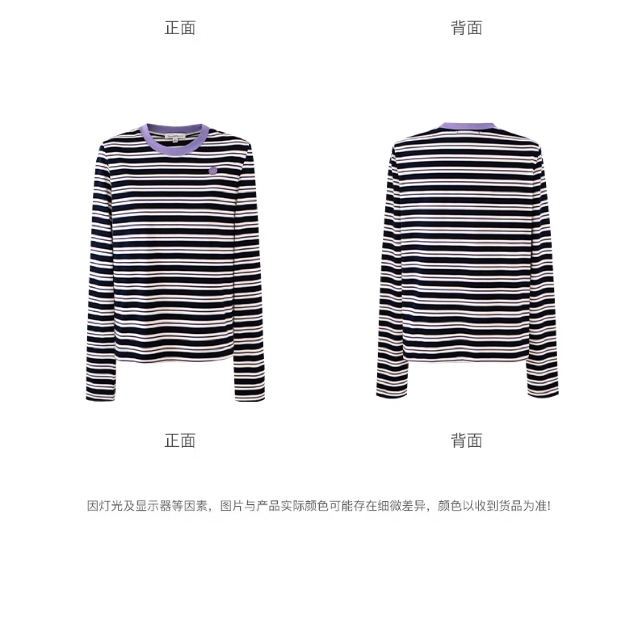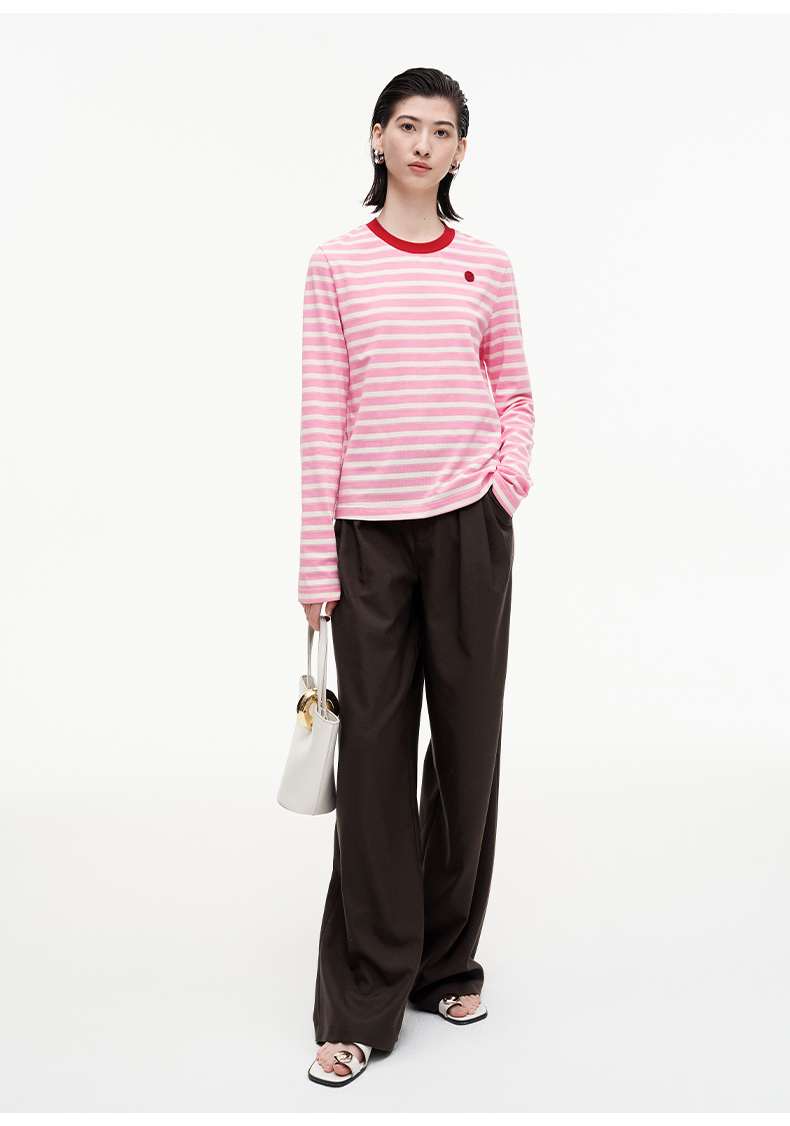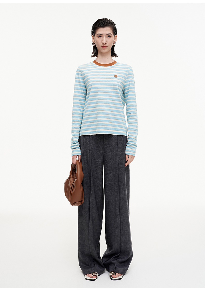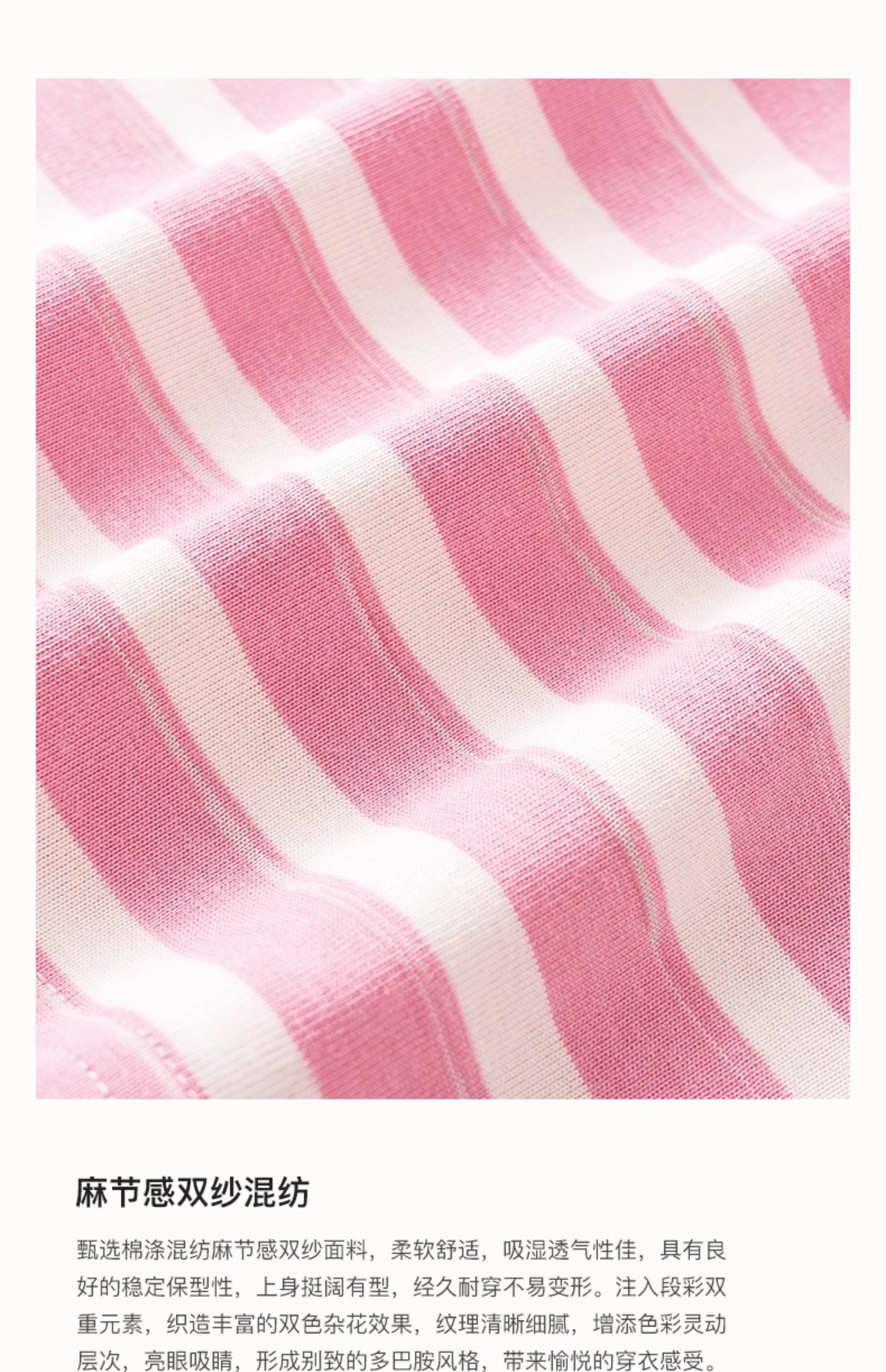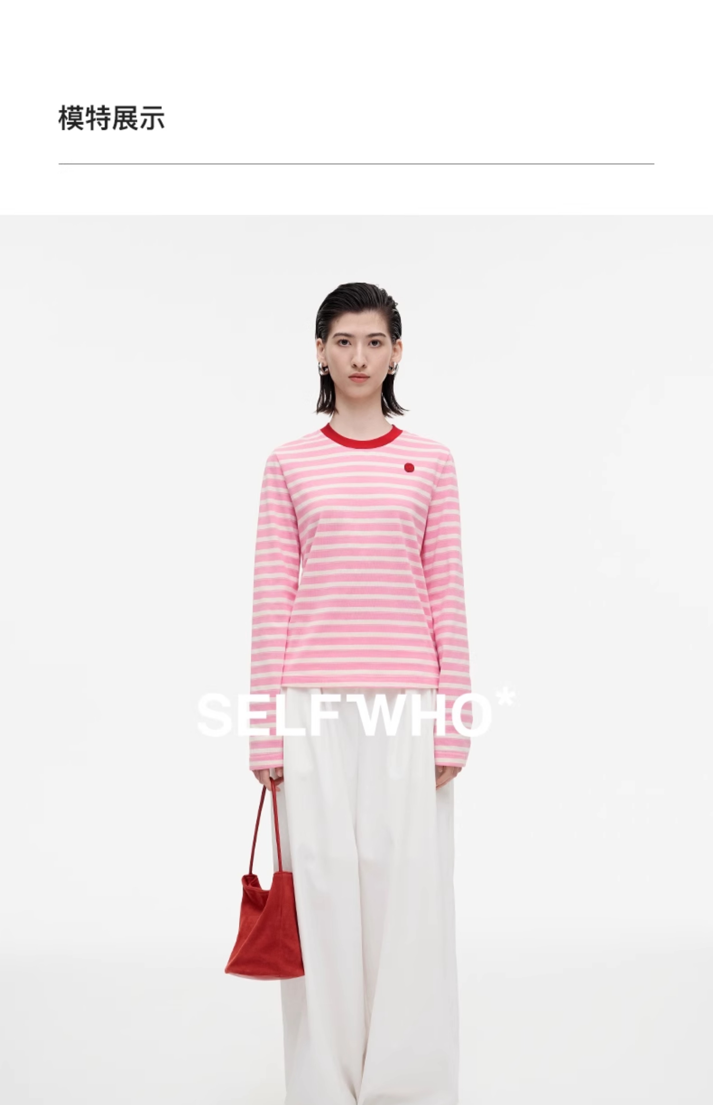 SELFWHO笑脸衣橱麻节感双纱混纺撞色条纹长袖t恤女2025秋新款上衣