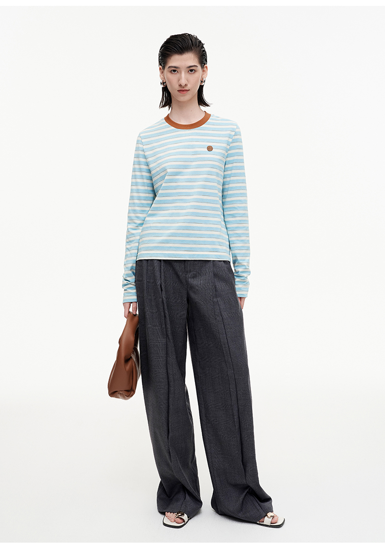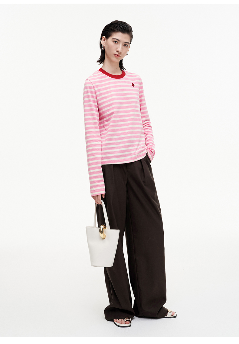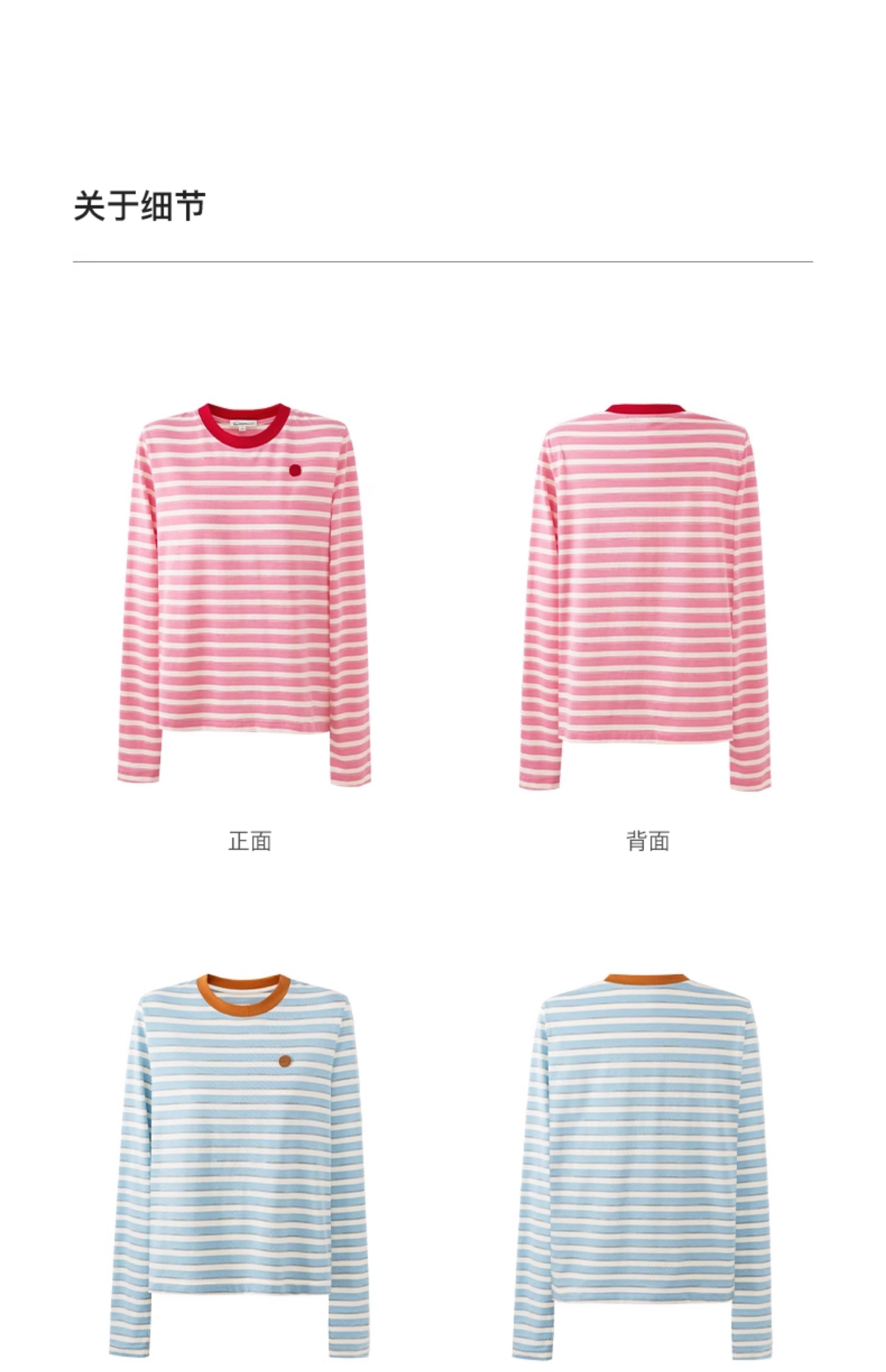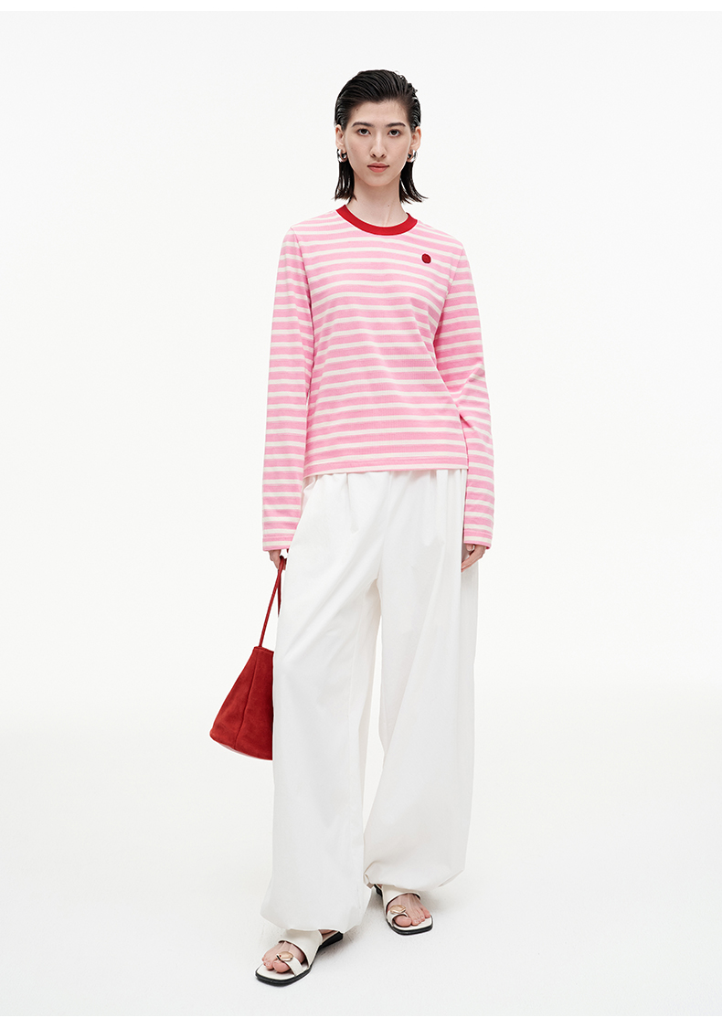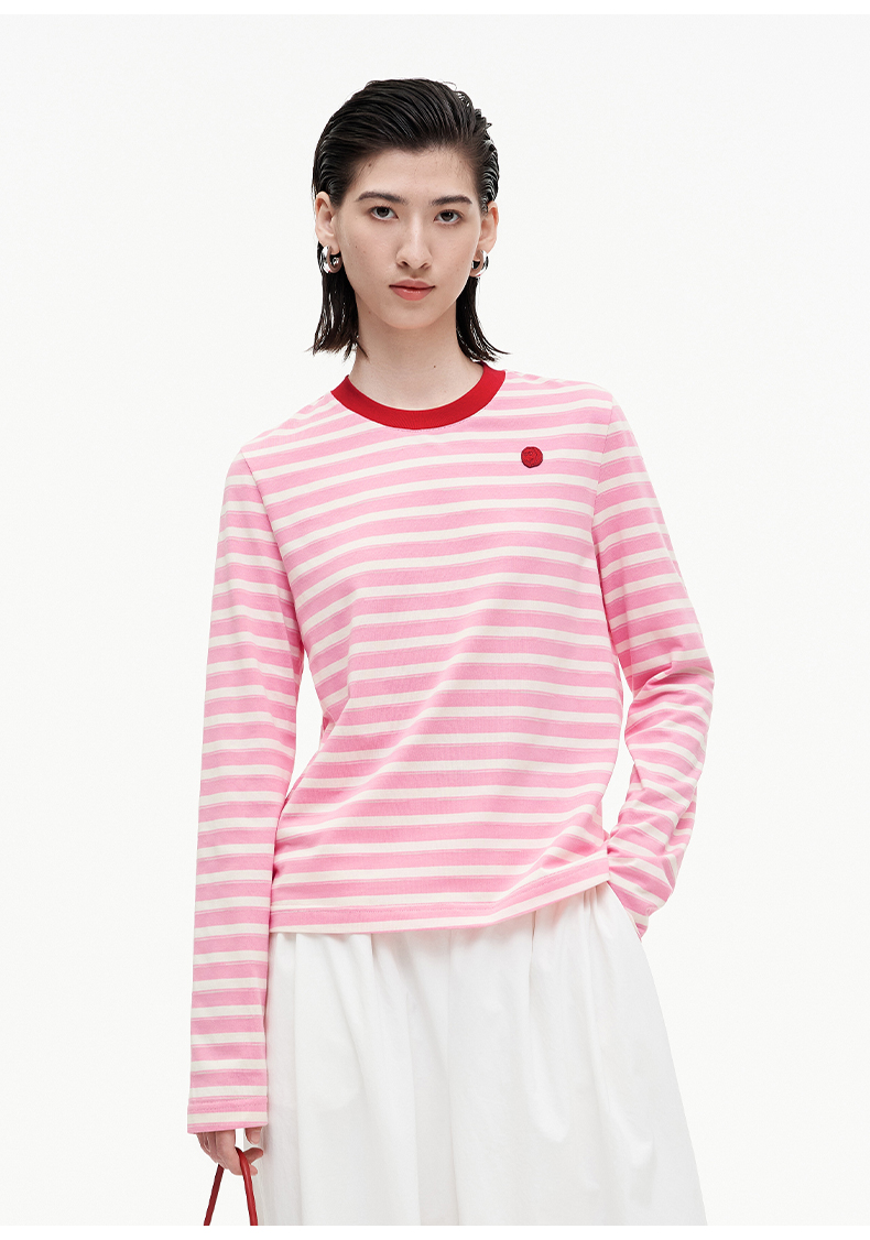 SELFWHO笑脸衣橱麻节感双纱混纺撞色条纹长袖t恤女2025秋新款上衣