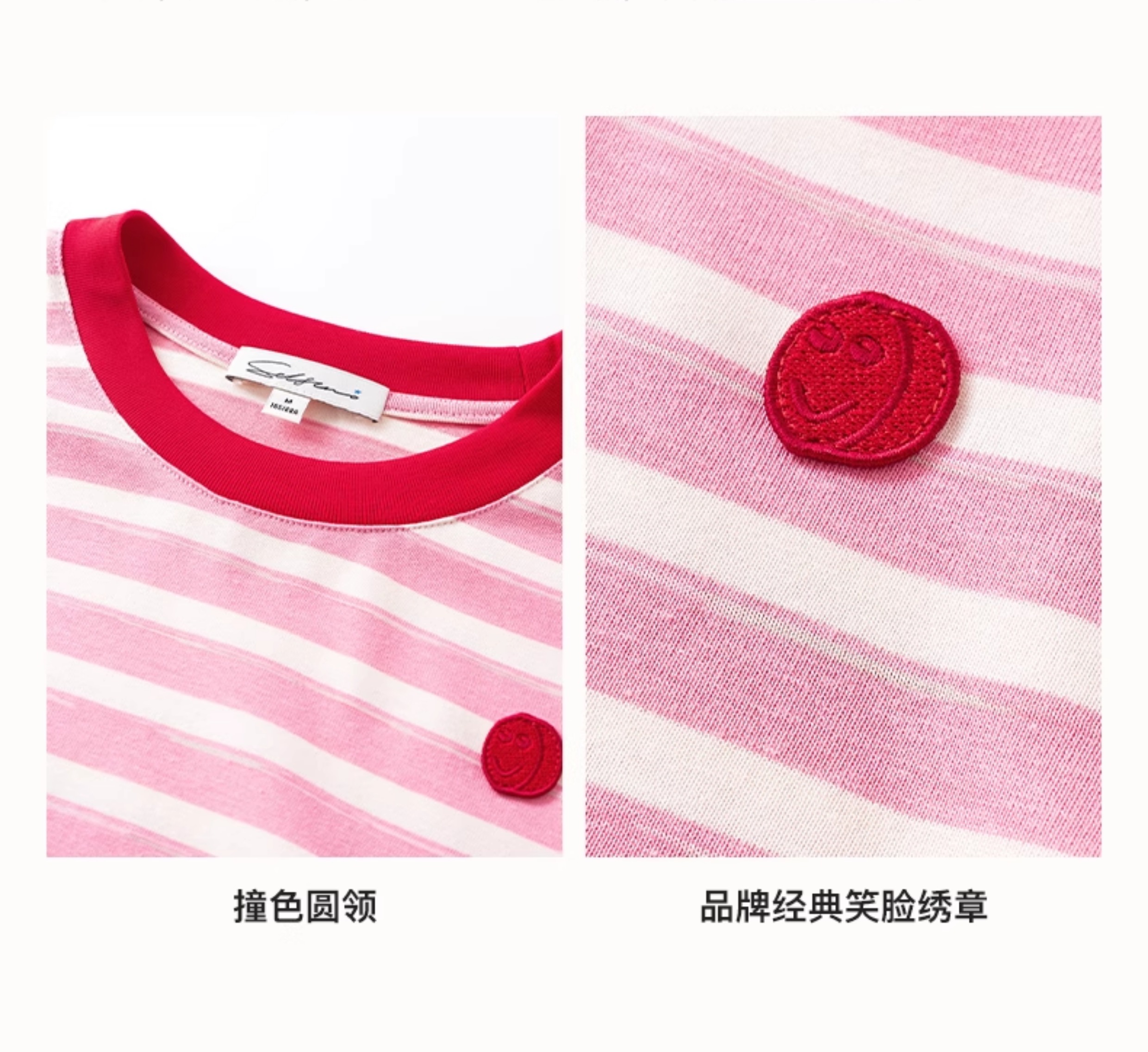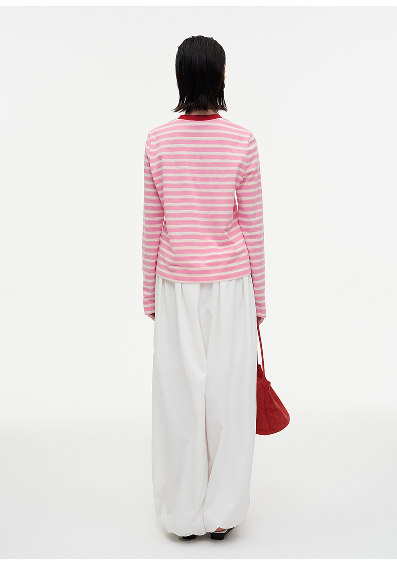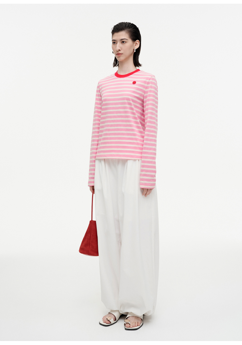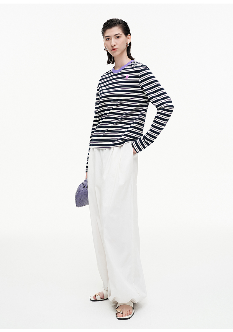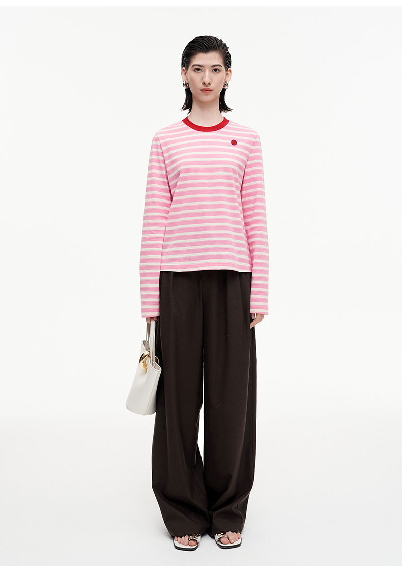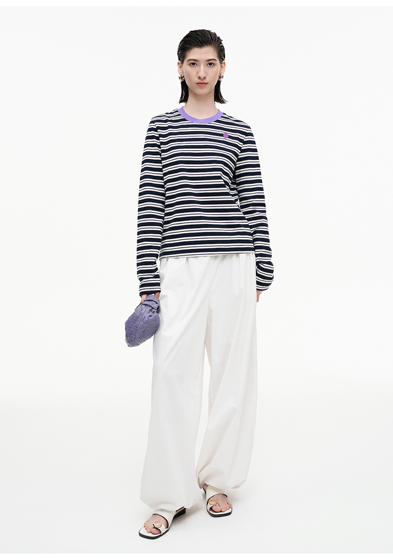 SELFWHO笑脸衣橱麻节感双纱混纺撞色条纹长袖t恤女2025秋新款上衣