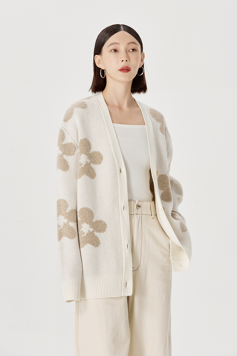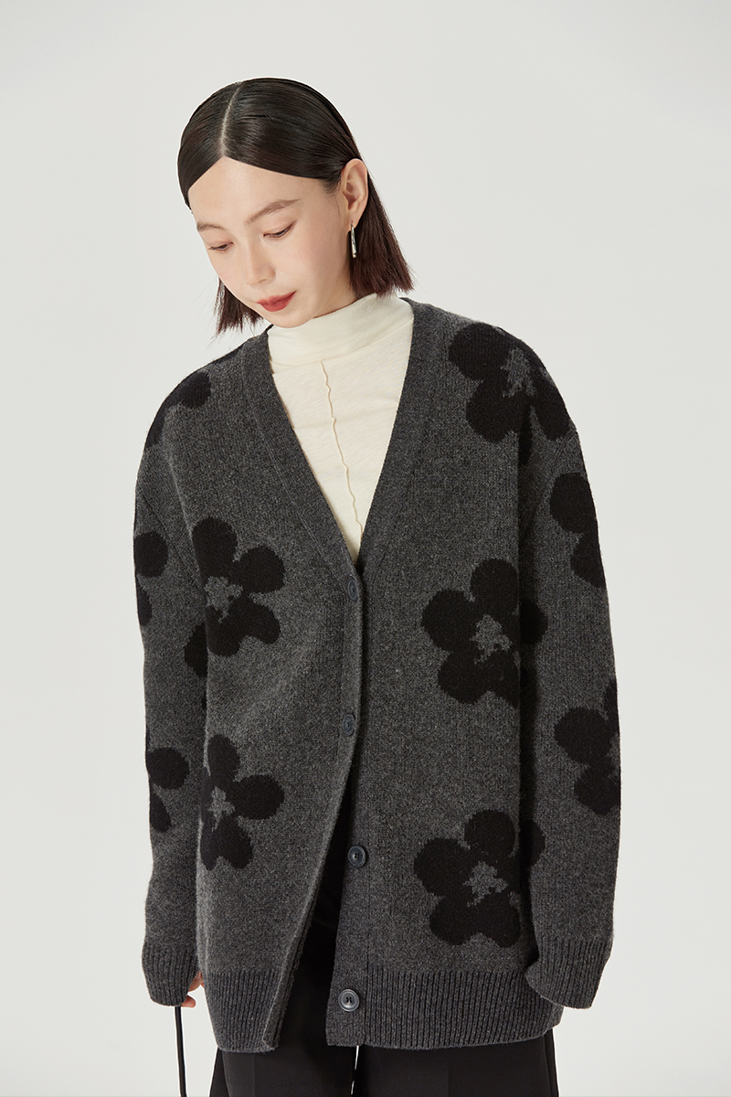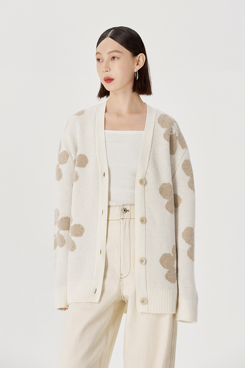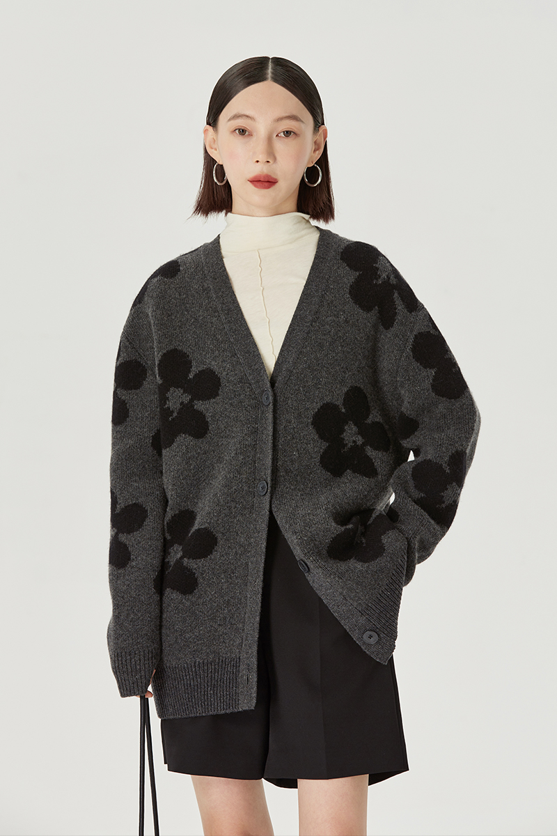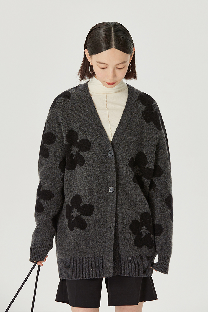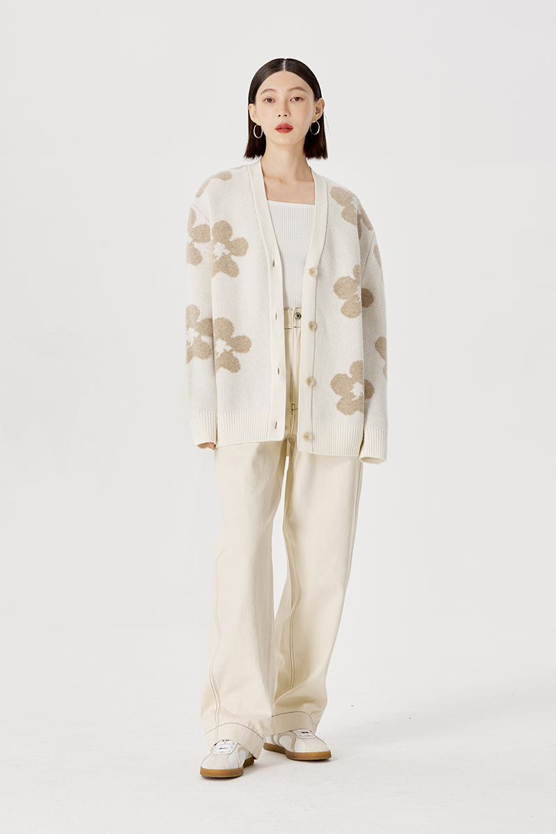 ForPoem 现货 22/FW花朵100羊毛针织开衫女秋季慵懒风外搭V领毛衣外套