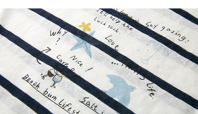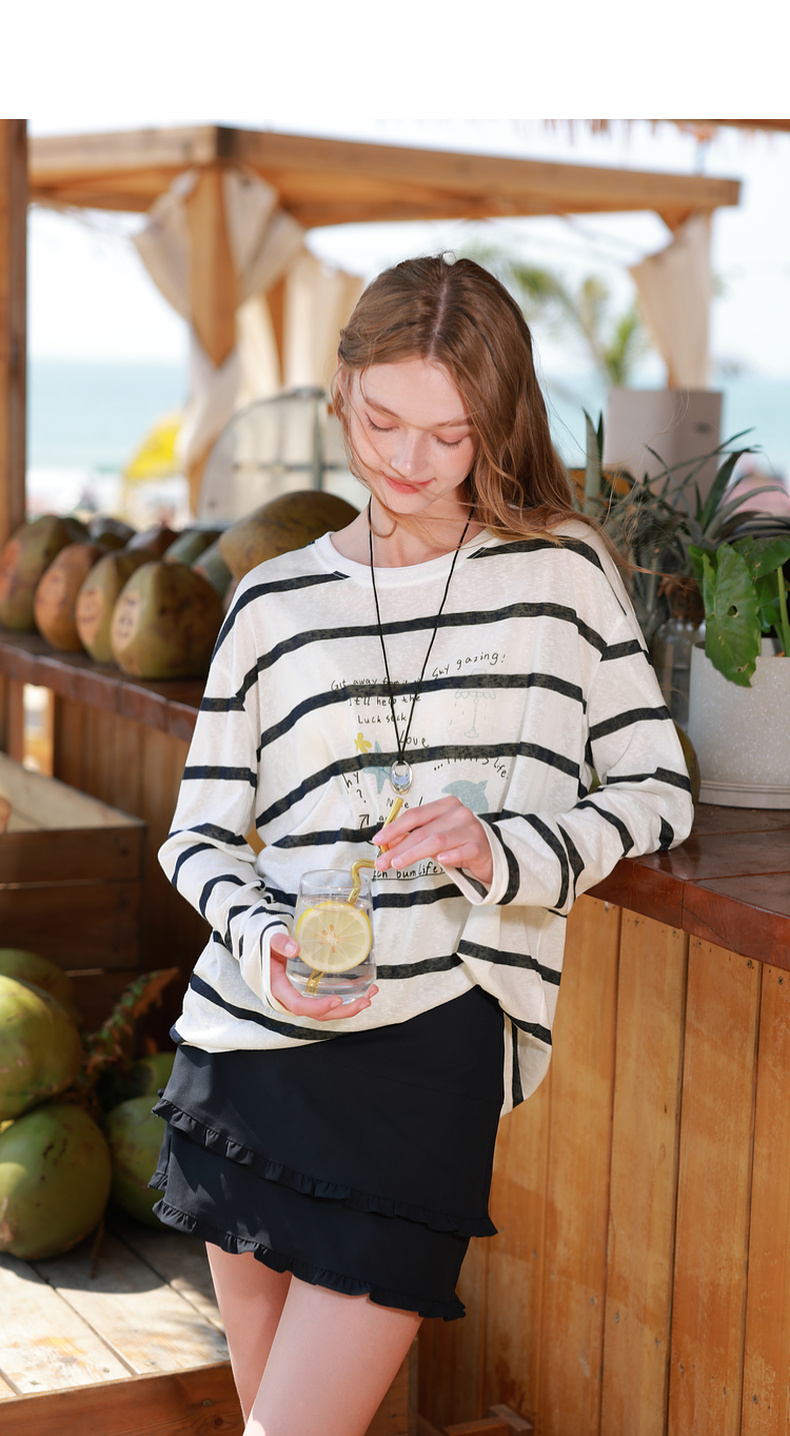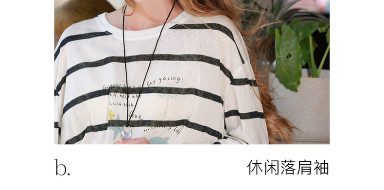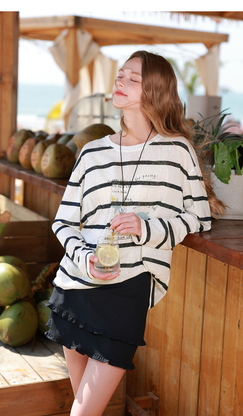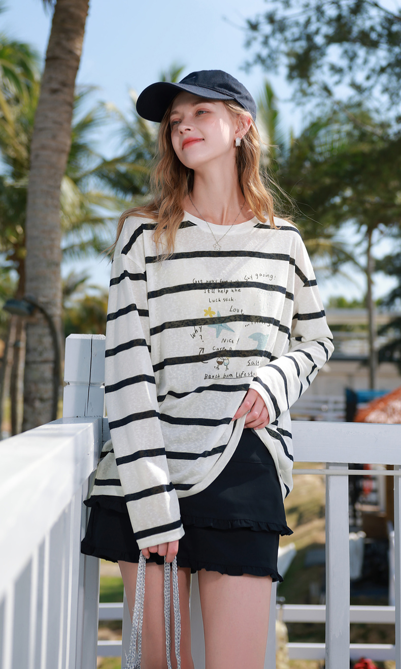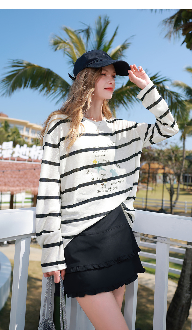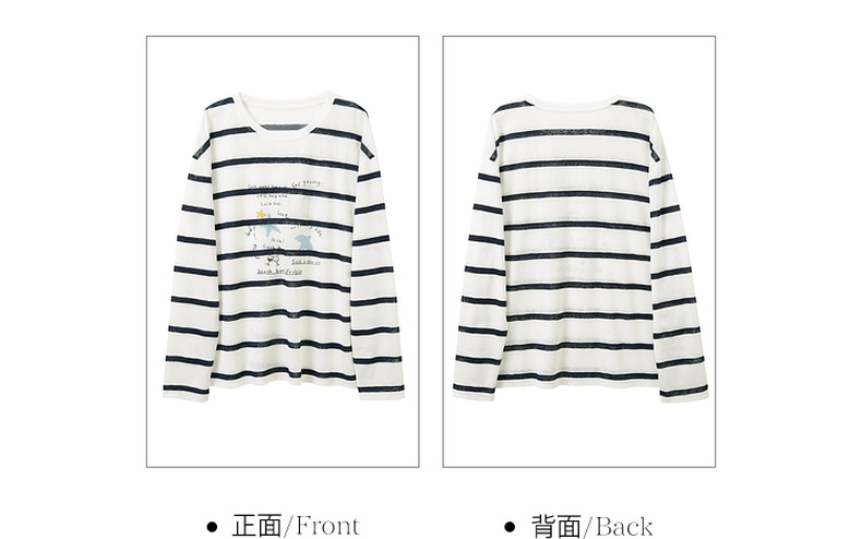 【莱赛尔】三彩2026春季新款字母印花条纹T恤宽松圆领长袖罩衫M