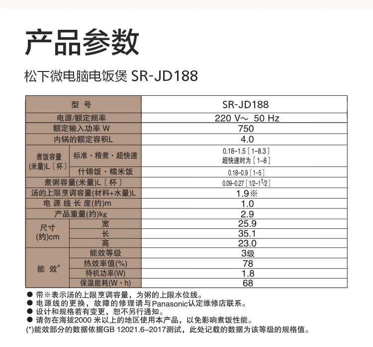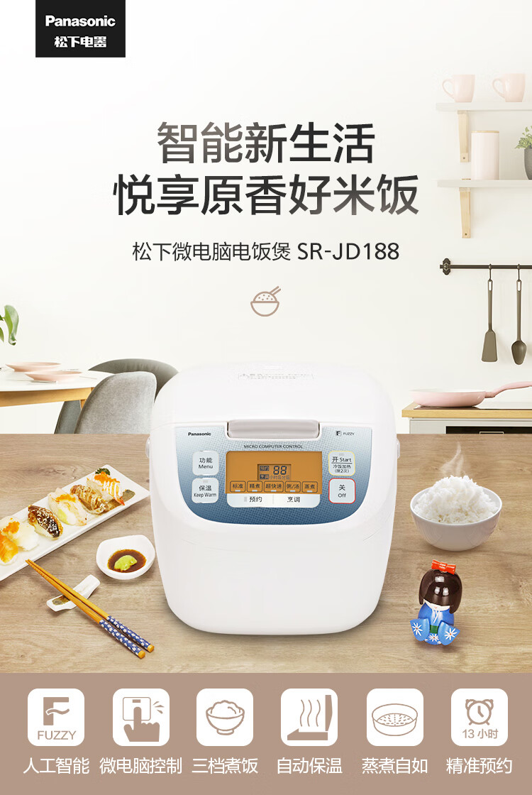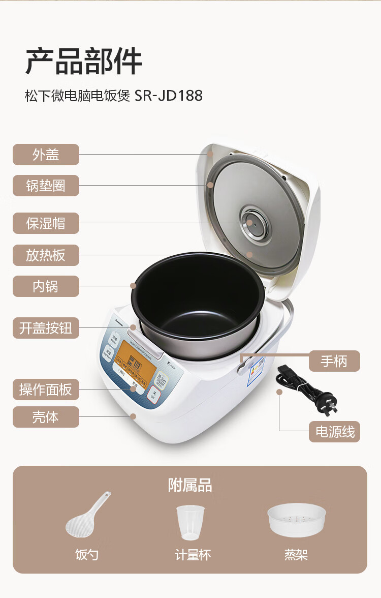 松下(Panasonic)4L 电饭煲 2-6人 家用智能电饭煲 全自动预约多功能大容量电饭锅 SR-JD188