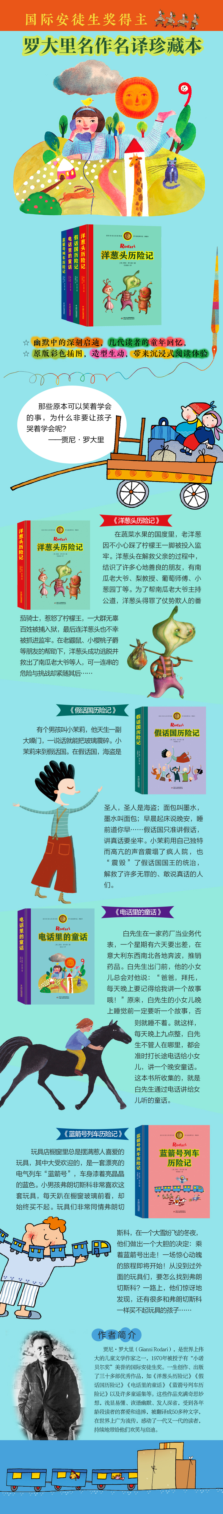 贾尼·罗大里(Gianni Rodari),是世界上伟大的儿童文学作家之一,1970年被授予有“小诺贝尔奖”美誉的国际安徒生奖。一生创作、出版了三十多部优秀作品,如《洋葱头历险记》《假话国历险记》《电话里的童话》《蓝箭》以及许多童谣集等。这些作品充满奇思妙想,浅显易懂、诙谐幽默、发人深省,受到各年龄段读者的喜爱和追捧,被翻译成50多种文字,在世界上广为流传,感动了一代又一代的读者,持续地带给他们欢笑与启迪。