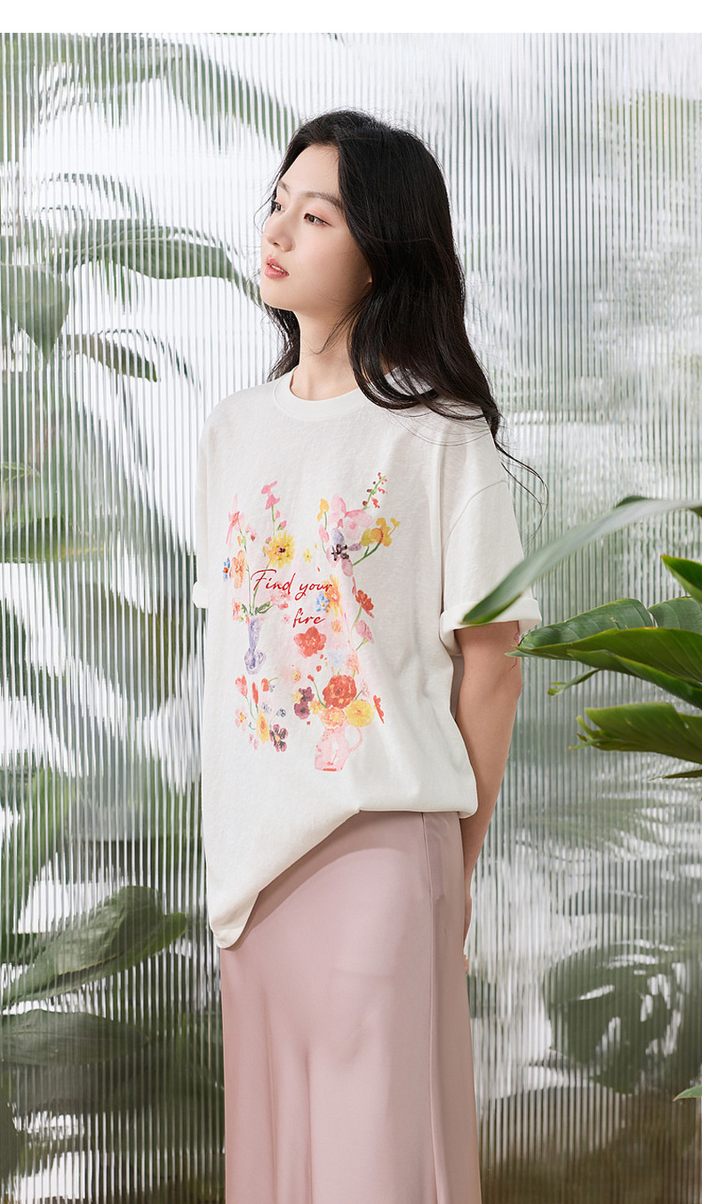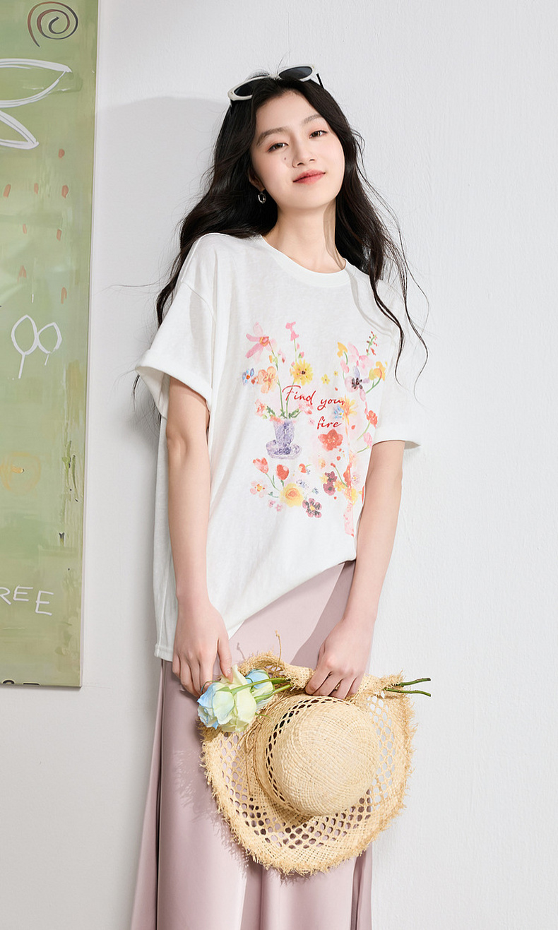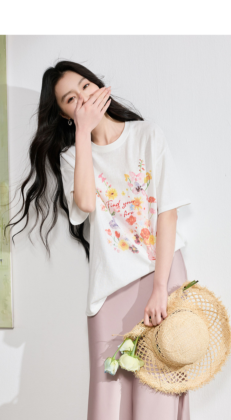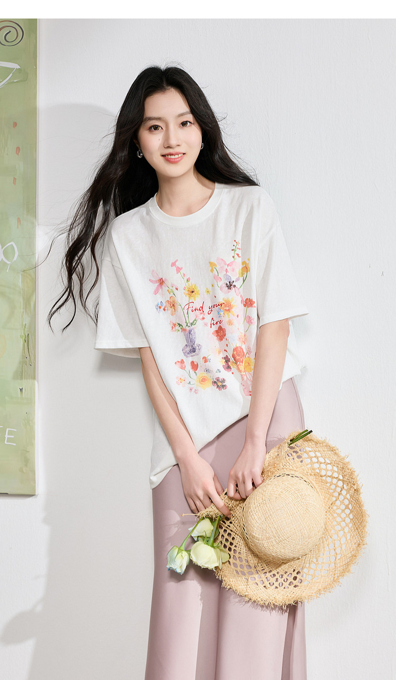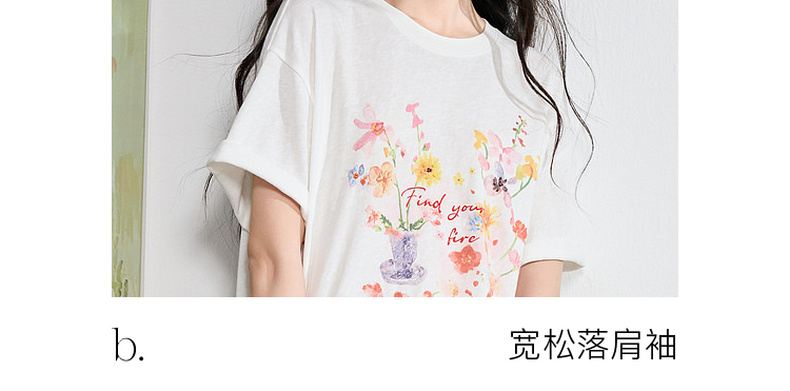 三彩2026夏季新款圆领印花T恤落肩袖宽松上衣套头休闲S