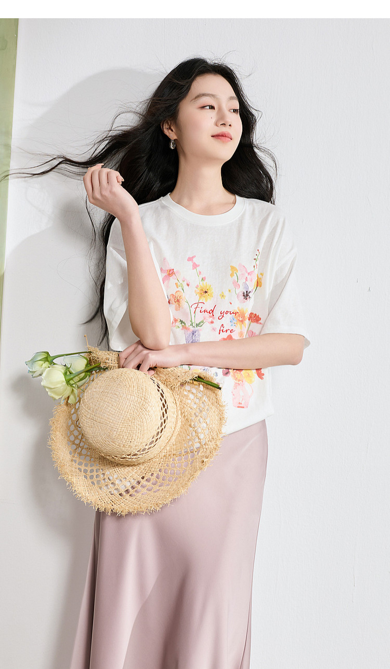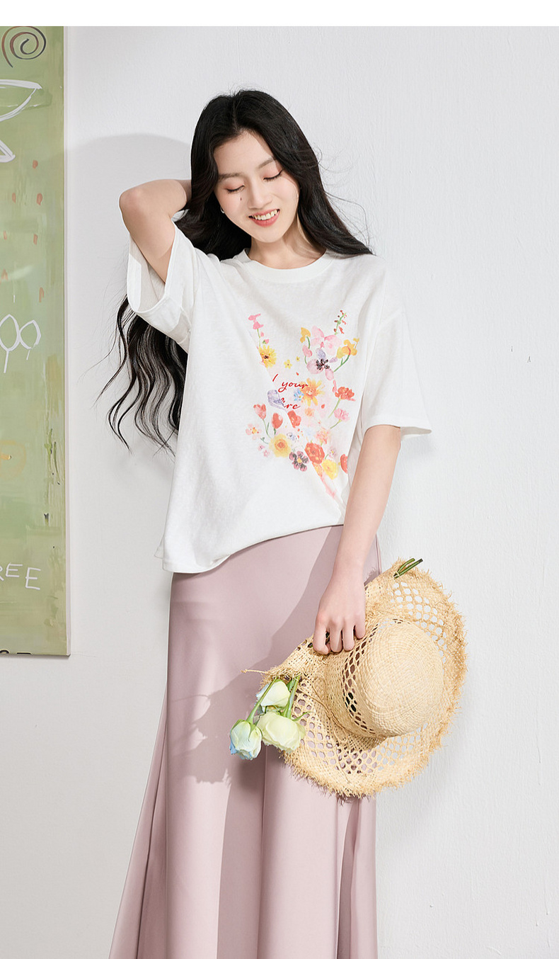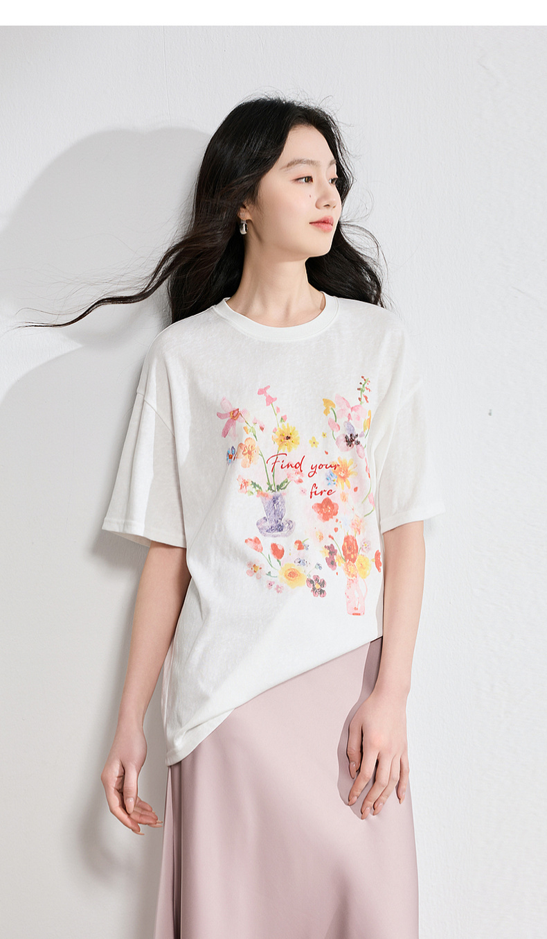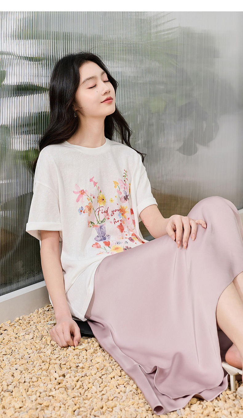 三彩2026夏季新款圆领印花T恤落肩袖宽松上衣套头休闲S