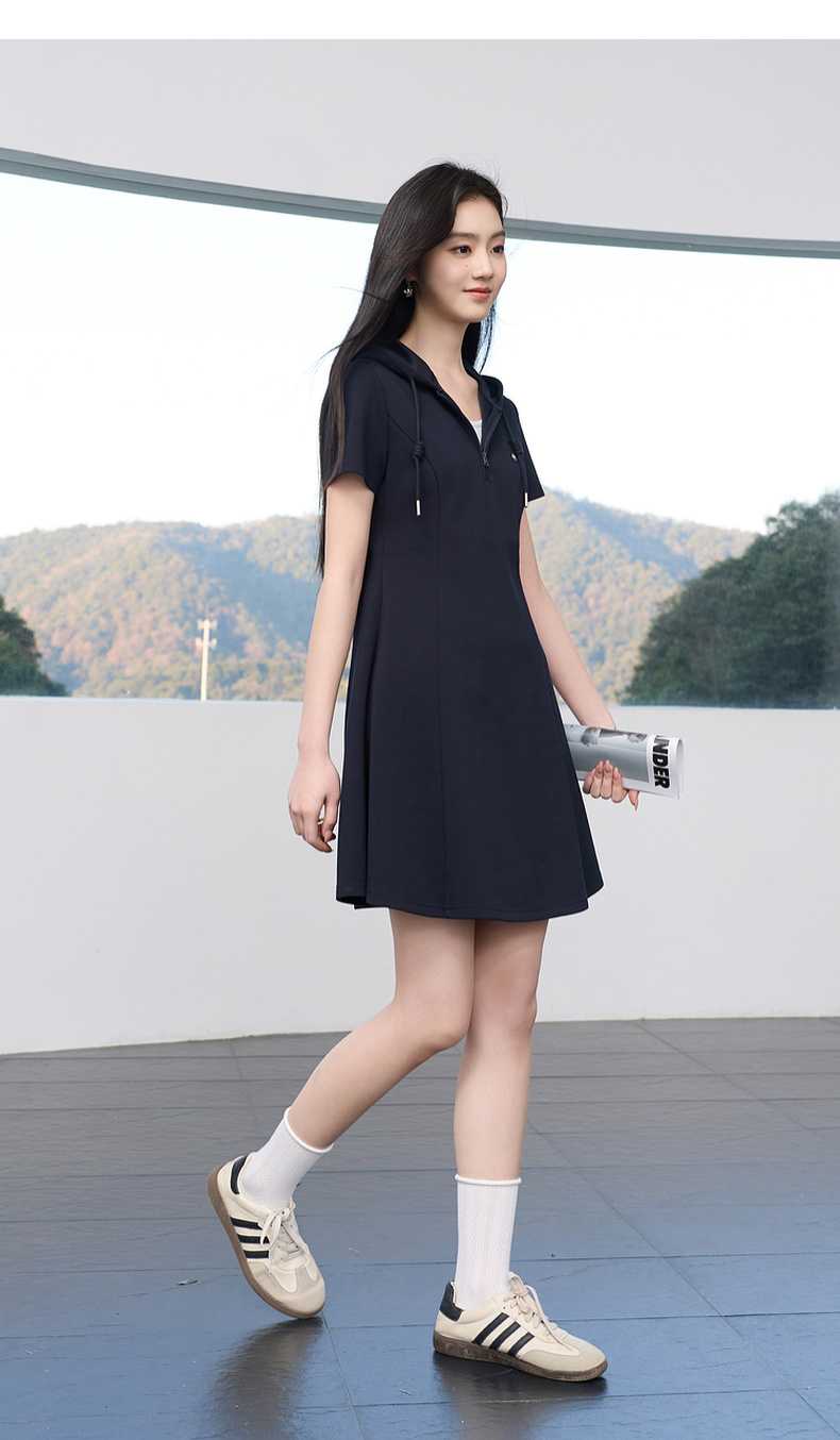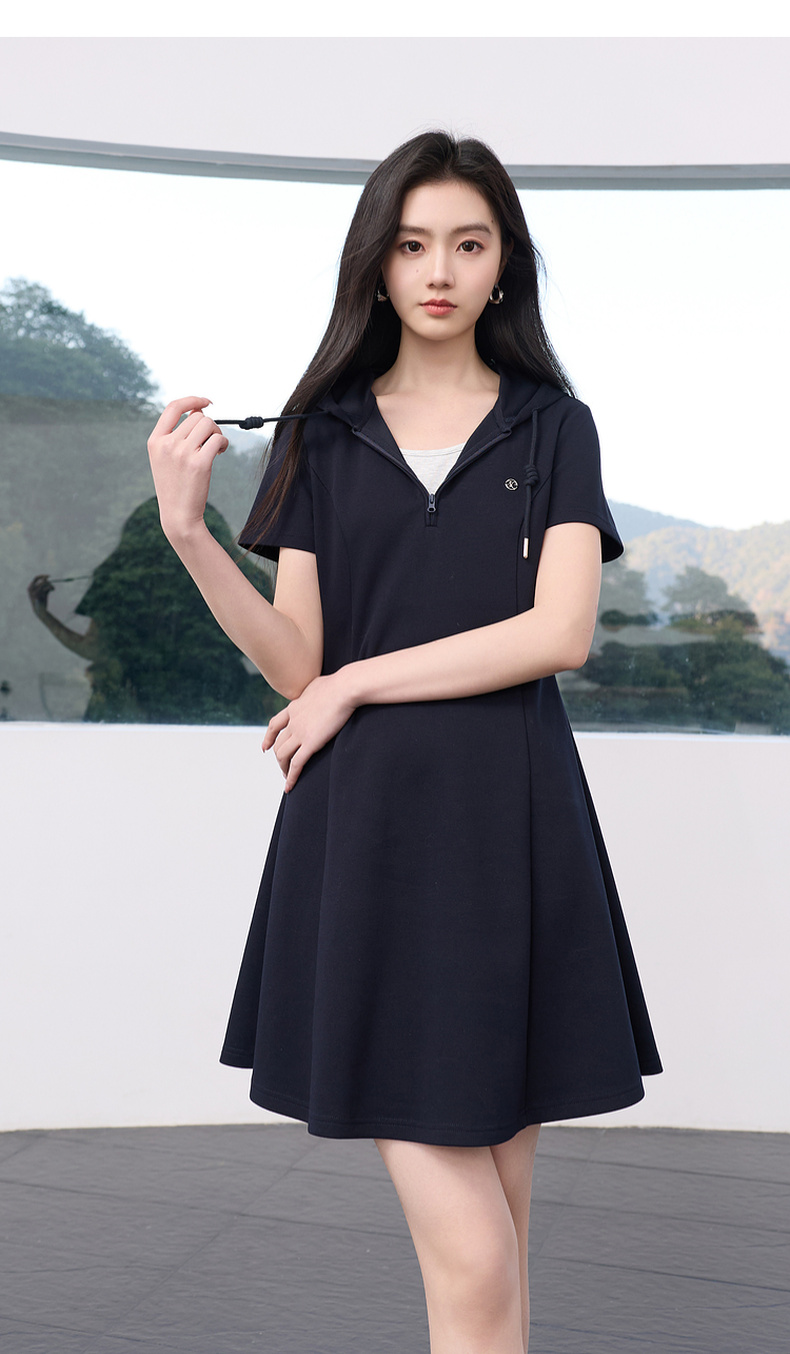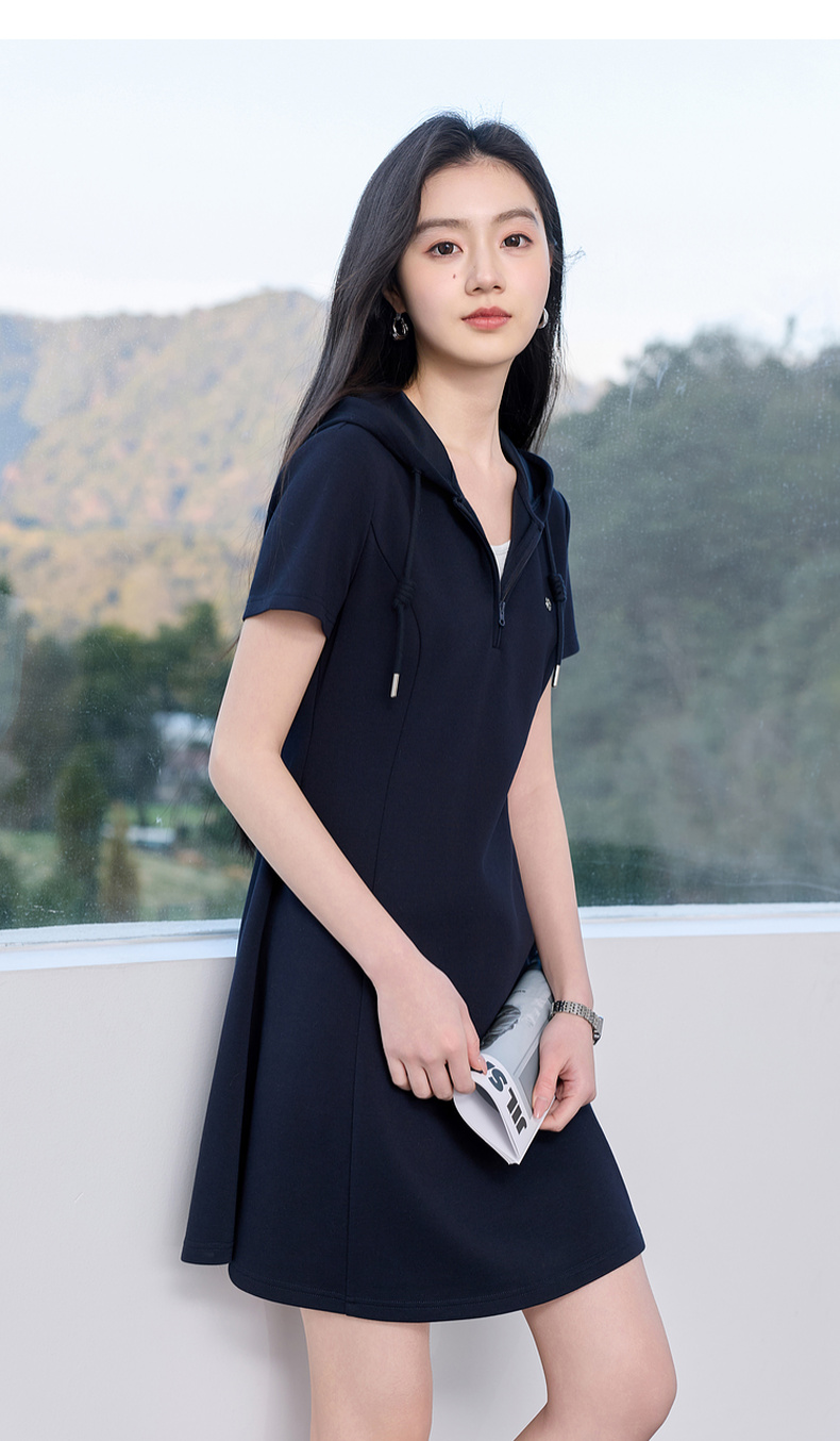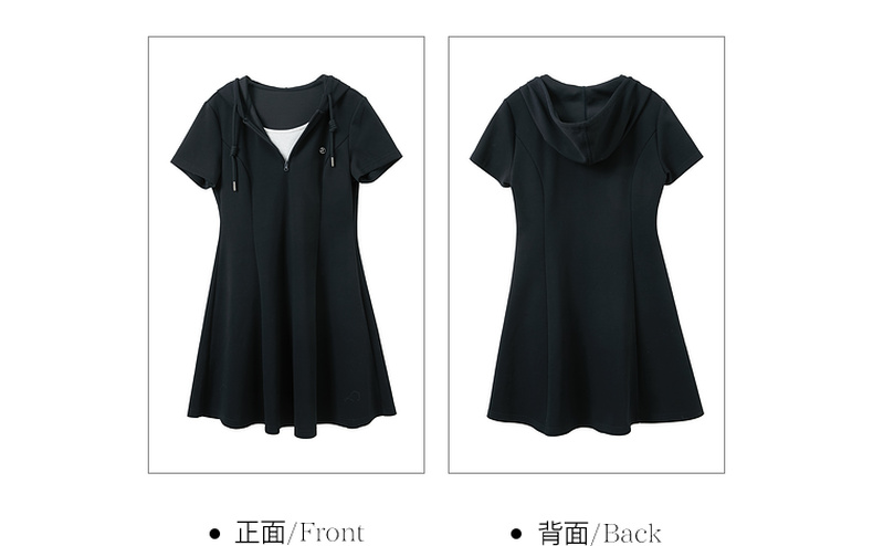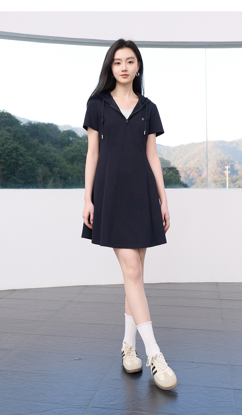 三彩2026春季新款假两件连帽连衣裙A字裙休闲短袖收腰短裙S