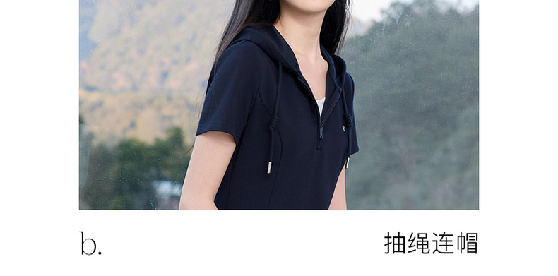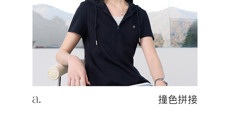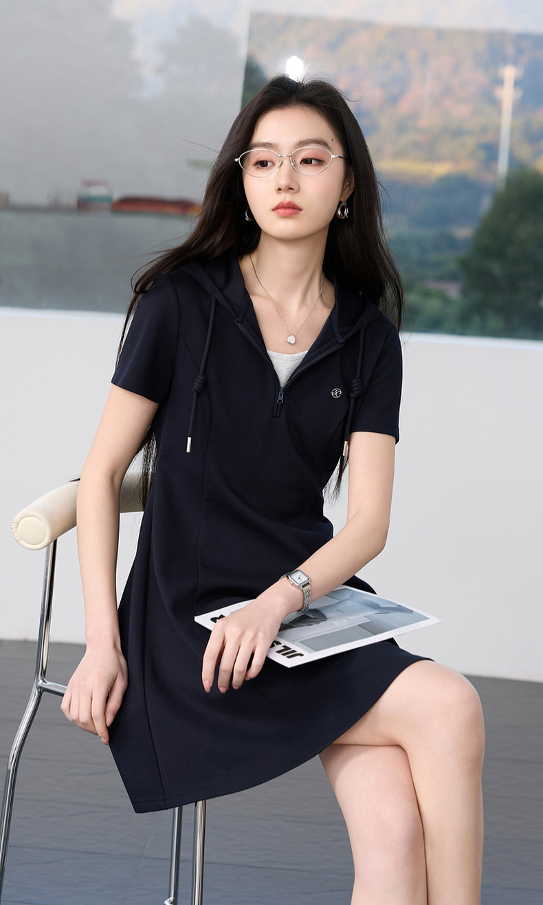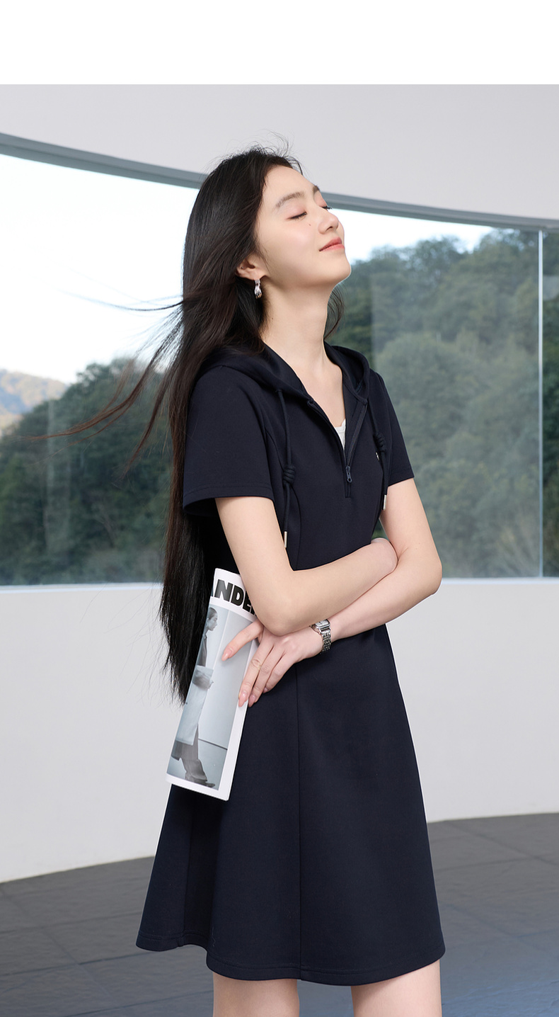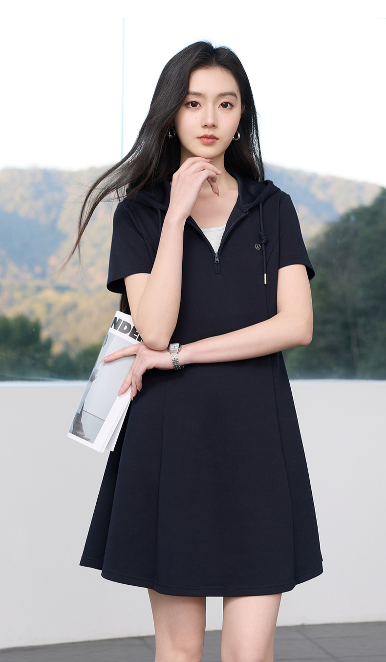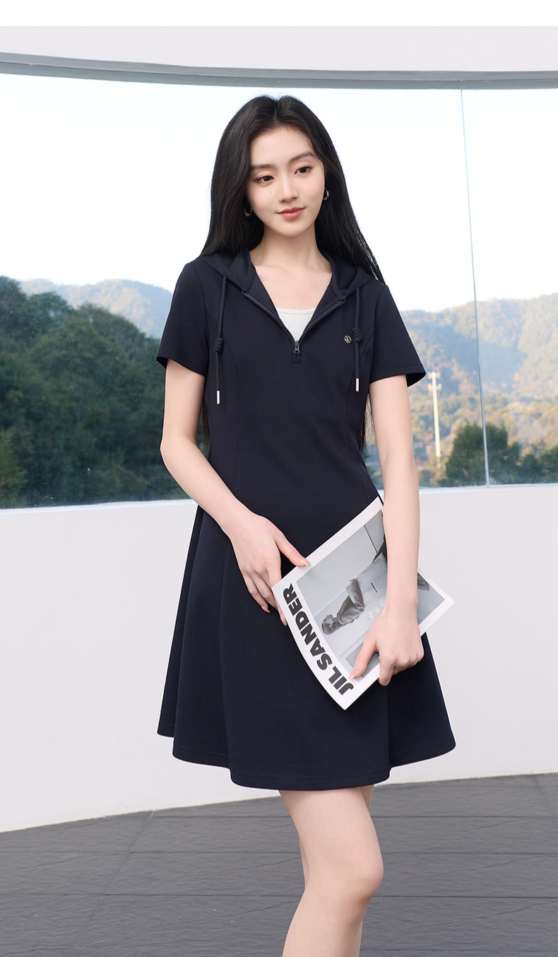三彩2026春季新款假两件连帽连衣裙A字裙休闲短袖收腰短裙S